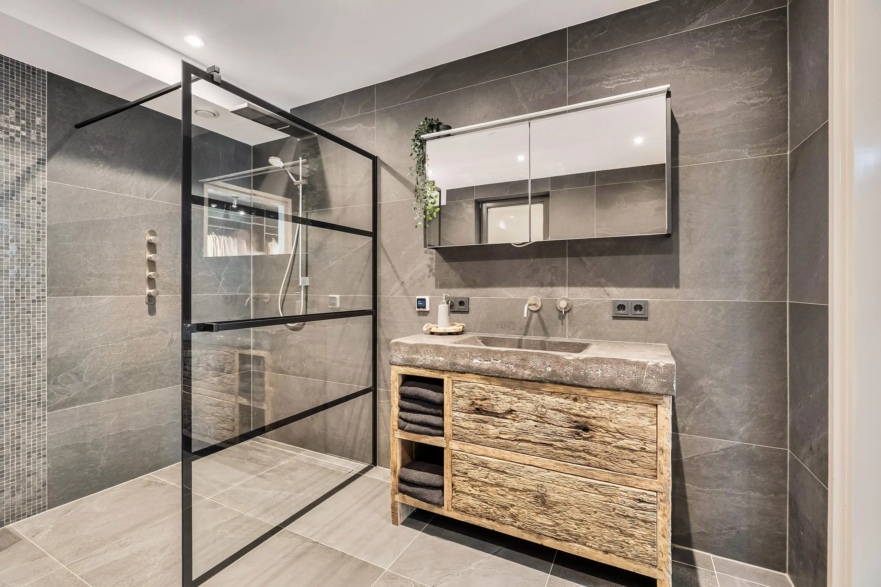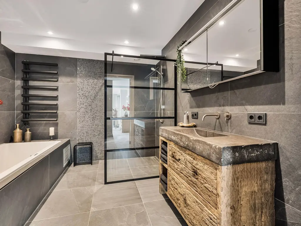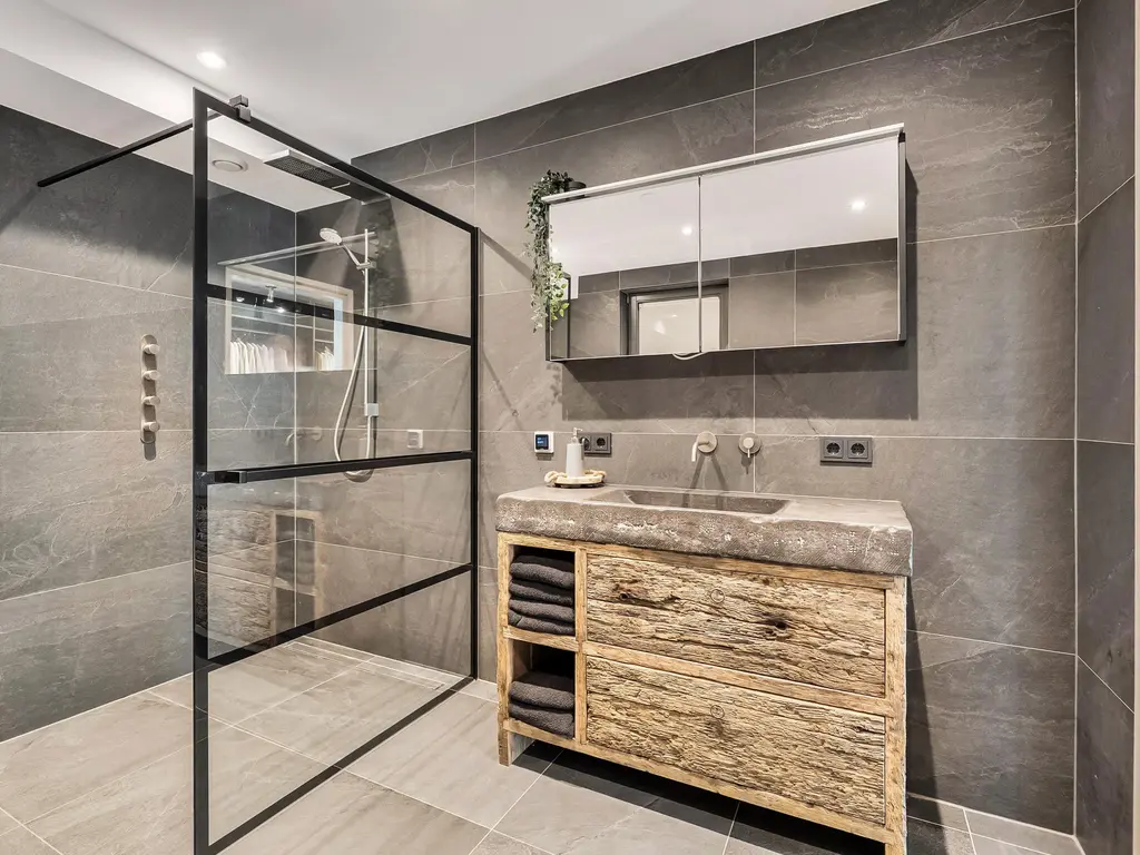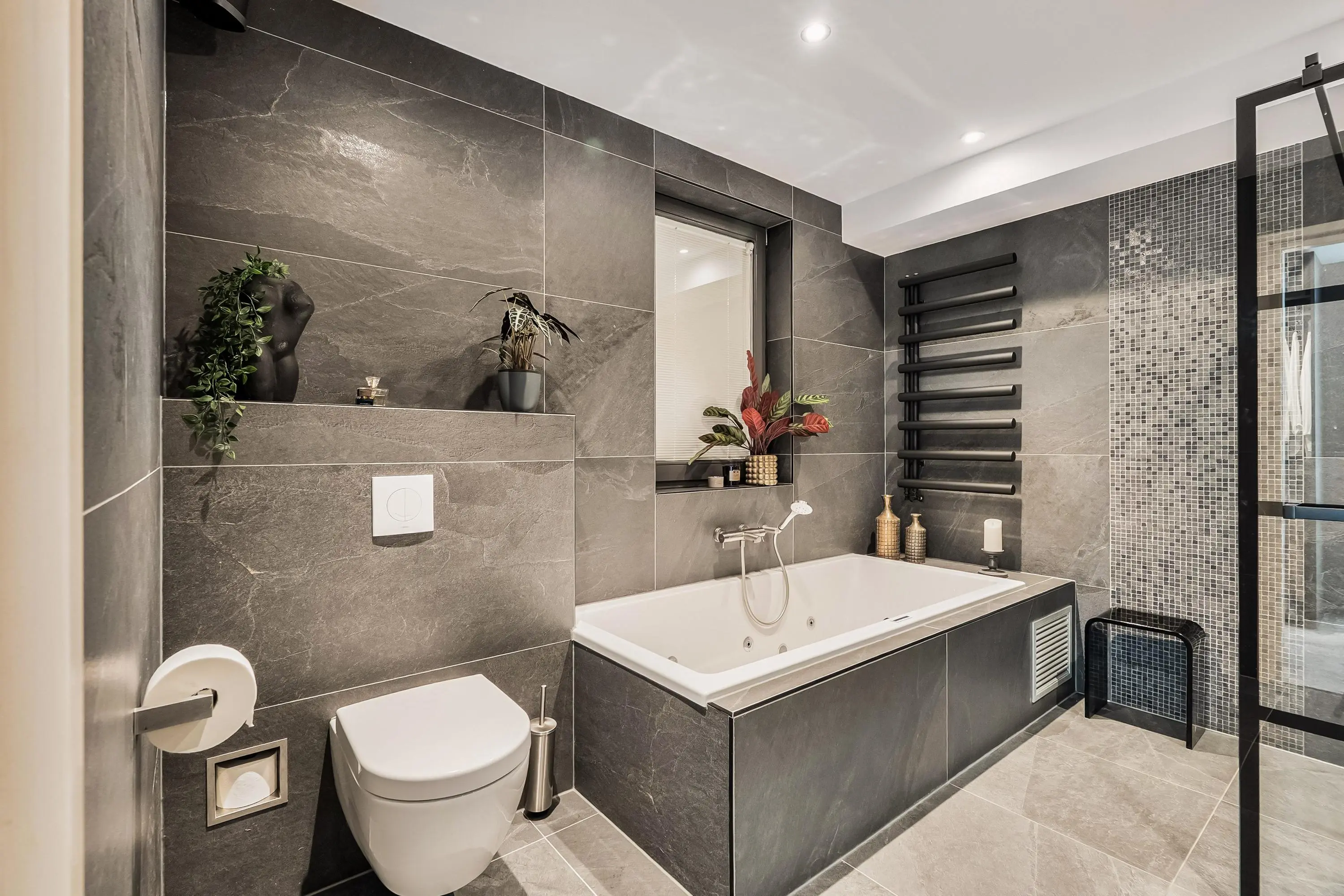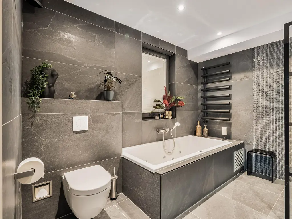 Aangrenzende badkamer (ca. 10 m2) met luxe sanitaire voorzieningen zoals wastafel met wastafelmeubel, spiegel met spiegelkast en verlichting, hangend toilet, designradiator, whirlpool met verlichting en massagejets, en een inloopdouche met regendouche. De badkamer is verder geheel betegeld en afgewerkt met spotjes, tegelvloer met vloerverwarming en geluidsinstallatie.