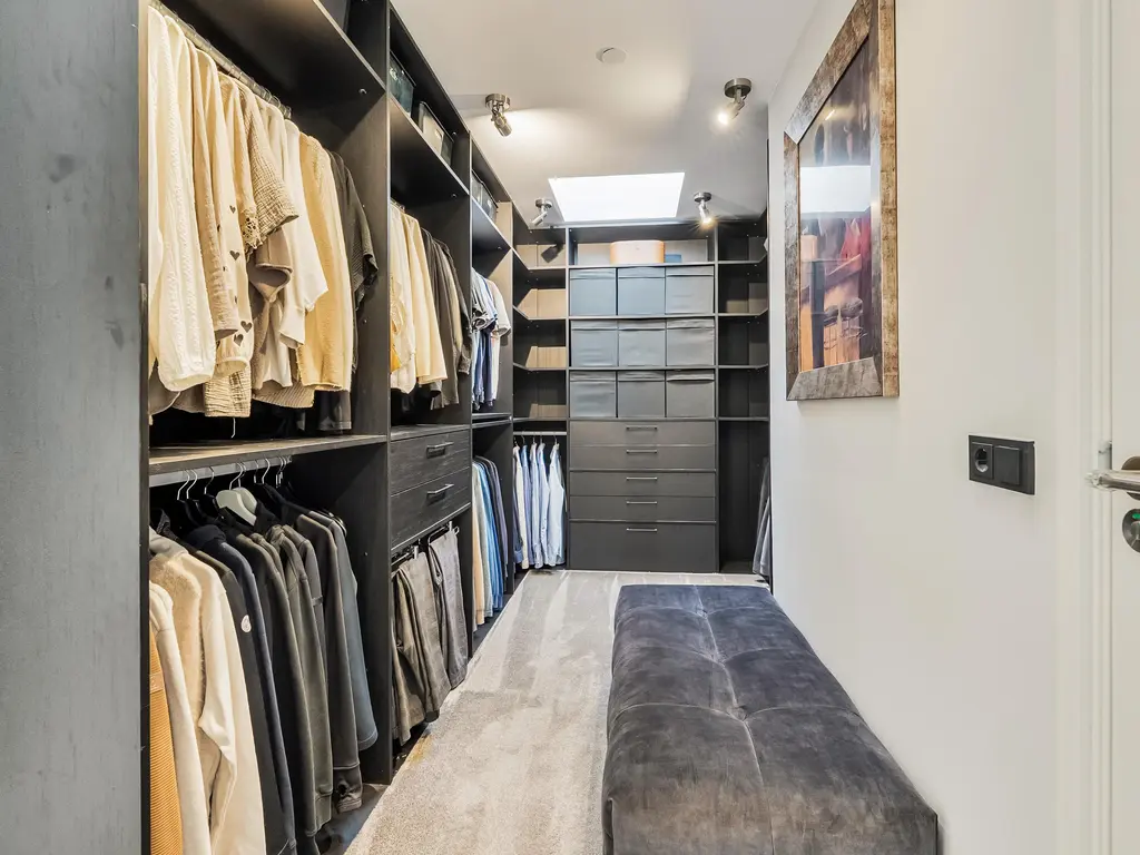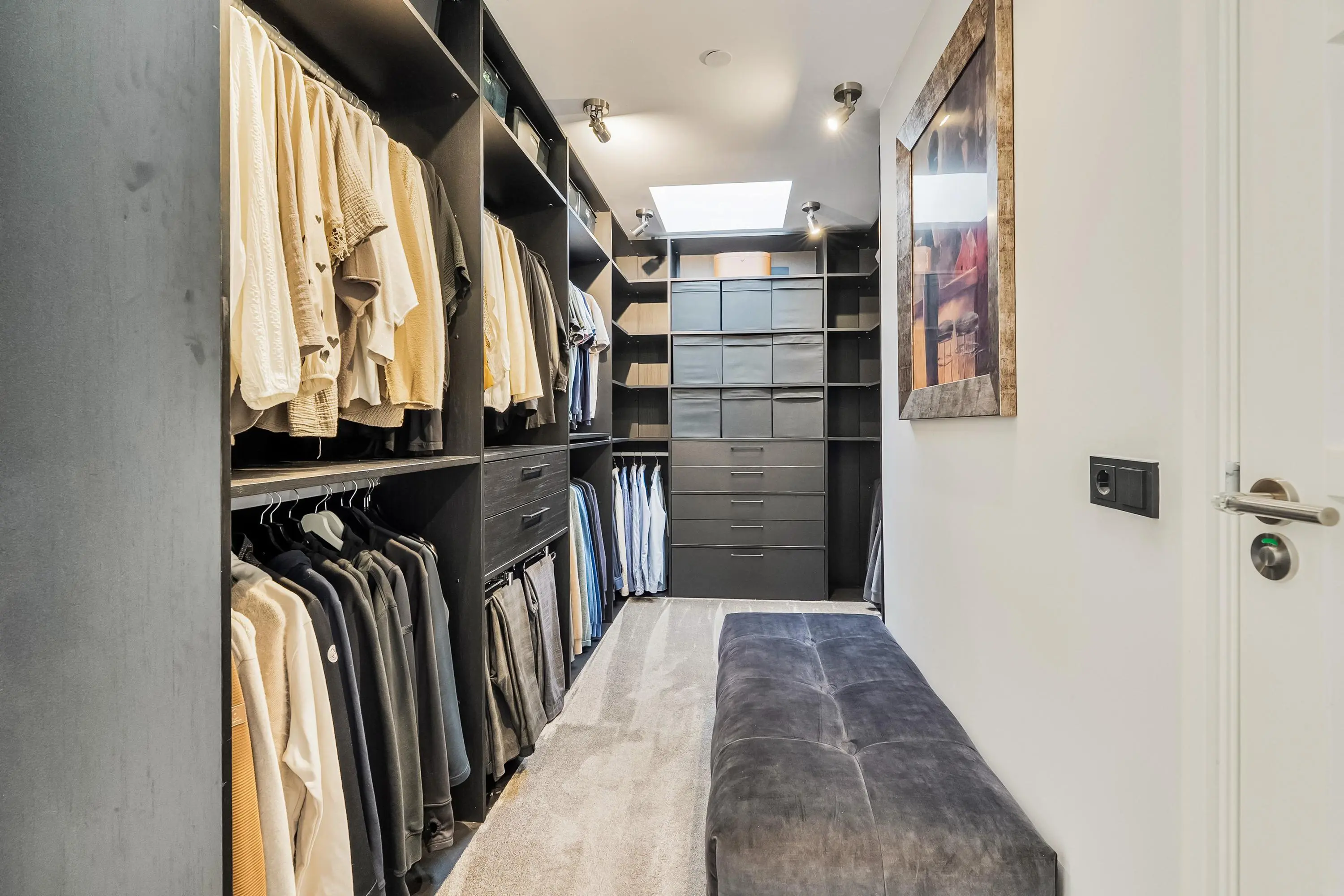 De inloopkast (ca. 26 m2) is de perfecte plek waar u al uw schoenen, accessoires en kleding stijlvol en overzichtelijk kunt opbergen. De inloopkast beschikt over een handig koepelraam. Kledingkleuren zijn beter zichtbaar in natuurlijk licht.