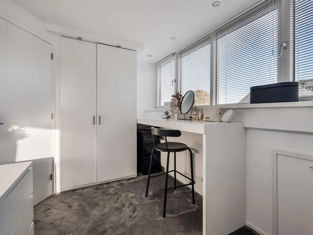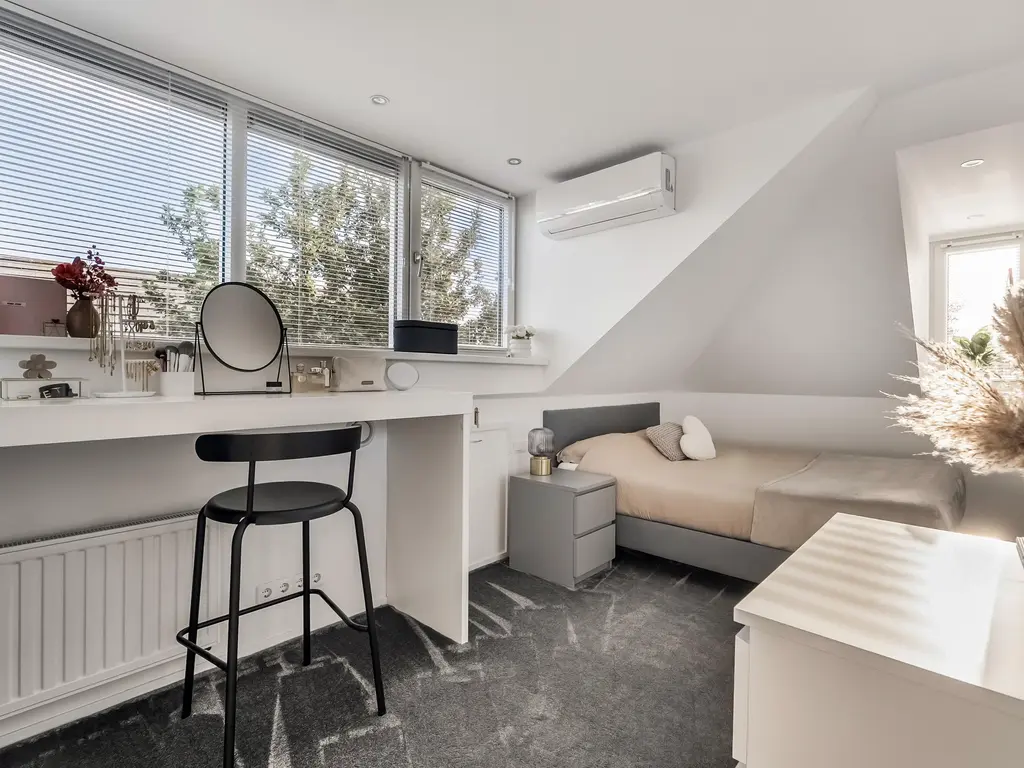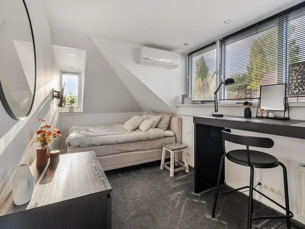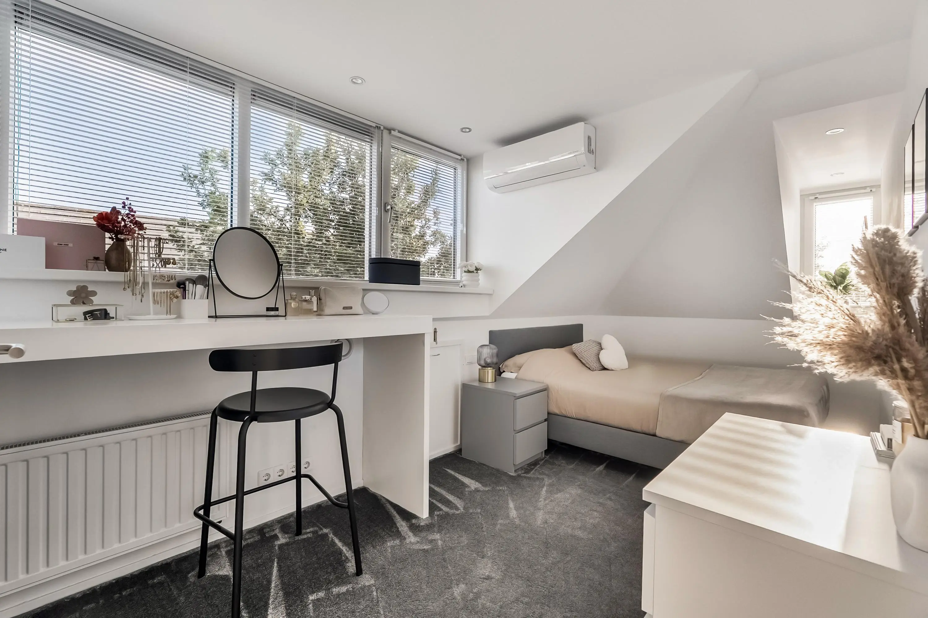 Slaapkamer 4 (ca. 9 m2) is gelegen aan de achterzijde van de woning en is voorzien van een 2-deuren vaste kast, bergruimte achter het knieschot, airconditioningsysteem, een kunststof dakkapel aan de zijkant van de woning en spotjes.