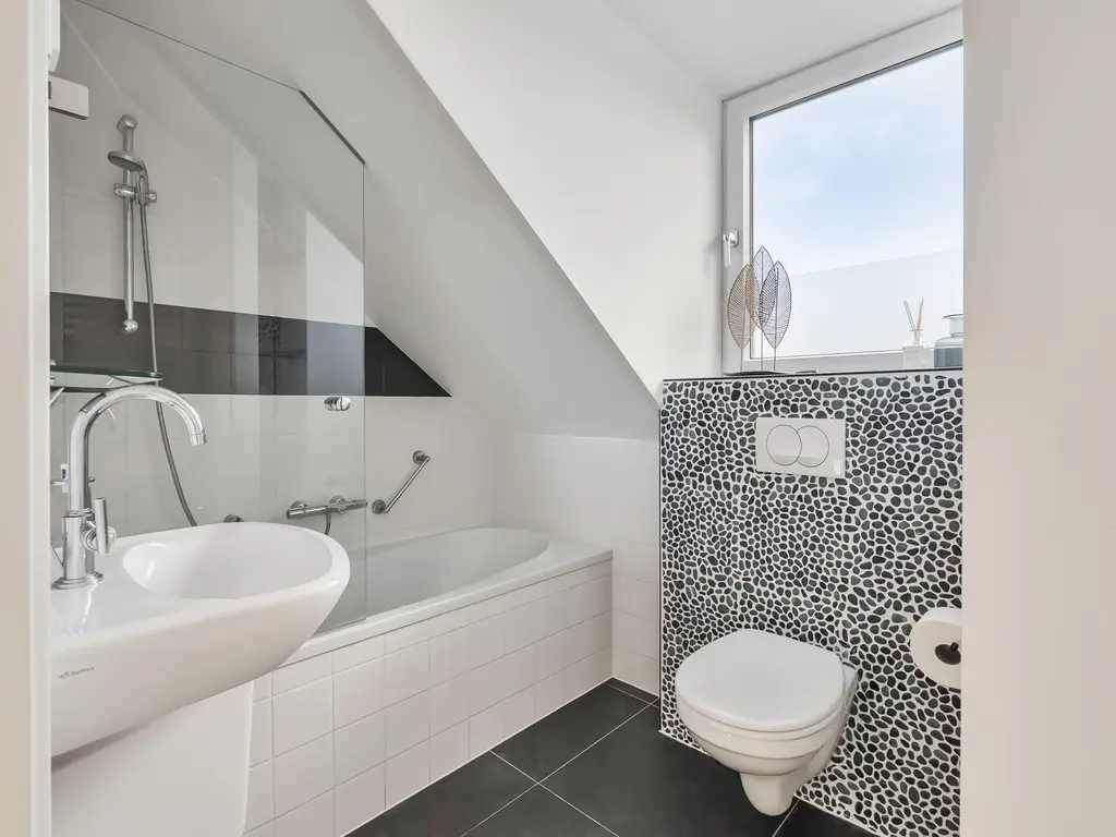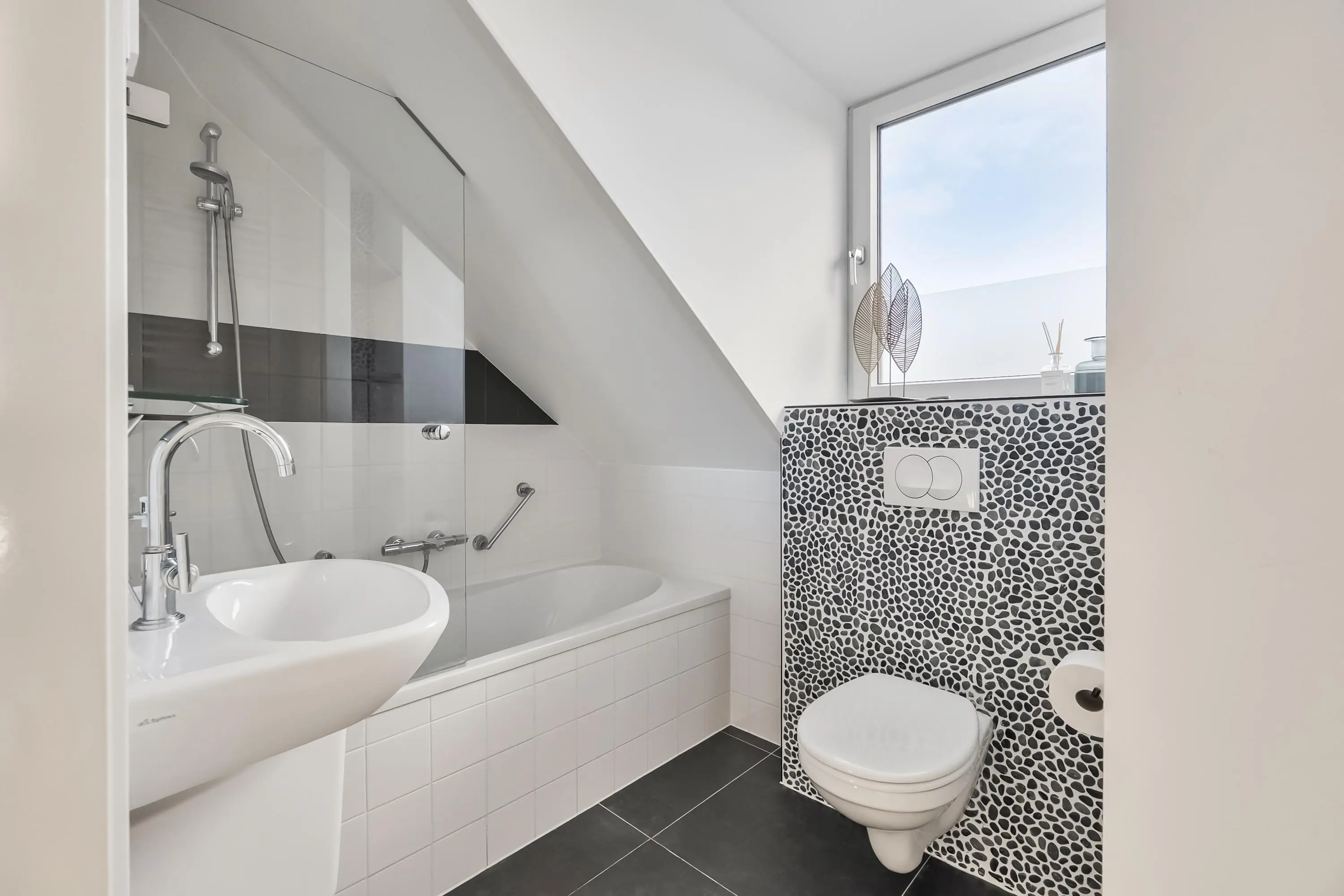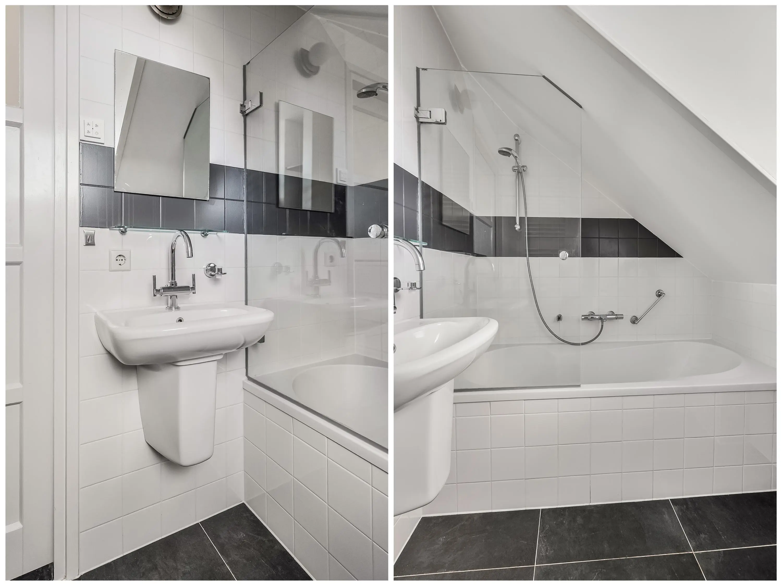 Moderne badkamer (ca. 3 m2) met sanitaire voorzieningen zoals een wastafel, spiegel, hangend toilet, ligbad met douchescherm en designradiator. Deze badkamer is geheel betegeld, afgewerkt met spotjes en beschikt over extra ruimte dankzij een kleine dakkapel.