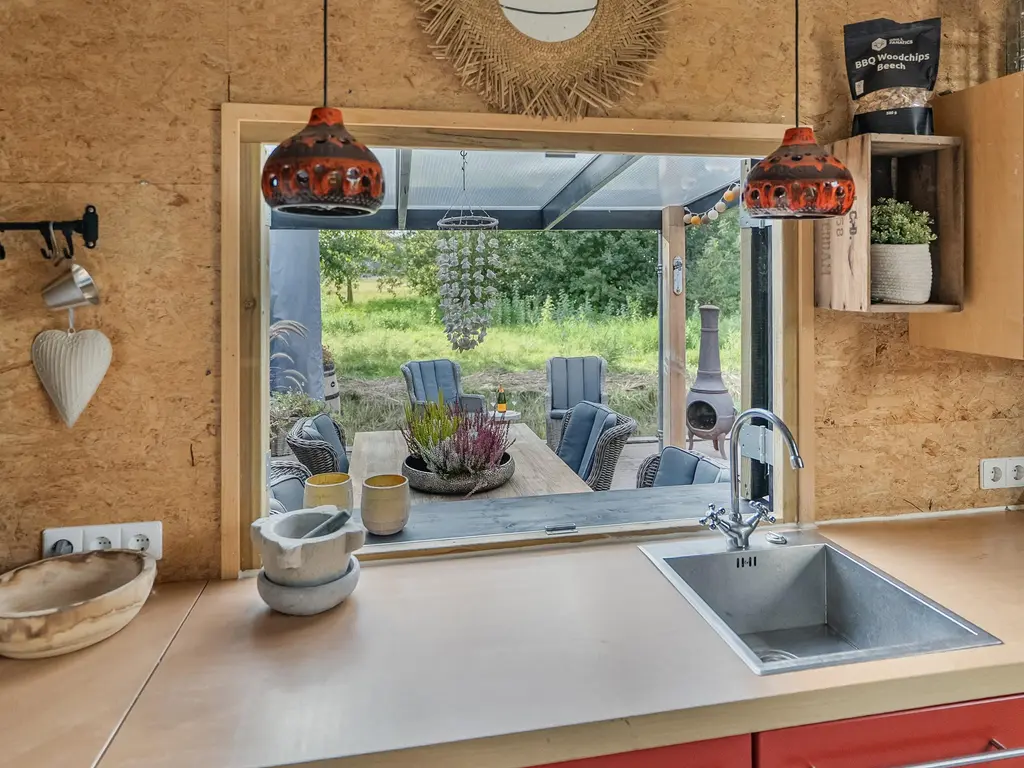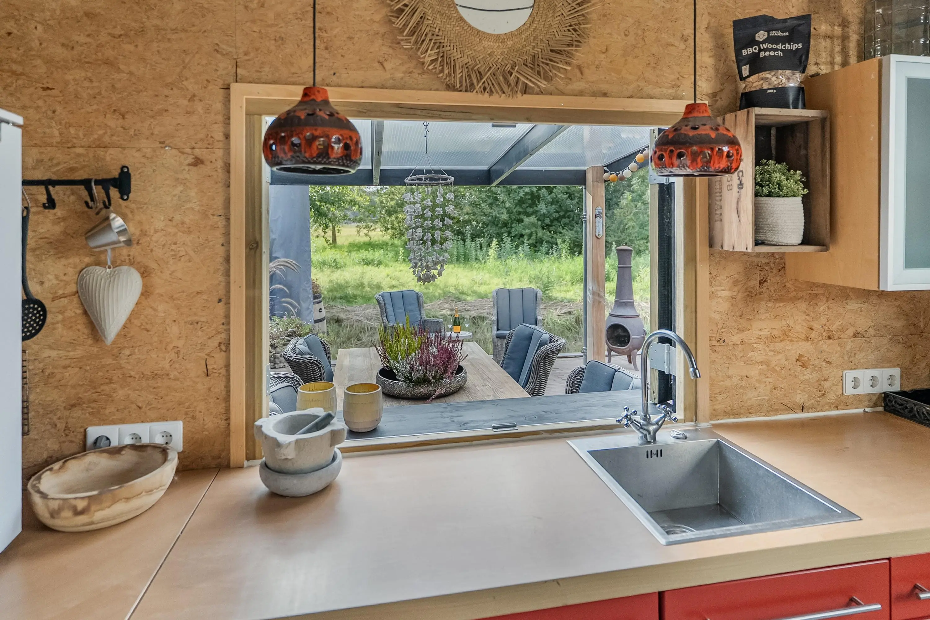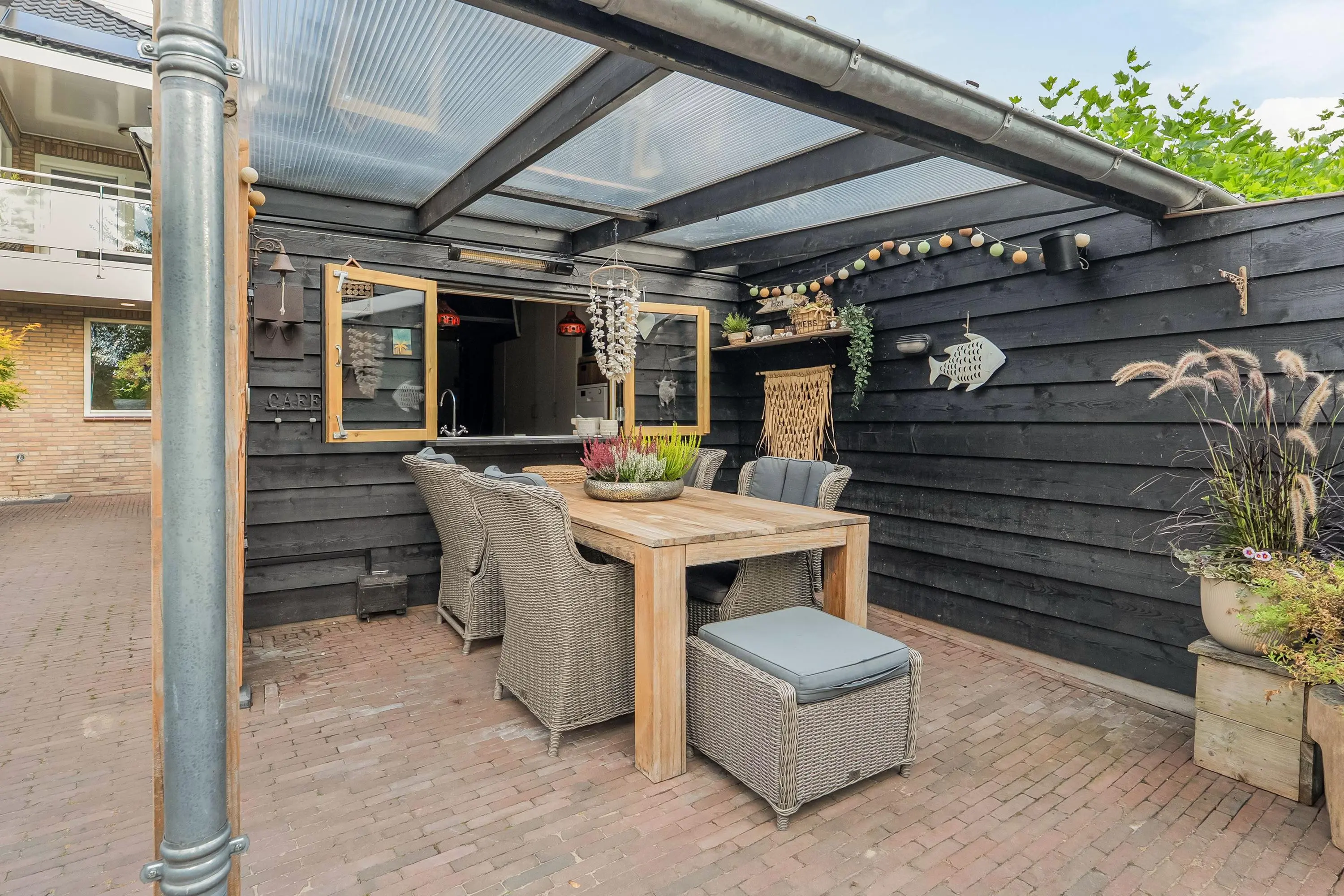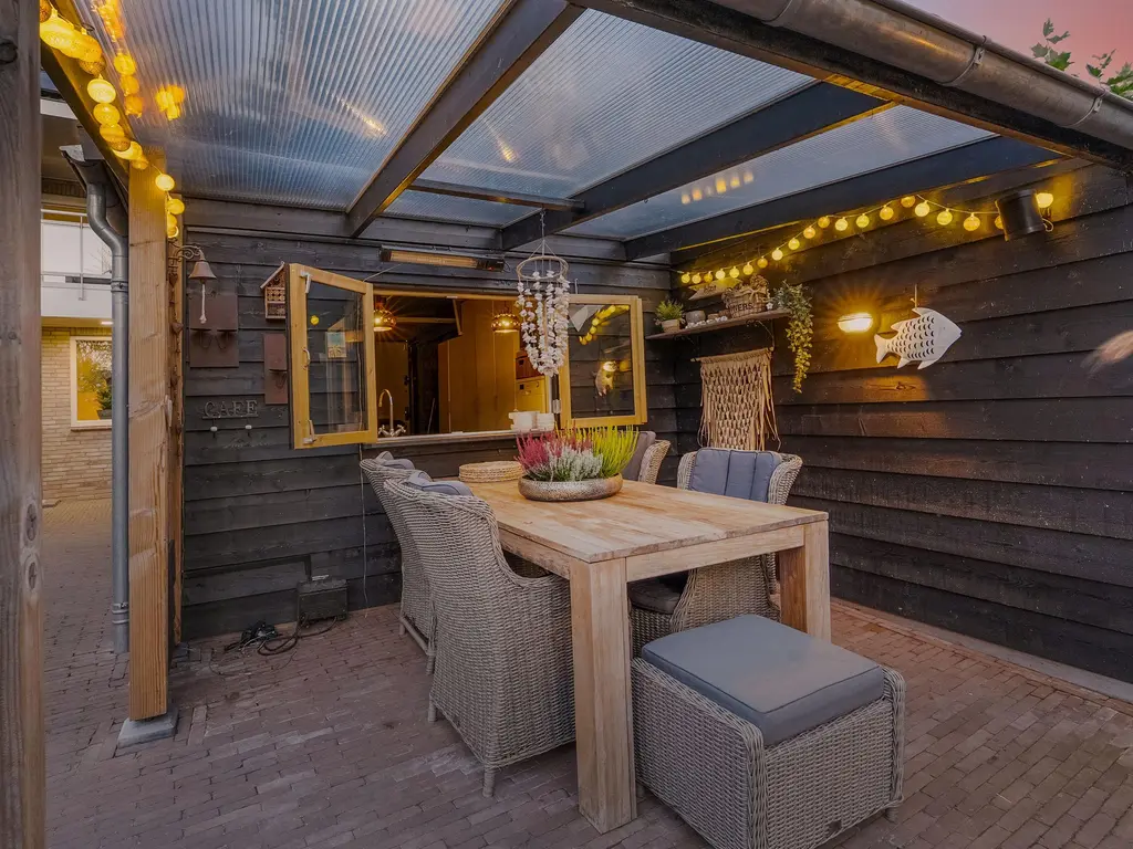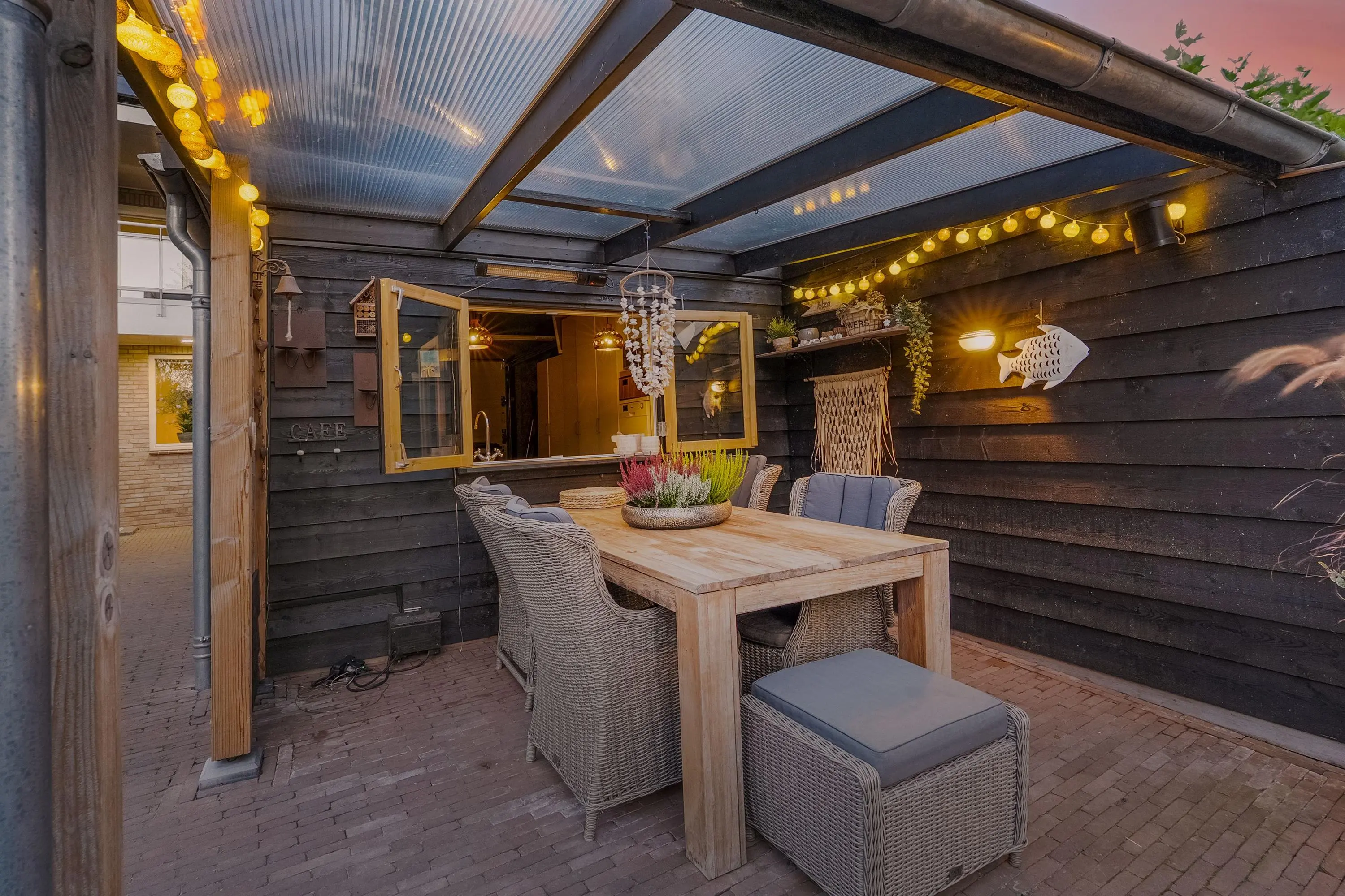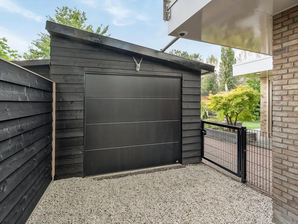 De houten schuur/garage (ca. 20 m2) beschikt over een elektrische garagedeur, een pantry met een wasbak met koud/warm waterkraan, boiler, vaatwasser en koelkast. De openslaande ramen aan de achterzijde bieden een gezellige verbinding met de overkapping.