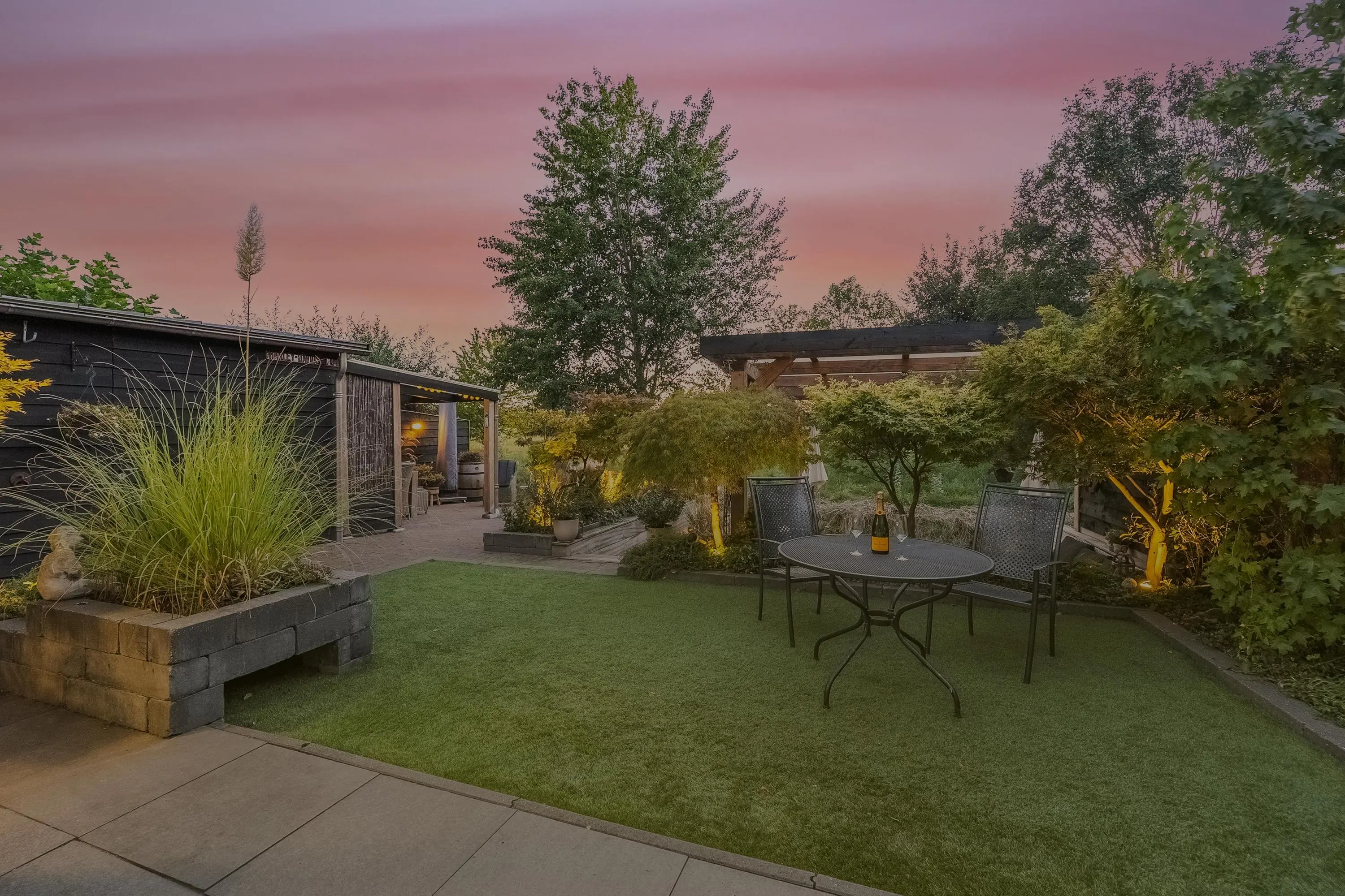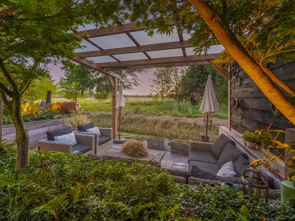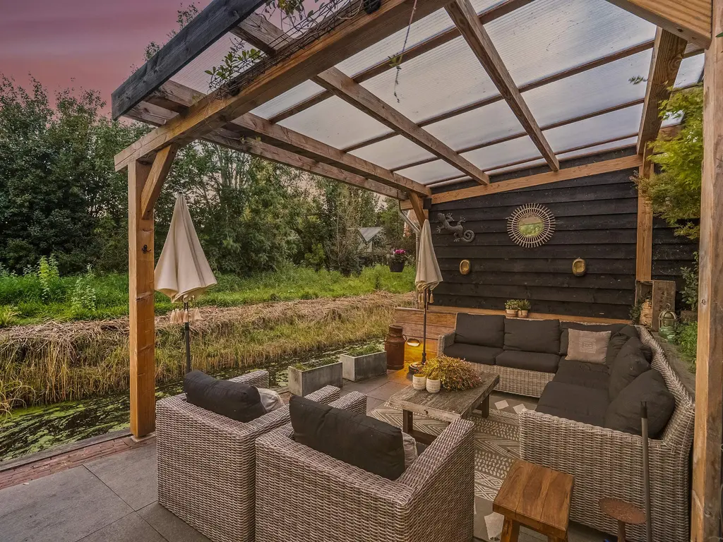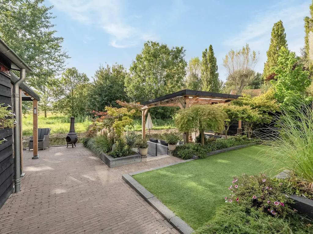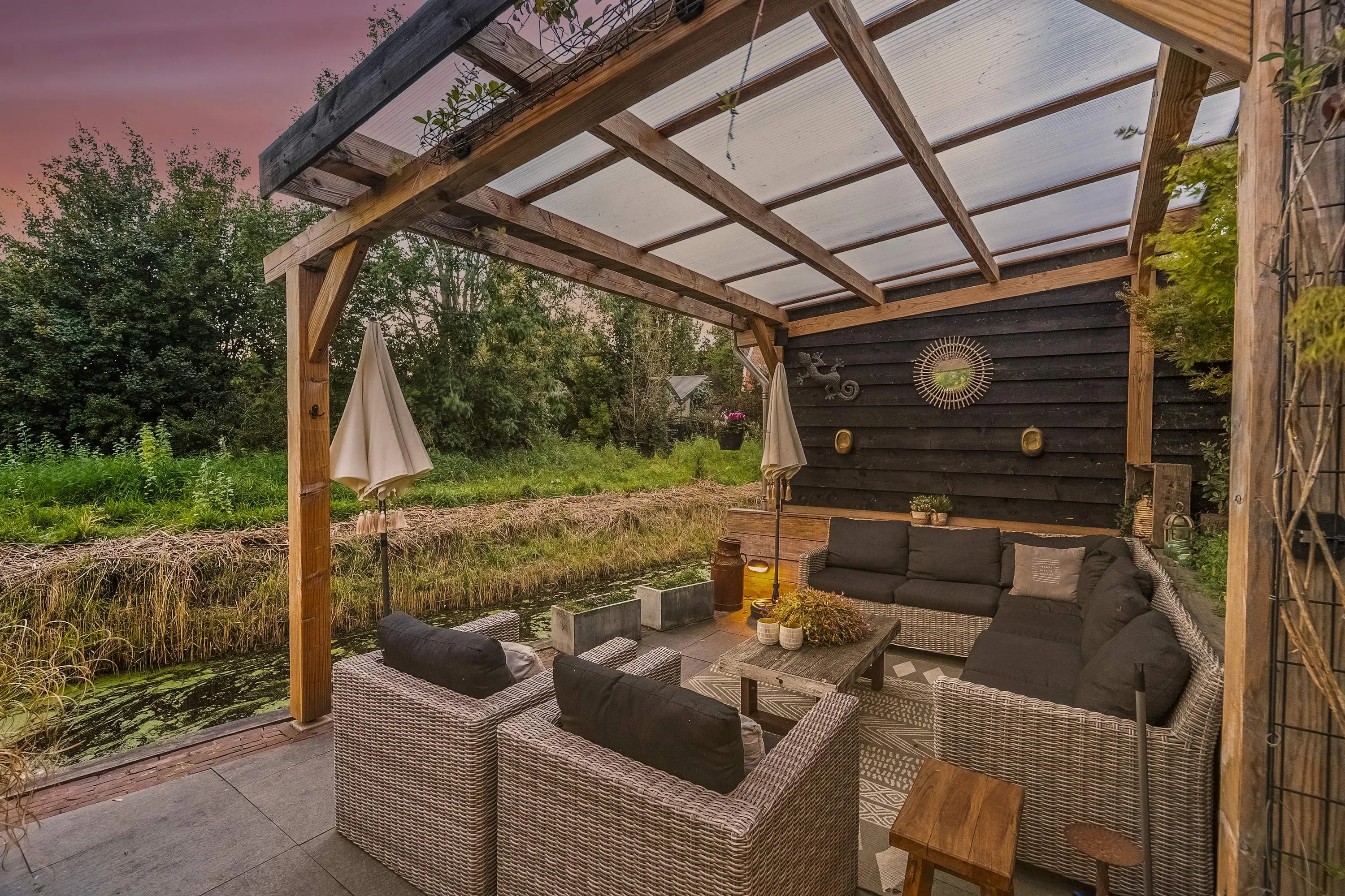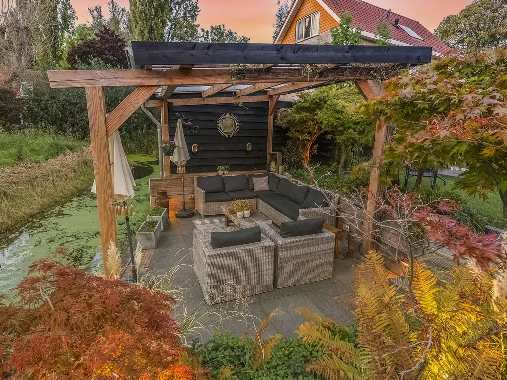 De achtertuin grenst aan het water en vanaf de tuin kijkt u uit over een uniek landschap waar talloze vogelsoorten hun thuis hebben gevonden, van zangvogels tot watervogels. Tussen het riet en de oevers leven bijzondere planten en kleine dieren die dit gebied extra karakter geven. In elk seizoen biedt de natuur een nieuw schouwspel – van bloeiende flora in de lente tot het zachte gefluit van vogels in de vroege ochtend. Deze prachtige achtertuin ligt op het zuiden en beschikt verder over een sproeisysteem, sfeerverlichting, kunstgras, sierbeplanting, verschillende terrassen, waterkraan, stopcontacten en een tweede overkapping aan de waterkant.