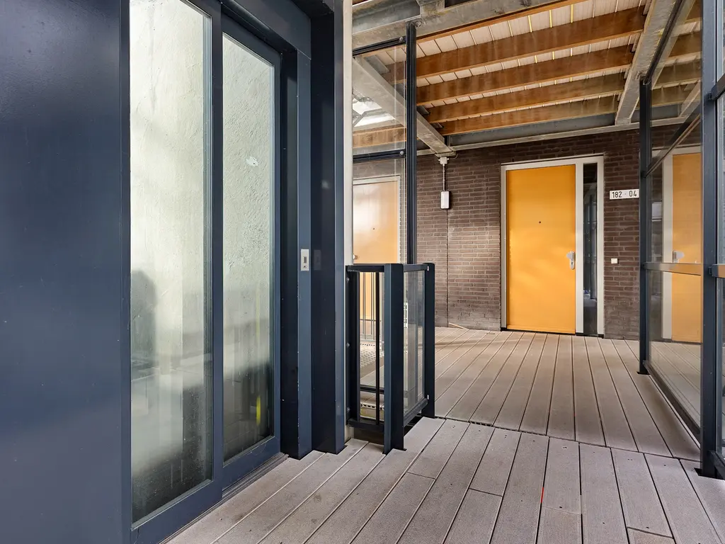 De galerij van het gebouw heeft een ruime overloop, waardoor er plek is voor een klein zithoekje.