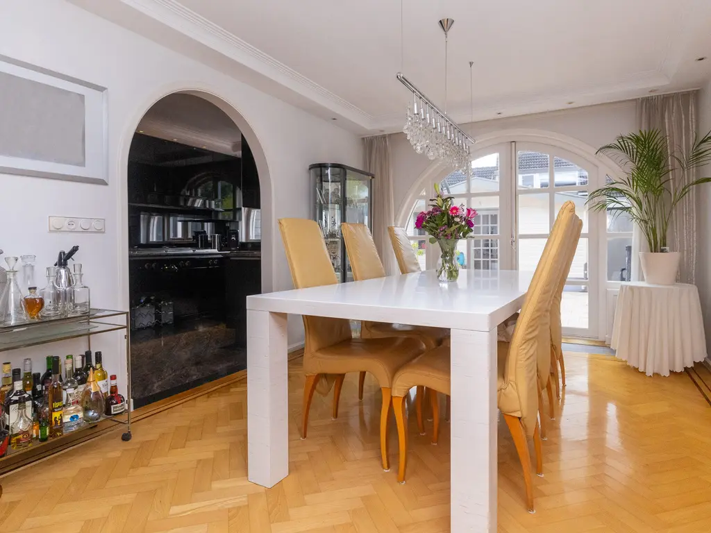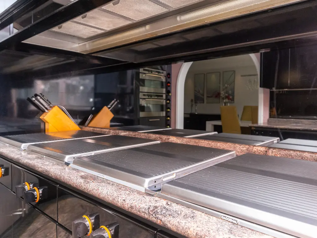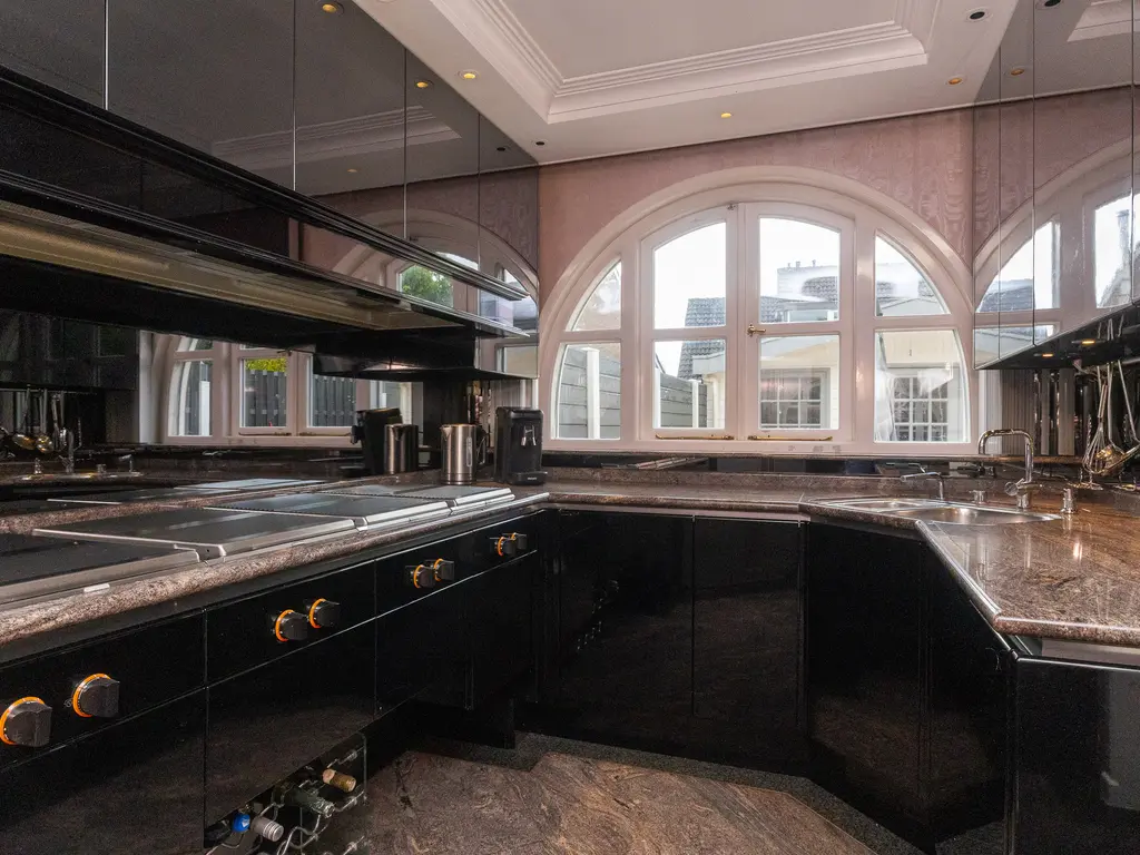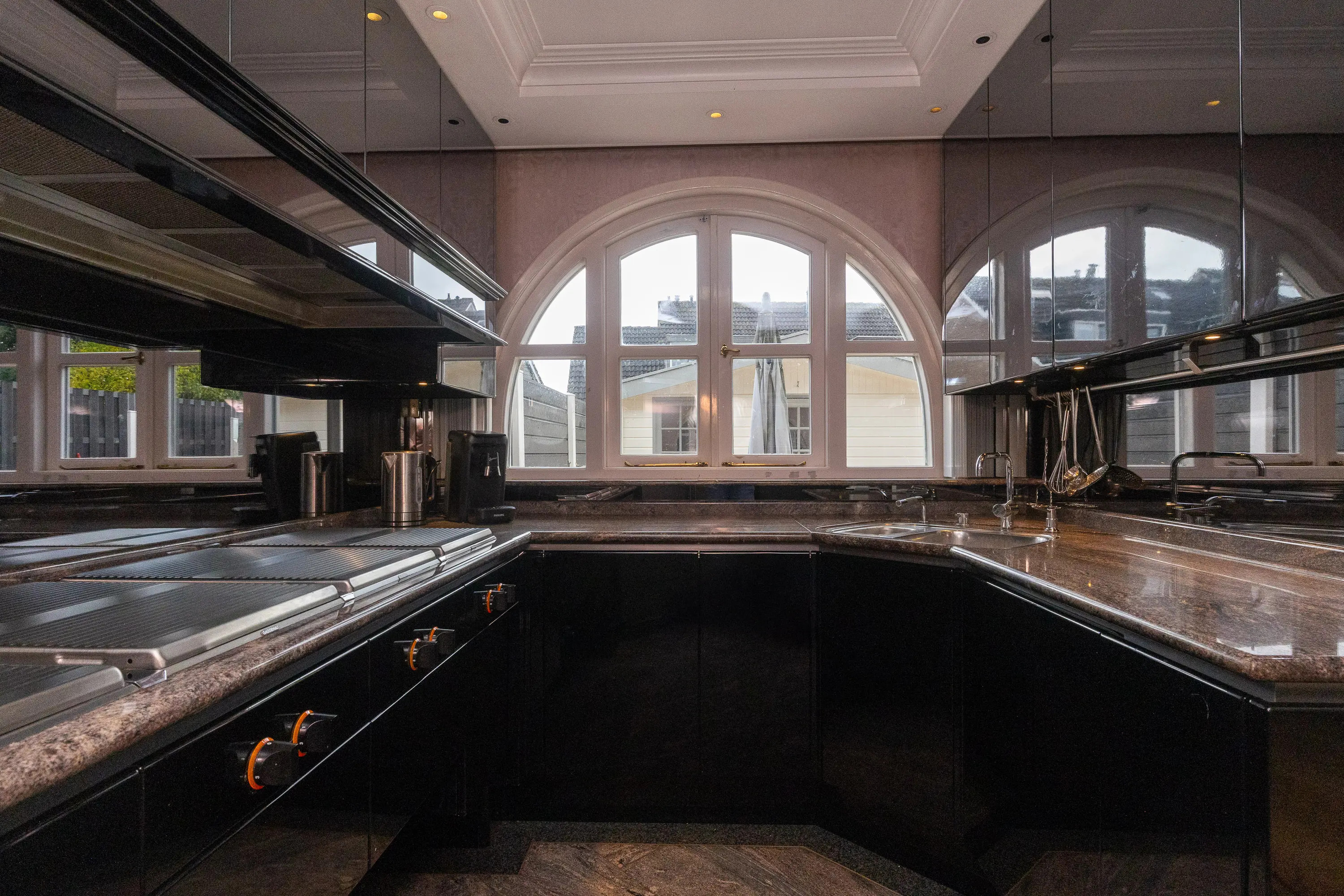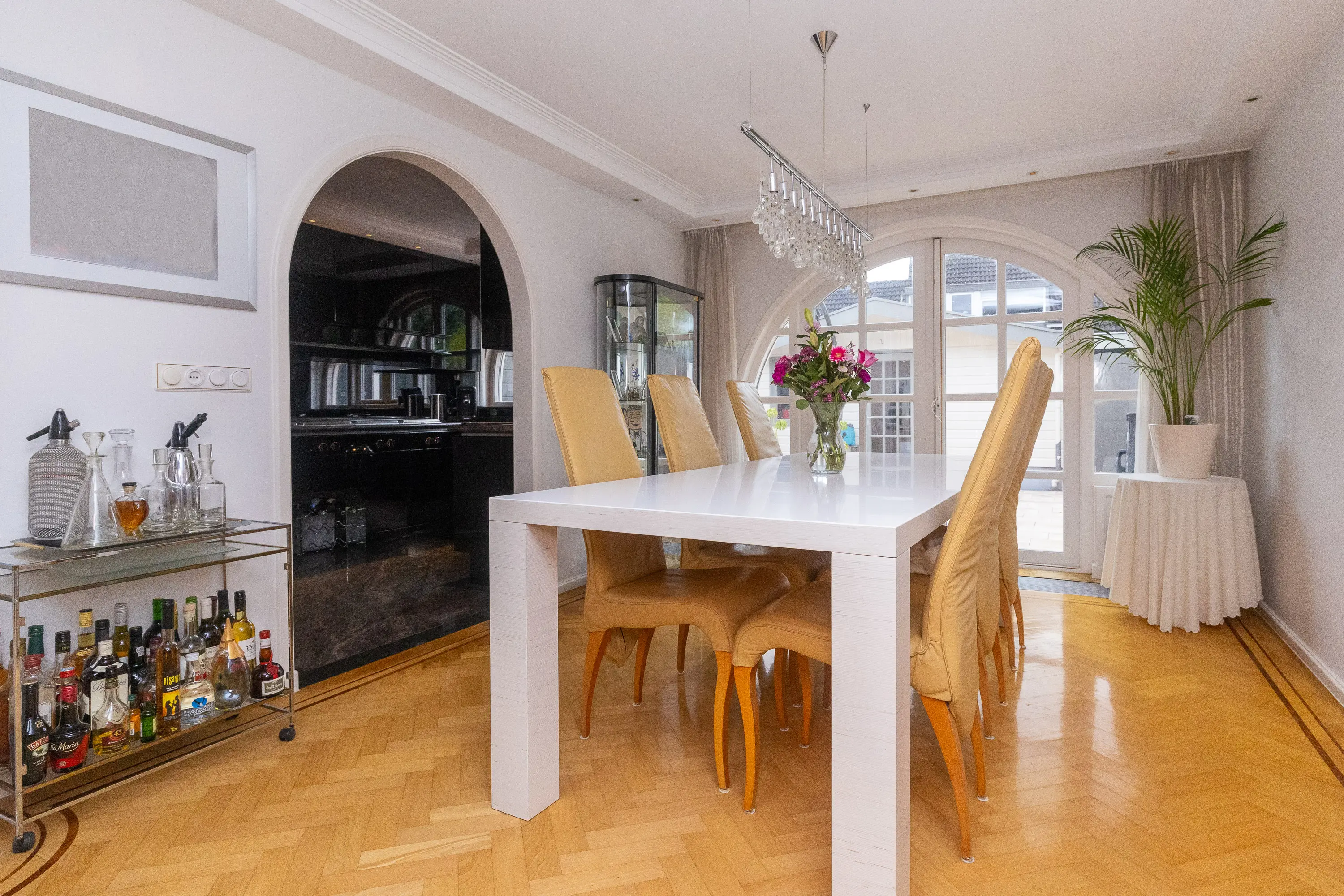 Achterin de woonkamer is de eethoek gesitueerd, met een directe verbinding naar de zonnige tuin op het zuidwesten via openslaande deuren. Naast de eethoek bevindt zich de luxe keuken. Aan kwaliteit geen gebrek: merkapparatuur, oven, combioven, Amerikaanse koelkast, een professioneel breed afzuigsysteem (extra krachtig), vernieuwde vaatwasser, een 8-pits fornuis en een fraai granieten aanrechtblad. Hier wordt koken een ware beleving. De keuken is bovendien voorzien van vloerverwarming, wat bijdraagt aan het comfort.