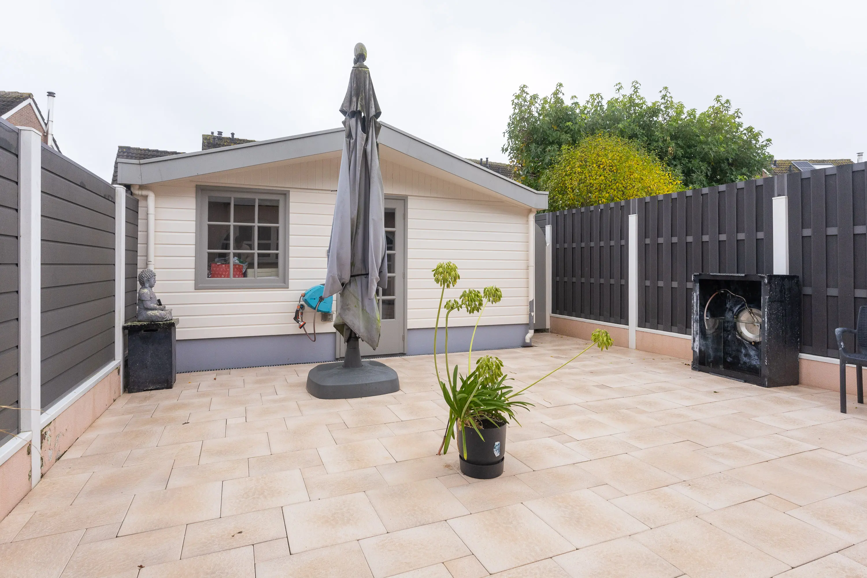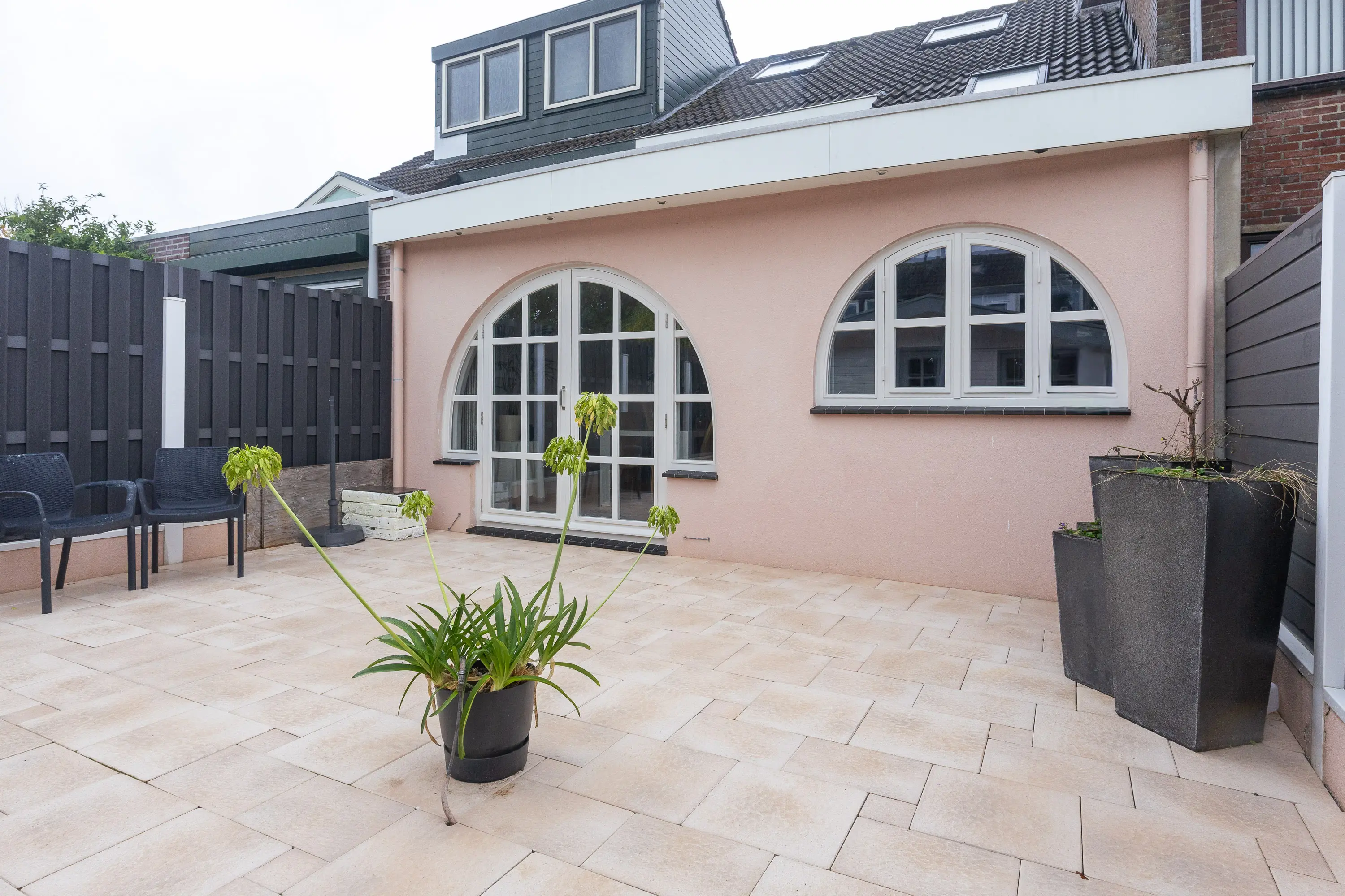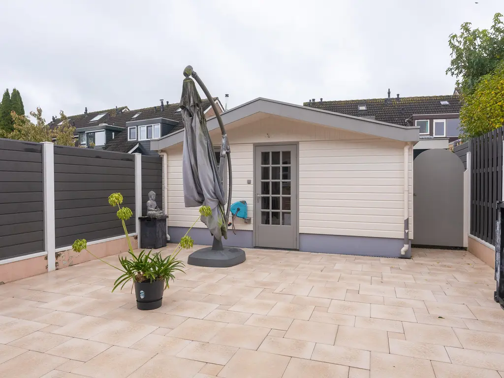 De achtertuin is gesitueerd op het zuidwesten, wat zorgt voor veel zon en lichtinval in de woning. De tuin is modern aangelegd, met strakke bestrating en moderne schuttingen aan beide zijden. Achterin bevindt zich een ruime berging/bijgebouw, volledig betegeld en voorzien van witgoedaansluitingen, water, eigen groepen en elektra. De biedt een achterom en uiteraard ontbreekt ook hier de kenmerkende ronde afwerking niet, welke is terug te vinden in de poort. Aan de achterzijde zijn ook goede de unieke kozijnen en achterdeuren met de ronde vormen zichtbaar die de woning een geheel eigen uitstraling geeft.