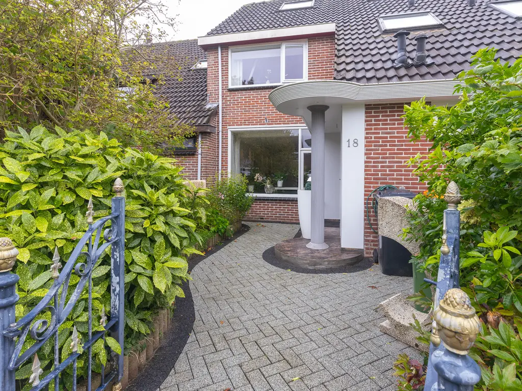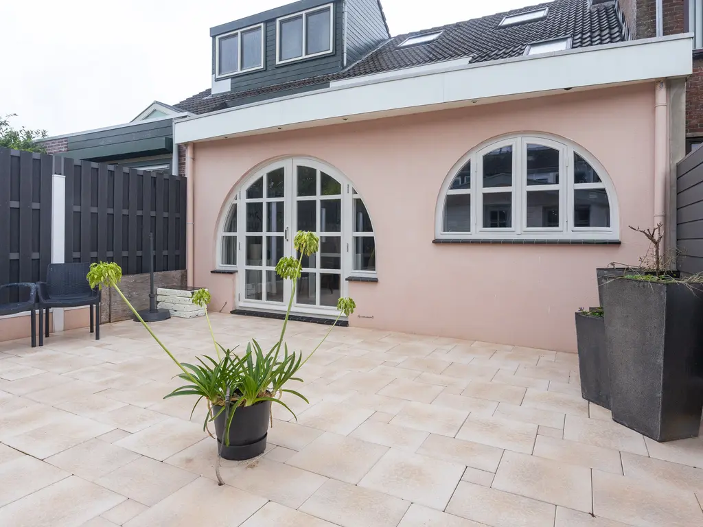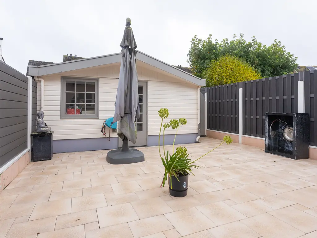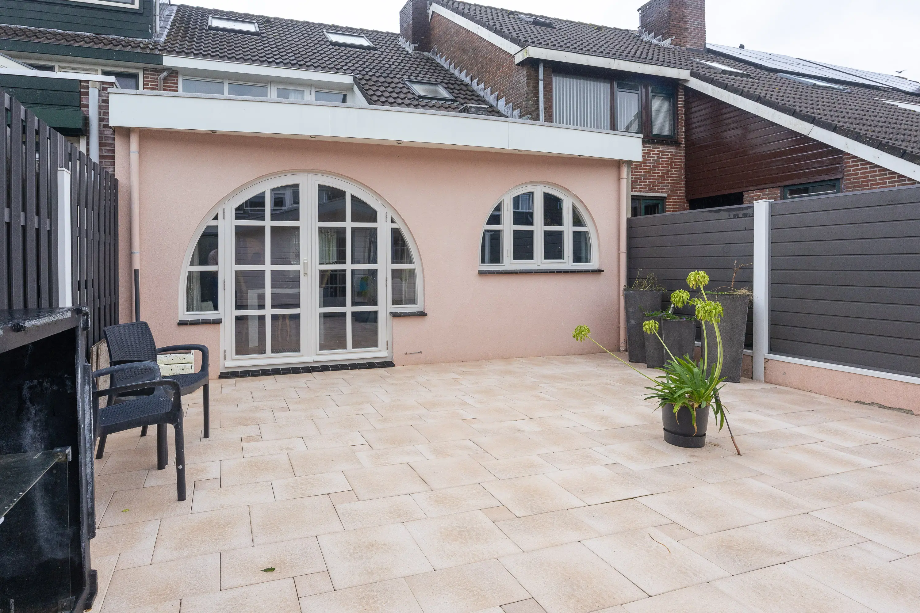 De achtertuin is gesitueerd op het zuidwesten, wat zorgt voor veel zon en lichtinval in de woning. De tuin is modern aangelegd, met strakke bestrating en moderne schuttingen aan beide zijden. Achterin bevindt zich een ruime berging/bijgebouw, volledig betegeld en voorzien van witgoedaansluitingen, water, eigen groepen en elektra. De biedt een achterom en uiteraard ontbreekt ook hier de kenmerkende ronde afwerking niet, welke is terug te vinden in de poort. Aan de achterzijde zijn ook goede de unieke kozijnen en achterdeuren met de ronde vormen zichtbaar die de woning een geheel eigen uitstraling geeft.