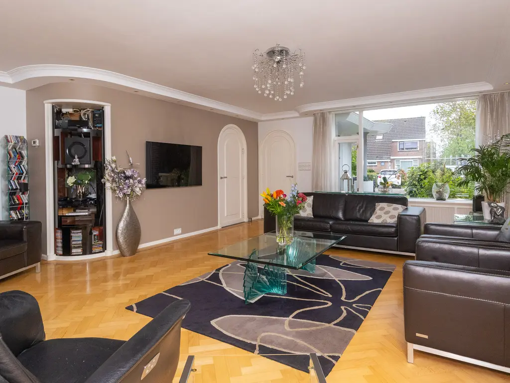 Via de voortuin bereikt u de entree. De hal is voorzien van een meterkast, toilet, garderobekast en biedt toegang tot de uitgebouwde woonkamer. Een diepe en sfeervolle kamer met mooie inbouwspots die zorgen voor aangenaam licht. Dankzij de grote raampartijen aan zowel de voor- als achterzijde is er volop lichtinval. De woonkamer is uitgerust met een modern en multifunctioneel wandmeubel en praktische bergruimte voorzien van deuren met ronde vormen, volledig in stijl met de rest van de woning.