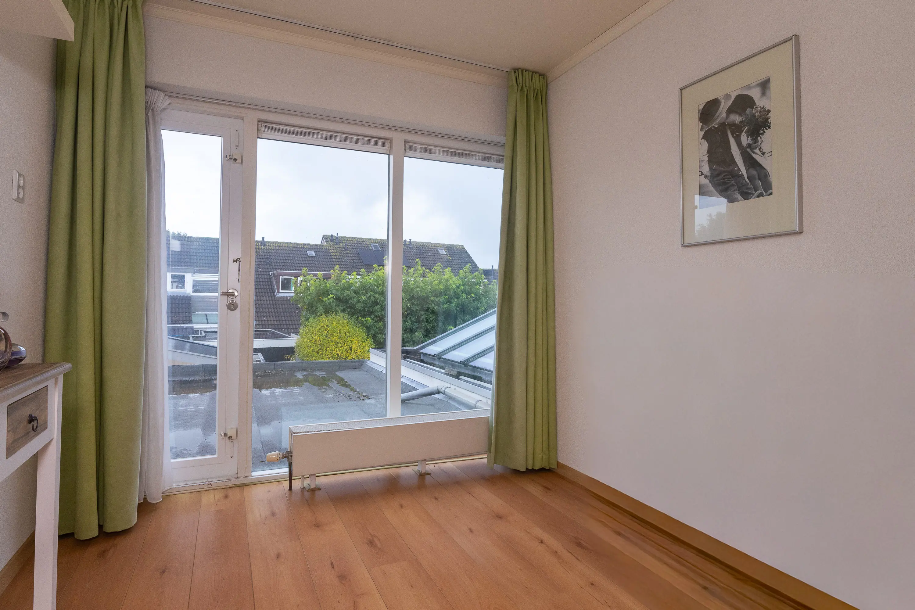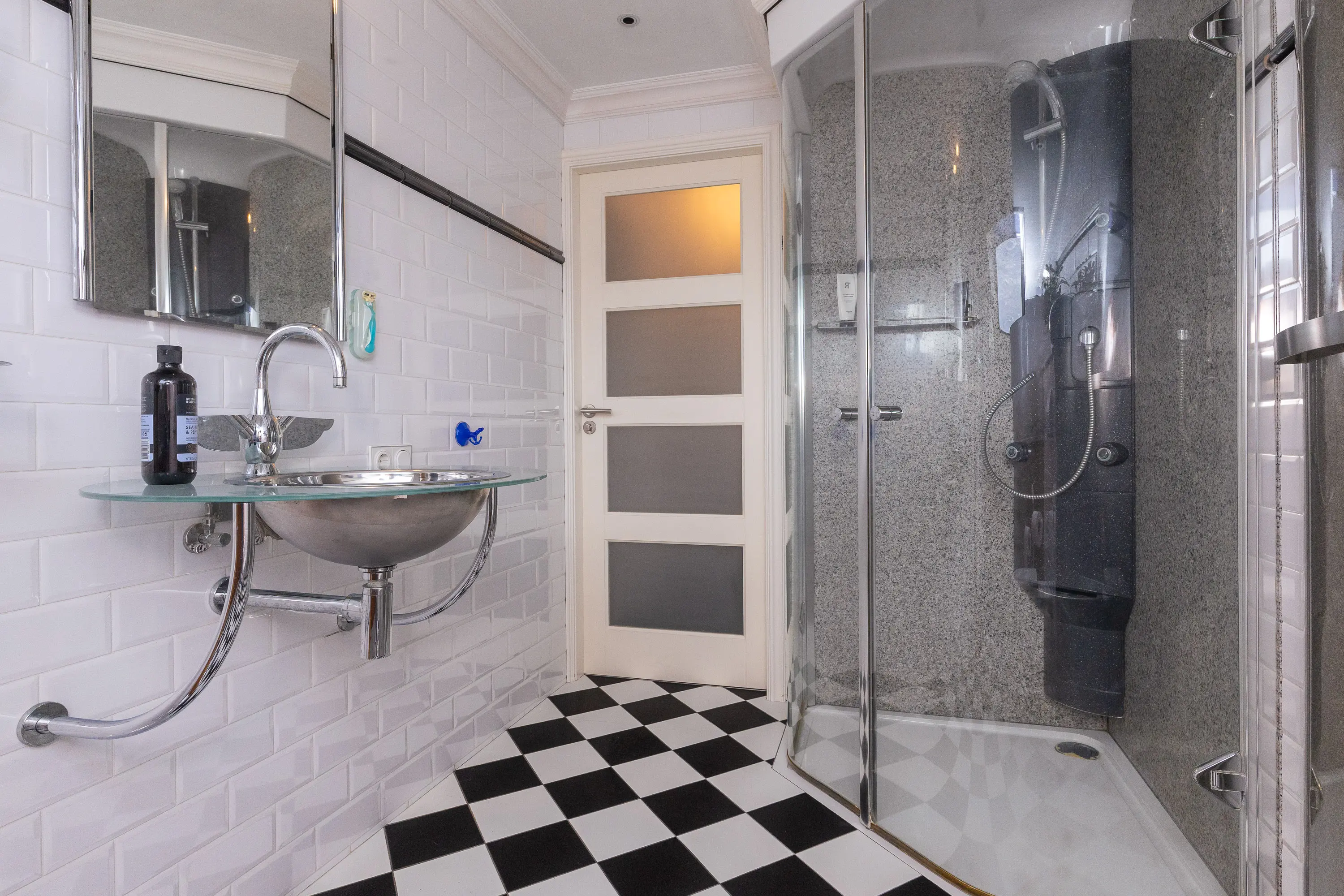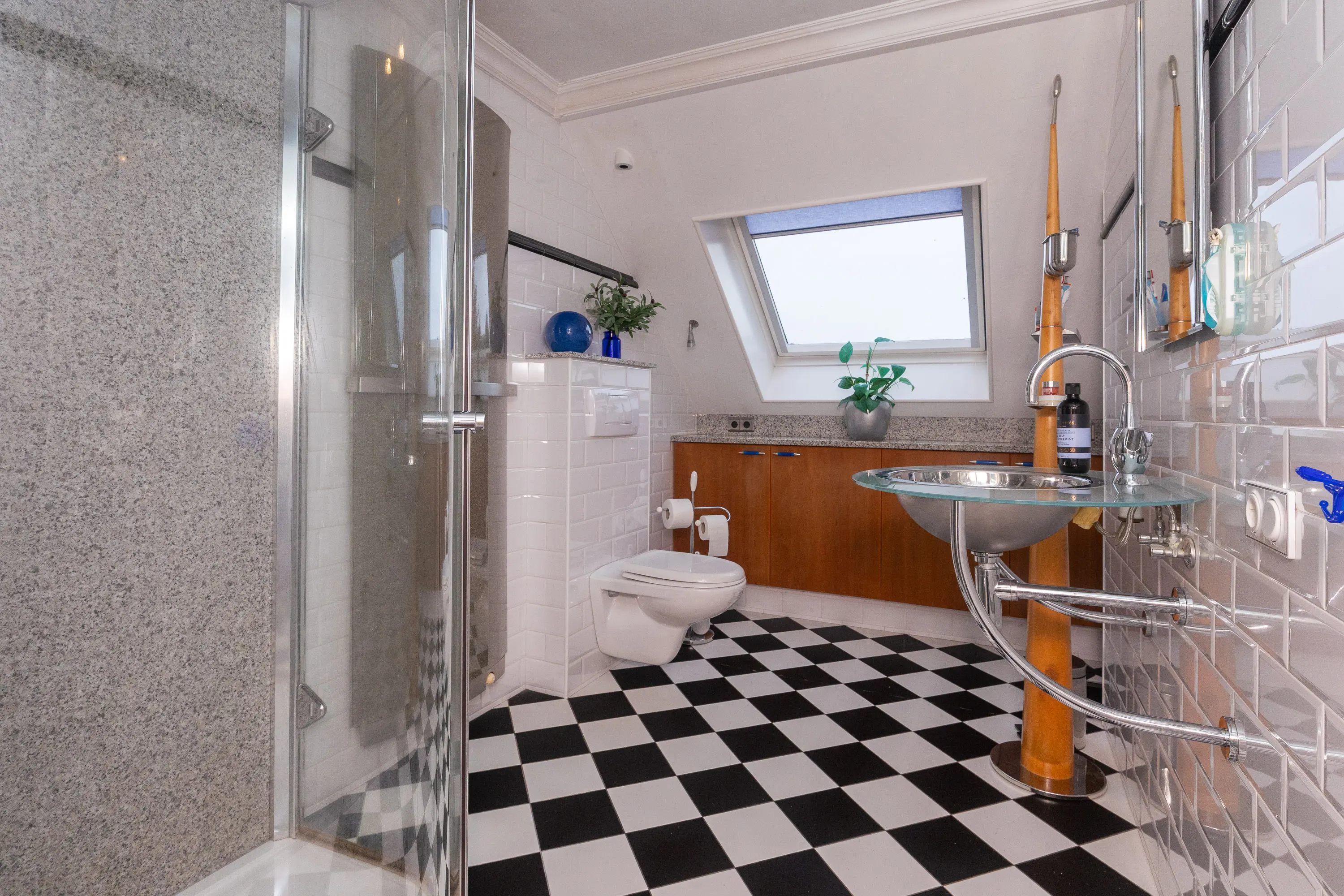 Via het gesloten trappenhuis in de woonkamer bereikt u de eerste etage. Deze is voorzien van drie (slaap-)kamers en een nette badkamer. Aan de achterzijde bevinden zich twee kamers, waarvan de grootste is uitgerust met een dakraam voor extra lichtinval. Aan de voorzijde treft u nog een ruime slaapkamer en de badkamer, voorzien van een inloopdouche, wastafel, toilet, dakraam en nette afwerking, inclusief een granieten wandradiator die perfect past bij de stijl van de woning.