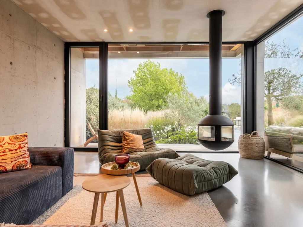 De enorme raampartijen halen de natuurlijke omgeving naar binnen en zorgen voor een fascinerende beleving van licht en ruimte.