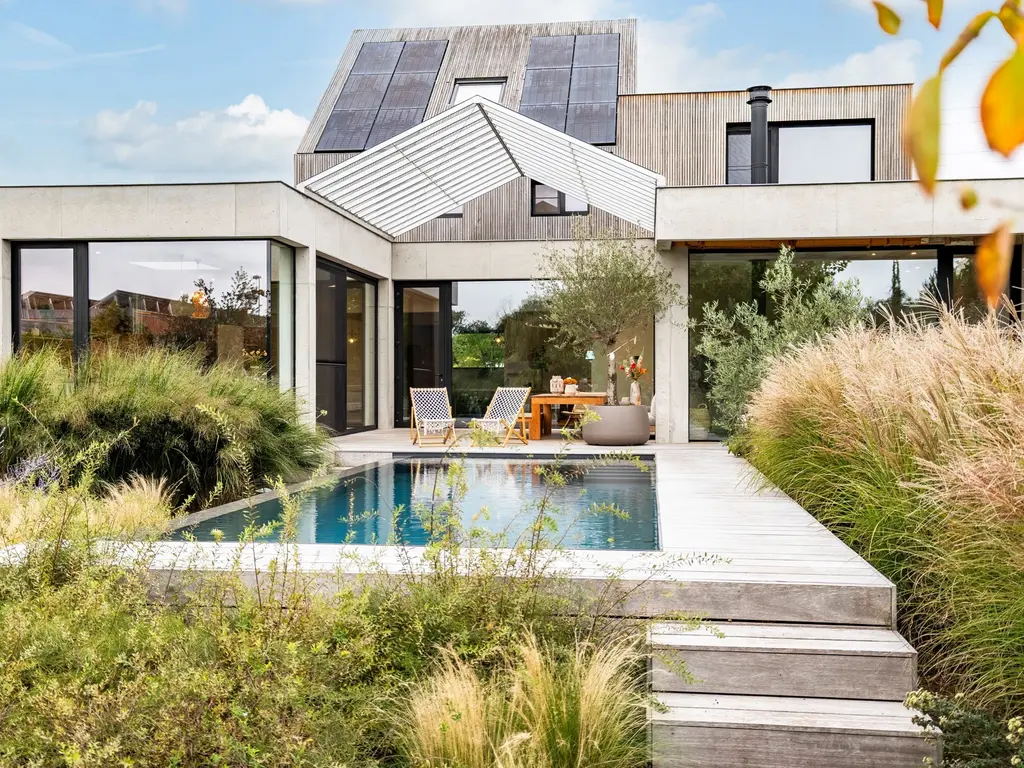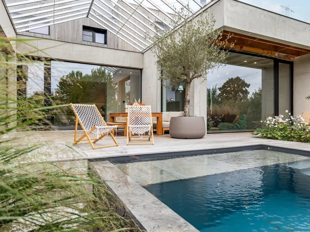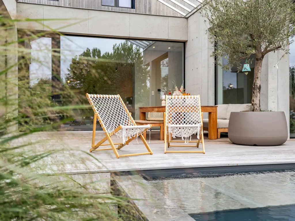 - Hoogwaardige inrichting en structuren/materialen: vijver, zwembad