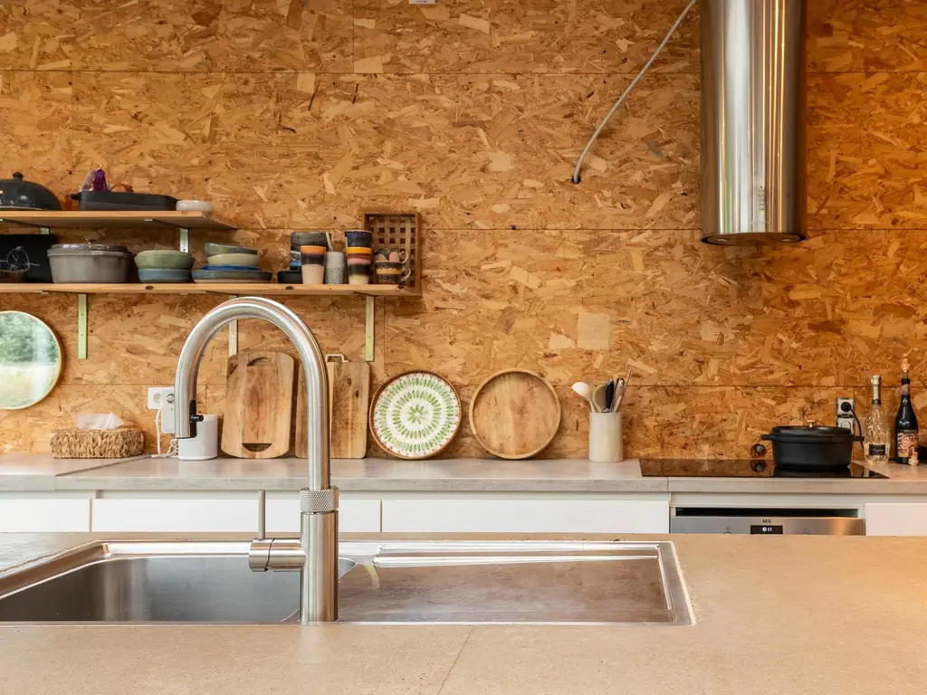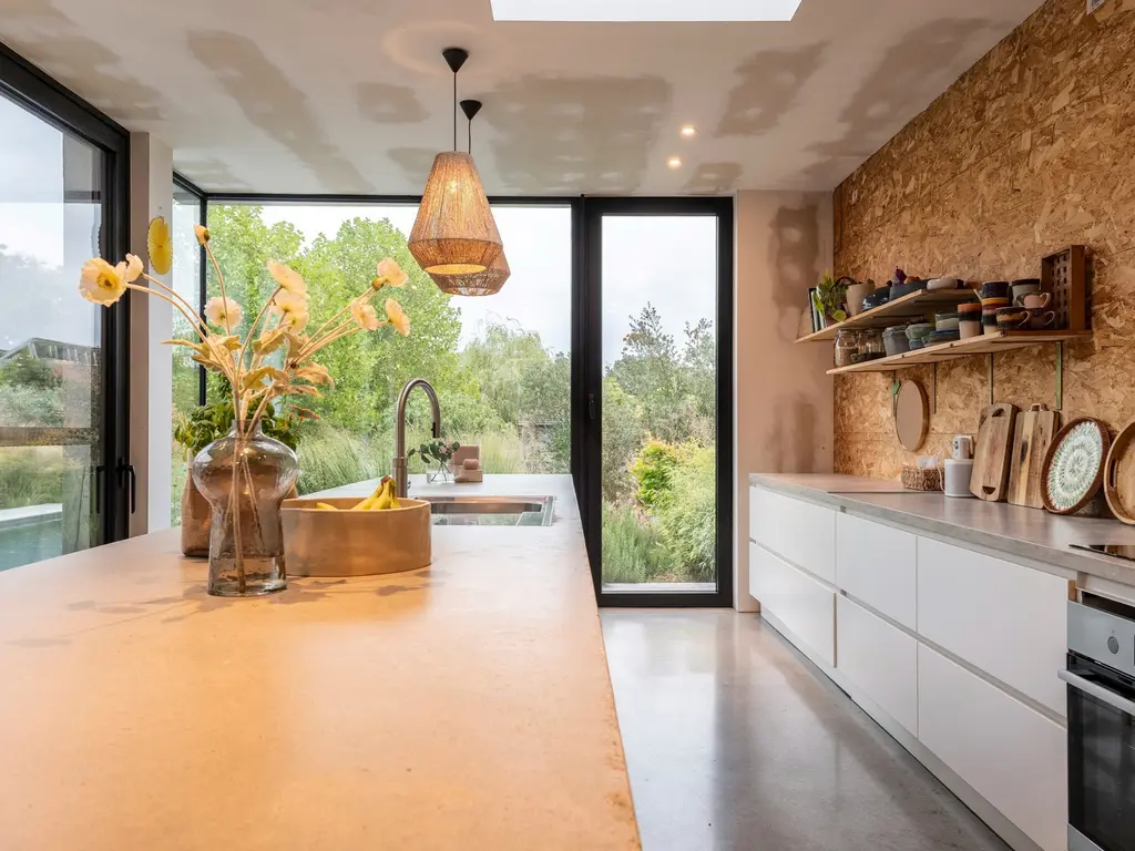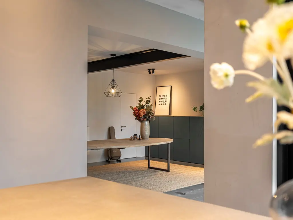 De leefruimte is verdeeld in een zitgedeelte (linkerzijde) met zwevende houtkachel, het eetgedeelte met achterliggende bureauruimte (centraal) en de open leefkeuken (rechterzijde).