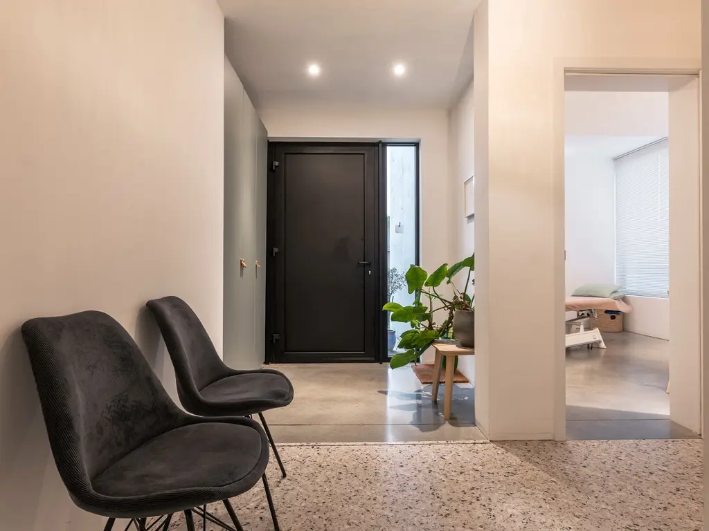 Via de inkomhal met vestiairegedeelte en gastentoilet heeft u toegang tot de afzonderlijke praktijkruimte, de technische ruimte en waskamer.
