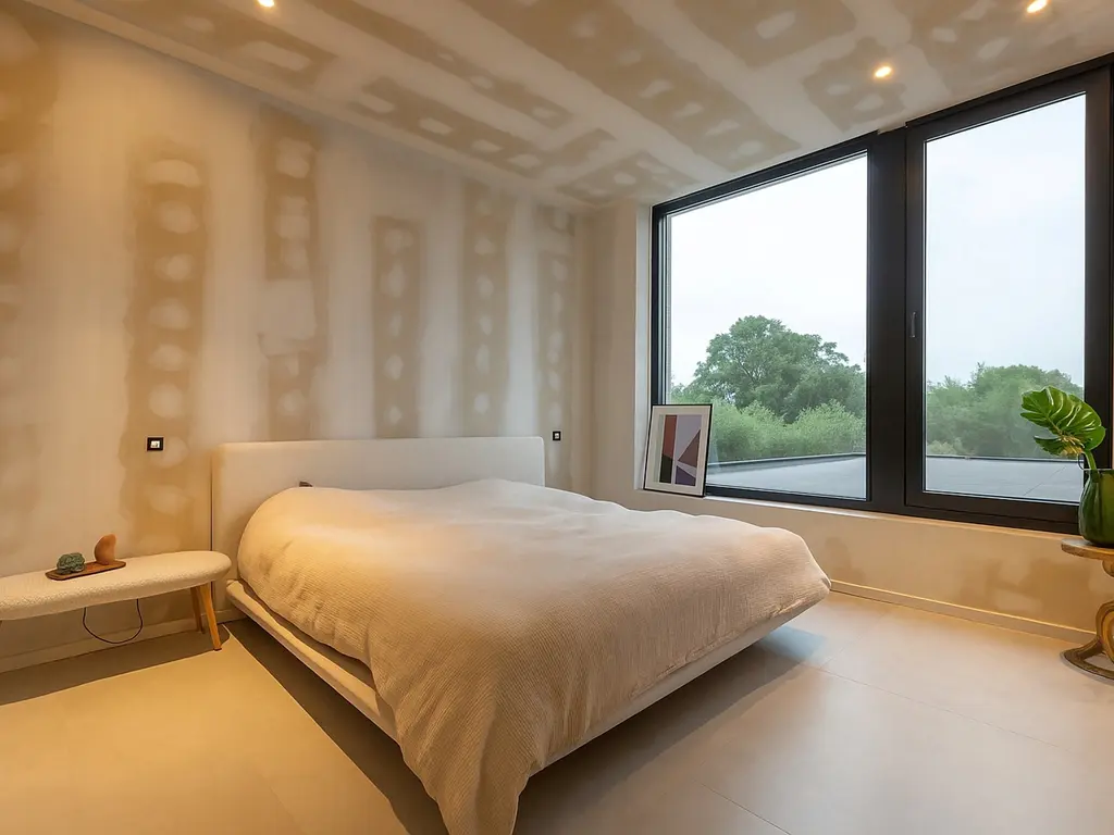 De hoofdslaapkamer is voorzien van een eigen ensuite-badkamer (nog onafgewerkt) en een inloopdressing.