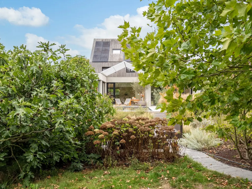De woning en tuin zijn opgebouwd op verschillende niveaus, wat zorgt voor een speelse, open dynamiek.