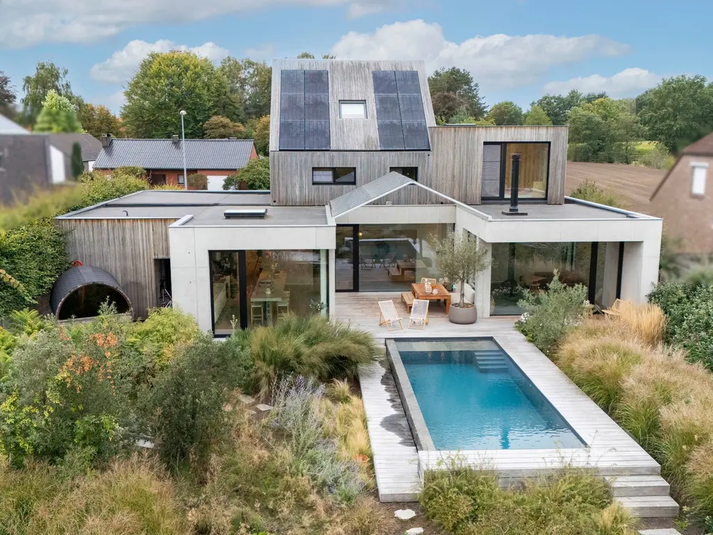 De villa biedt o.a. 4 à 6 ruime slaapkamers, 2 badkamers, een uiterst lichtrijke, open leefruimte en een diepe, organisch ingerichte natuurtuin (met zonneterrassen en infinity-zwembad).
