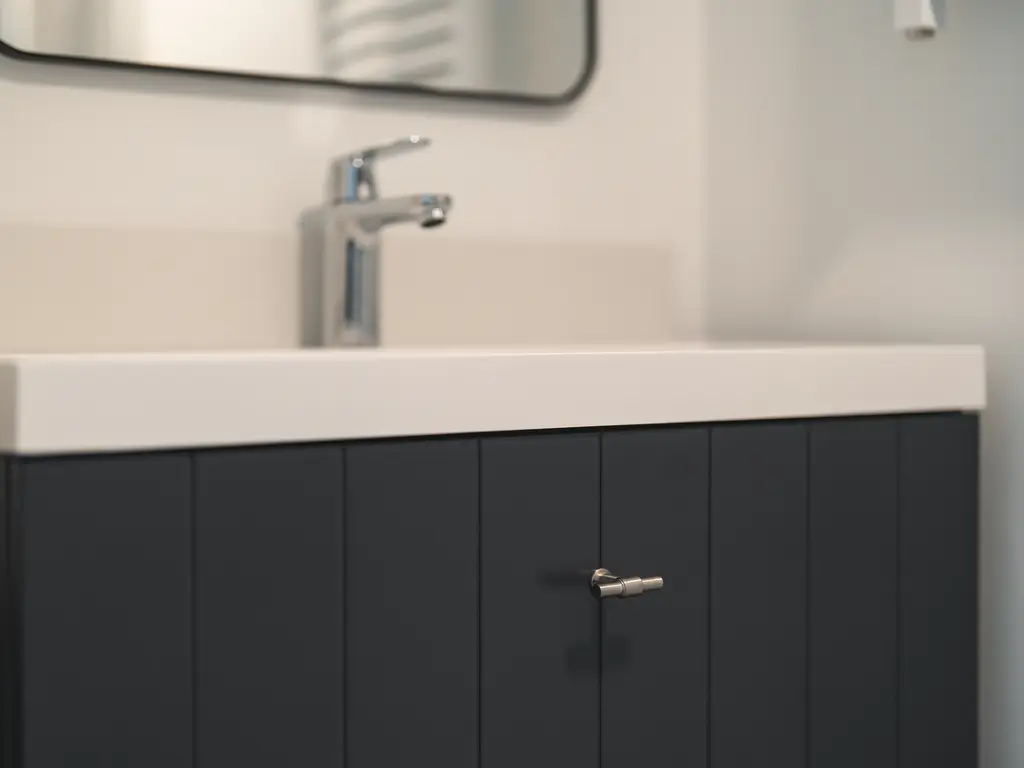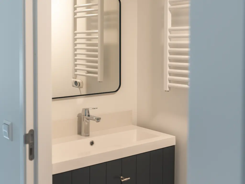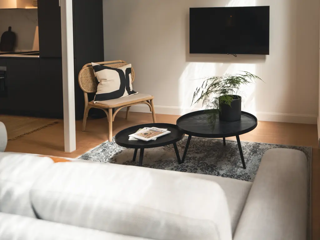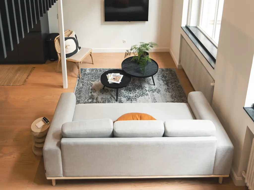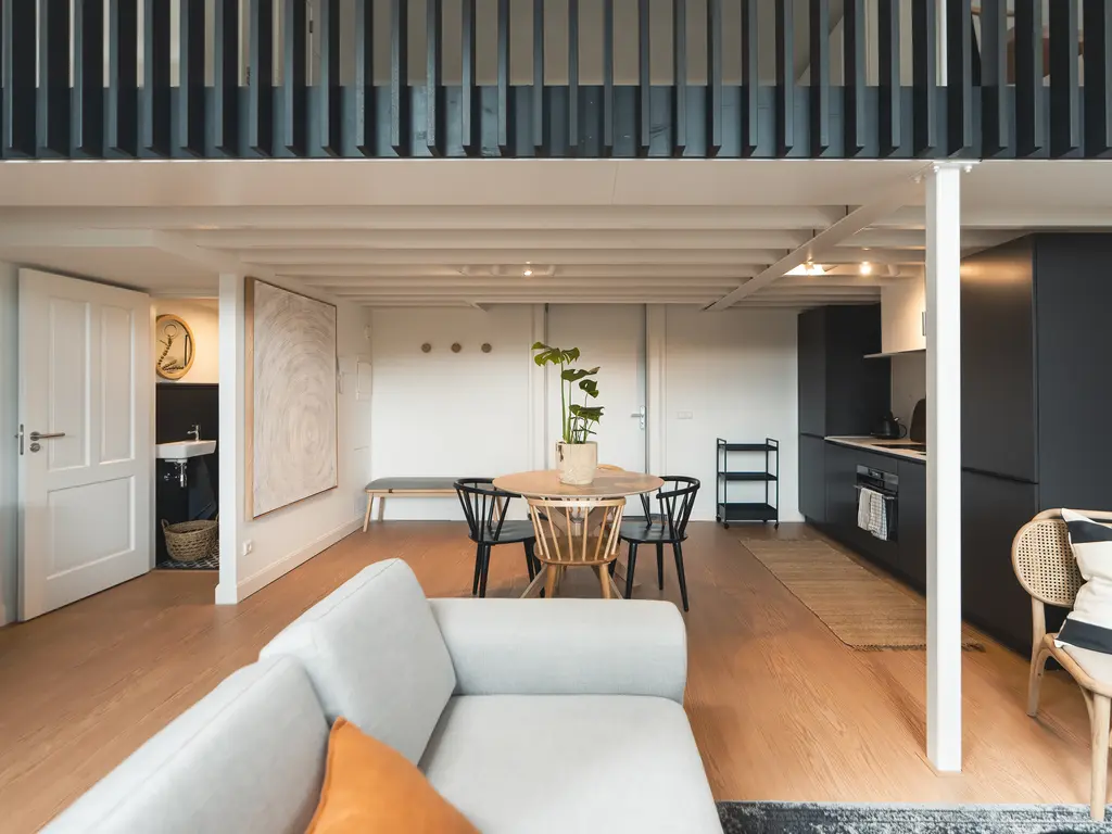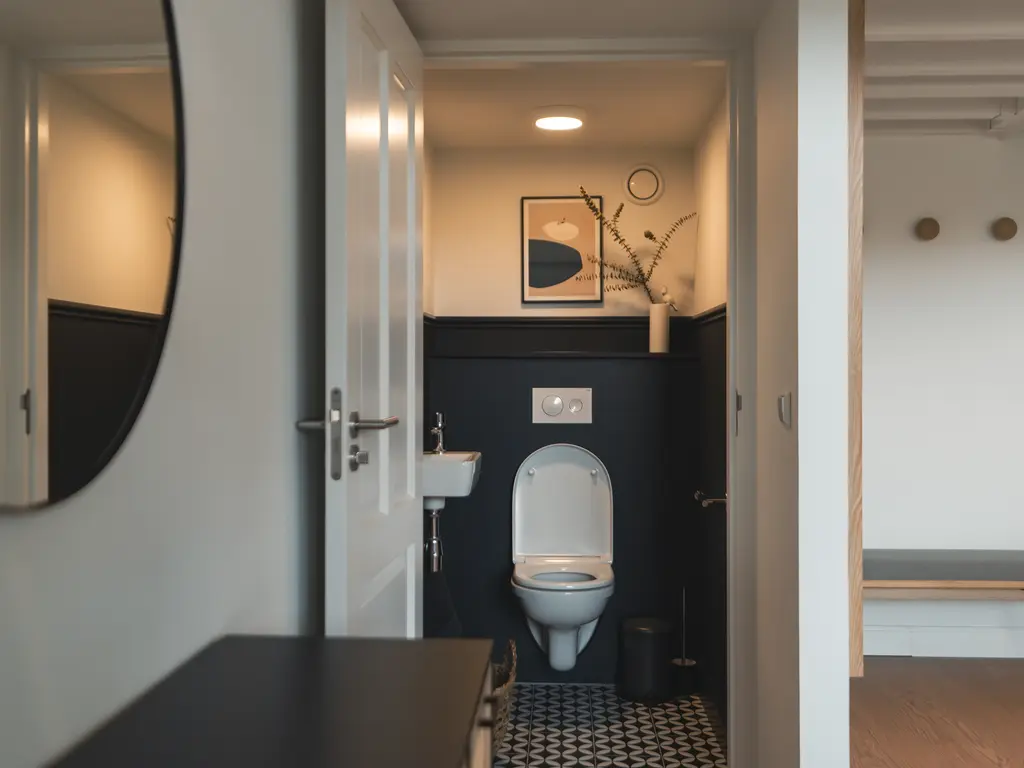 Via de eigen entree stap je de ruime woonkamer binnen. Dankzij de plafondhoogte en de grote raampartijen voelt het hier licht en open aan. Aan de voorzijde bevindt zich de nette open keuken, voorzien van modern keukenblok en inbouwapparatuur. Aangrenzend een separaat toilet – praktisch en gastvriendelijk.