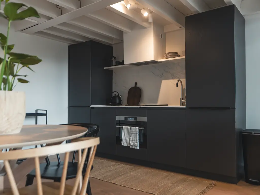 De open keuken is stijlvol vormgegeven met strakke matzwarte fronten en volledig nieuwe inbouwapparatuur (inductiekookplaat, afzuigkap, oven, koelkast, vriezer en vaatwasser). De warme houten vloer maakt het helemaal af.