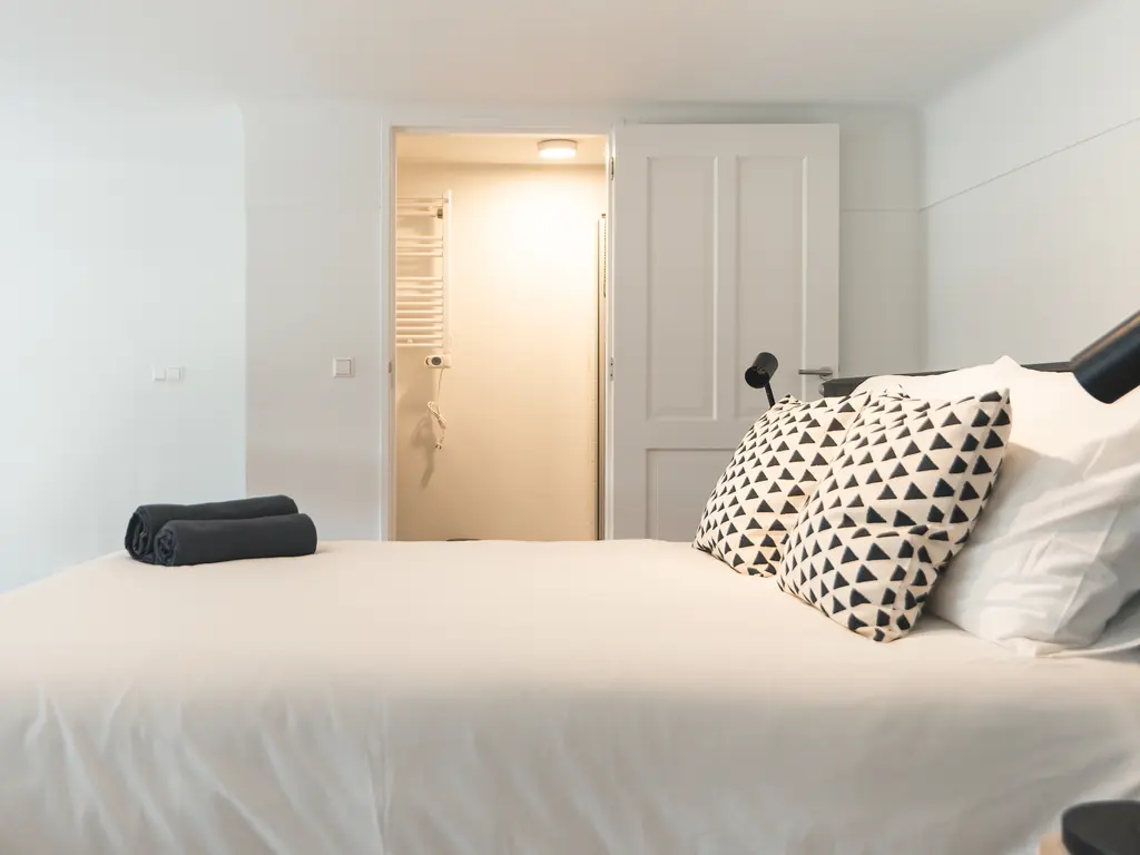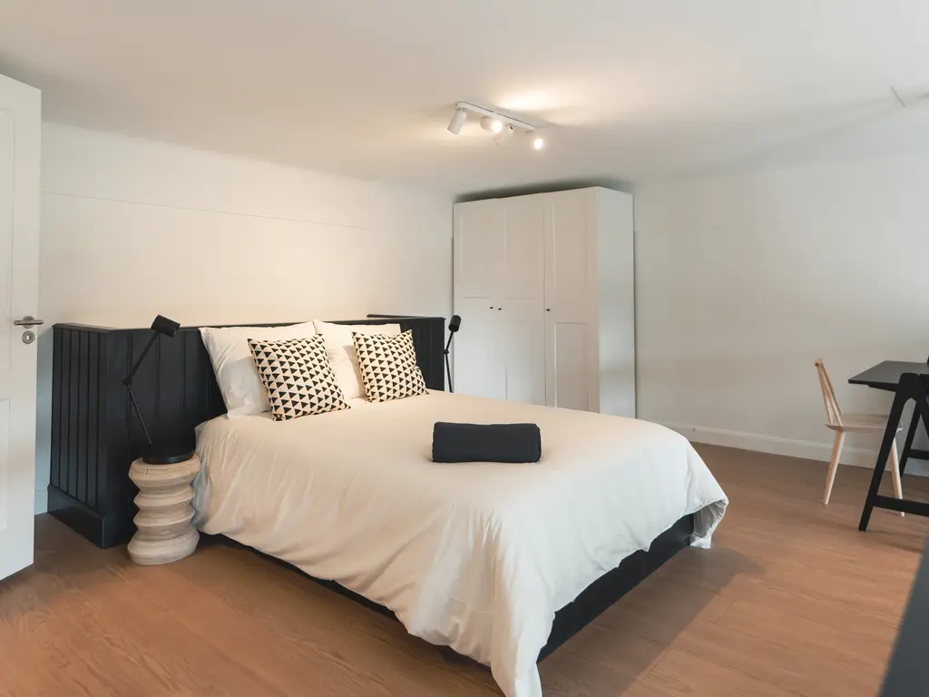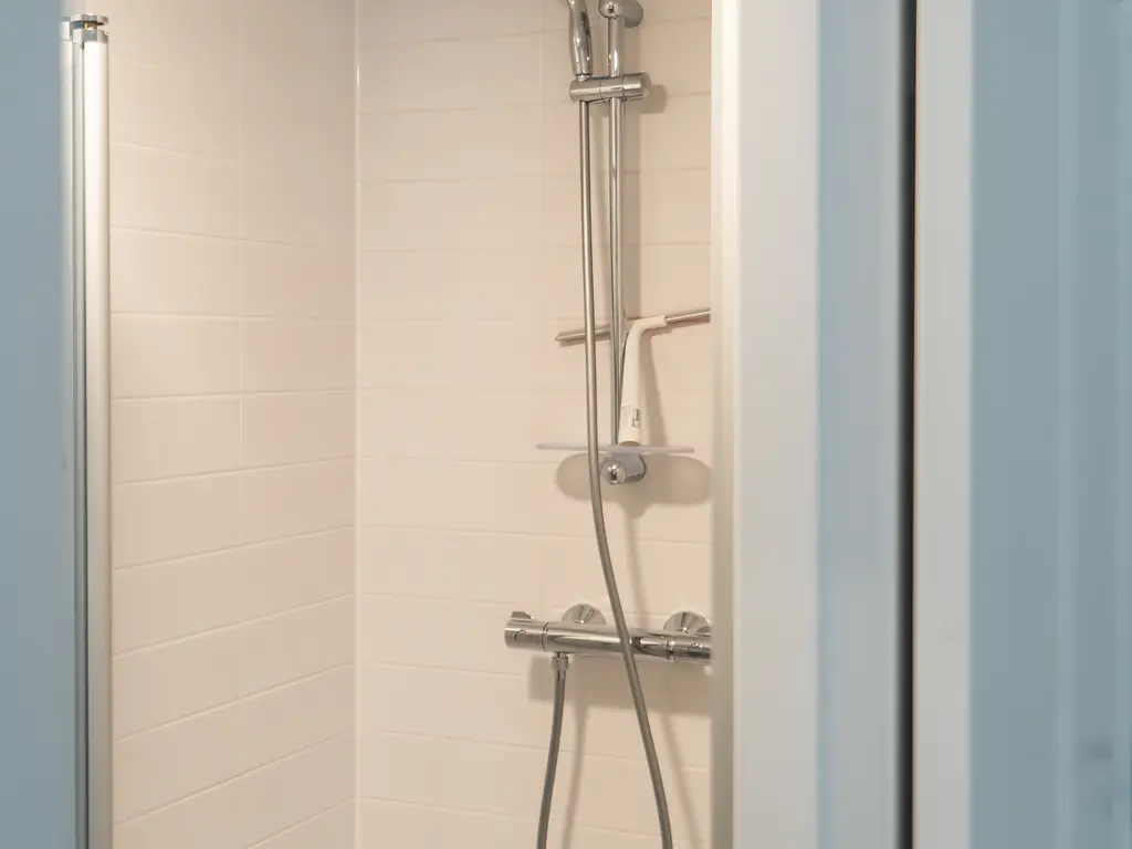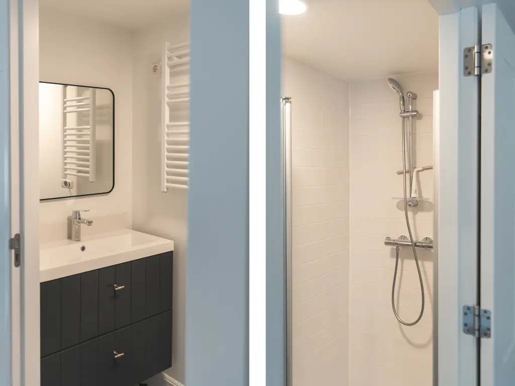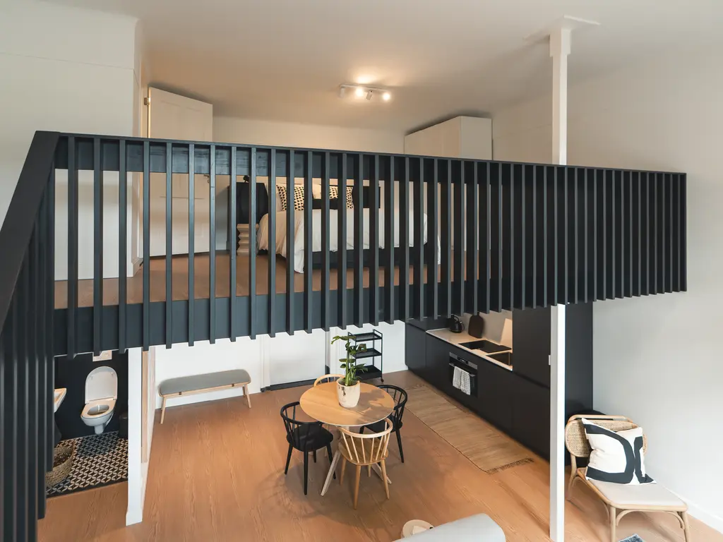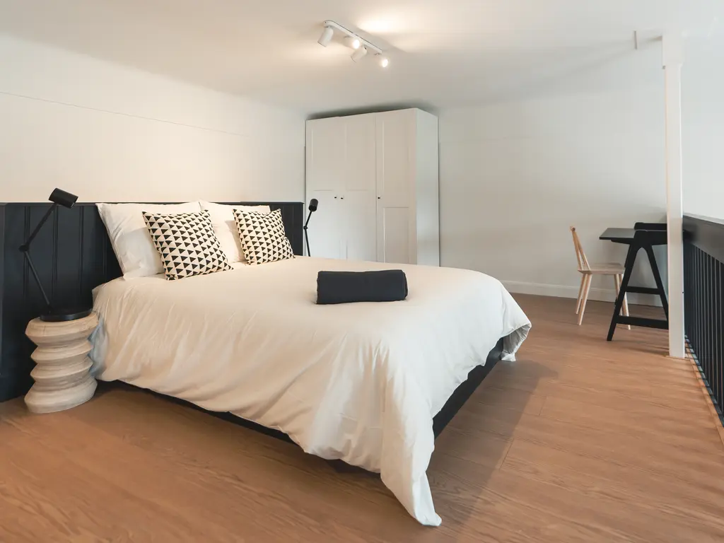 De open trap leidt naar de bovenverdieping met uitzicht op de woonruimte. Hier bevindt zich de slaapkamer, inclusief een compacte, goed ingedeelde badkamer met douche en wastafel. Plafondhoogte op deze verdieping is circa 2,40 meter.