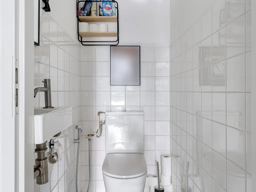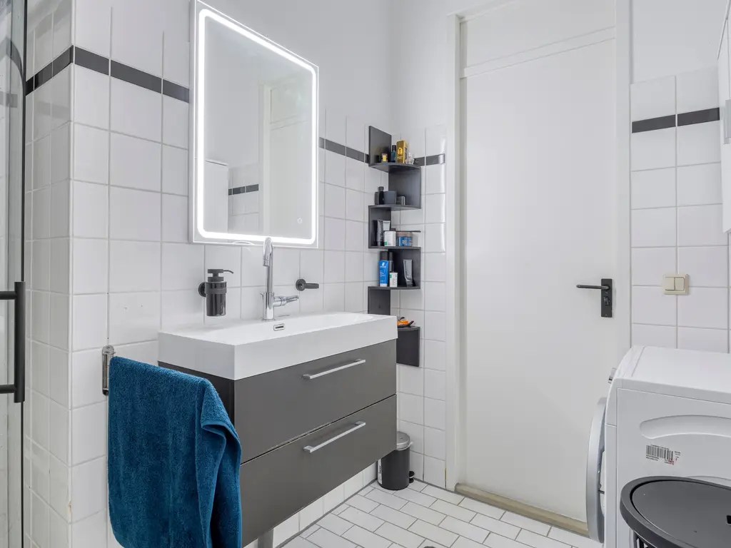 De badkamer beschikt over een douche, wastafel met meubel, extra kastruimte en een wasmachine. Daarnaast is er een apart toilet met fonteintje.
