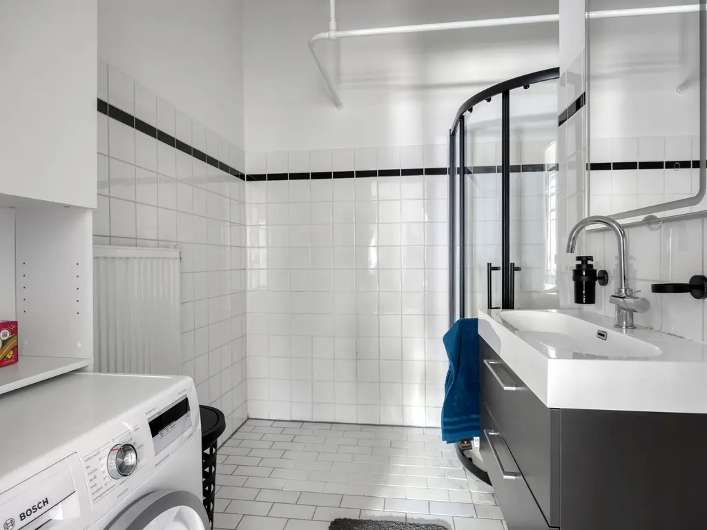 The bathroom features a shower, sink with cabinet, additional storage space and a washing machine. There is also a separate toilet with a small sink.