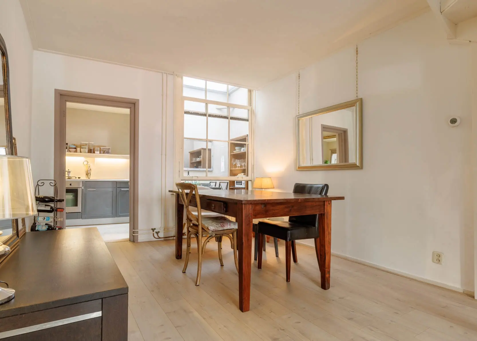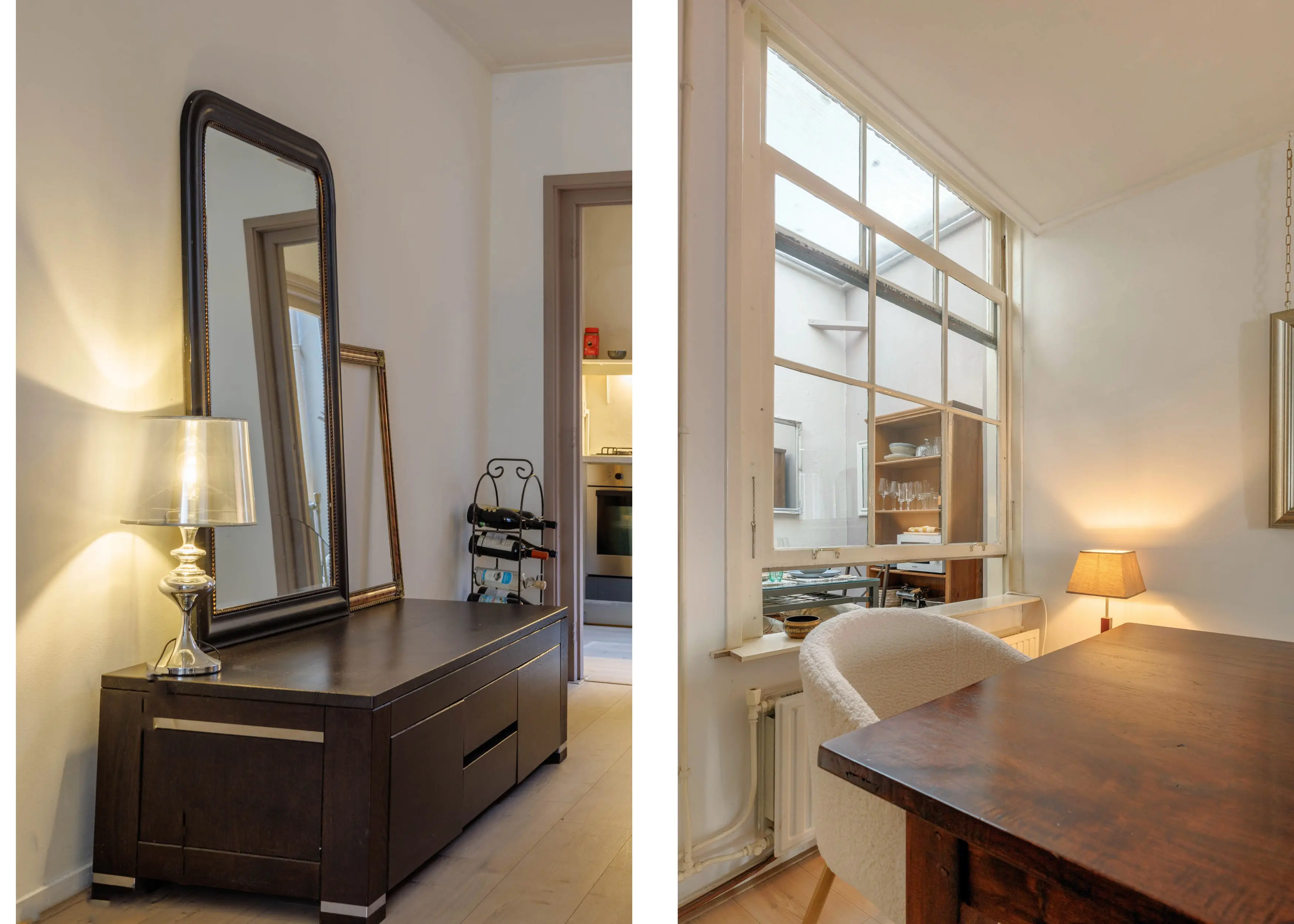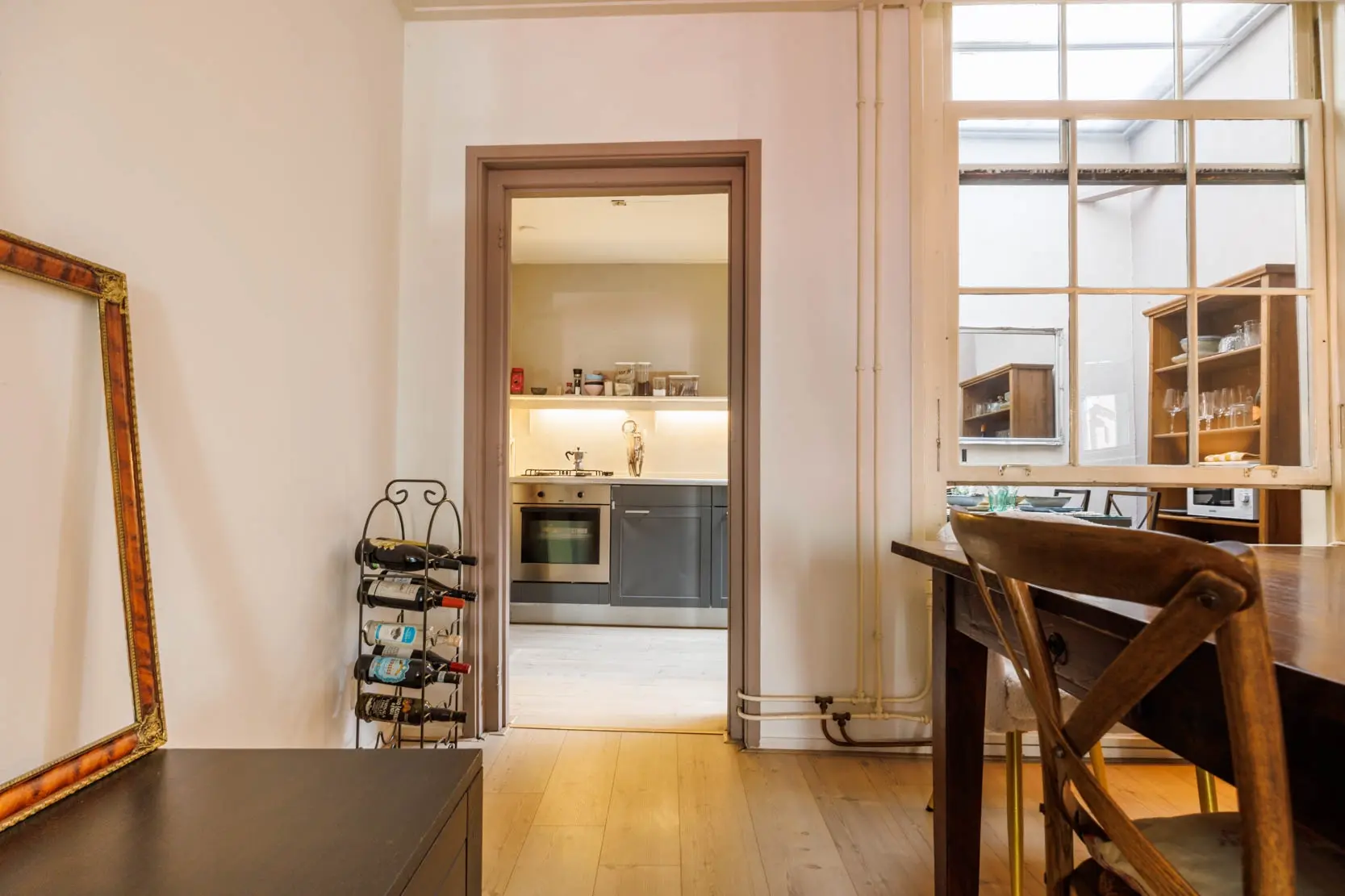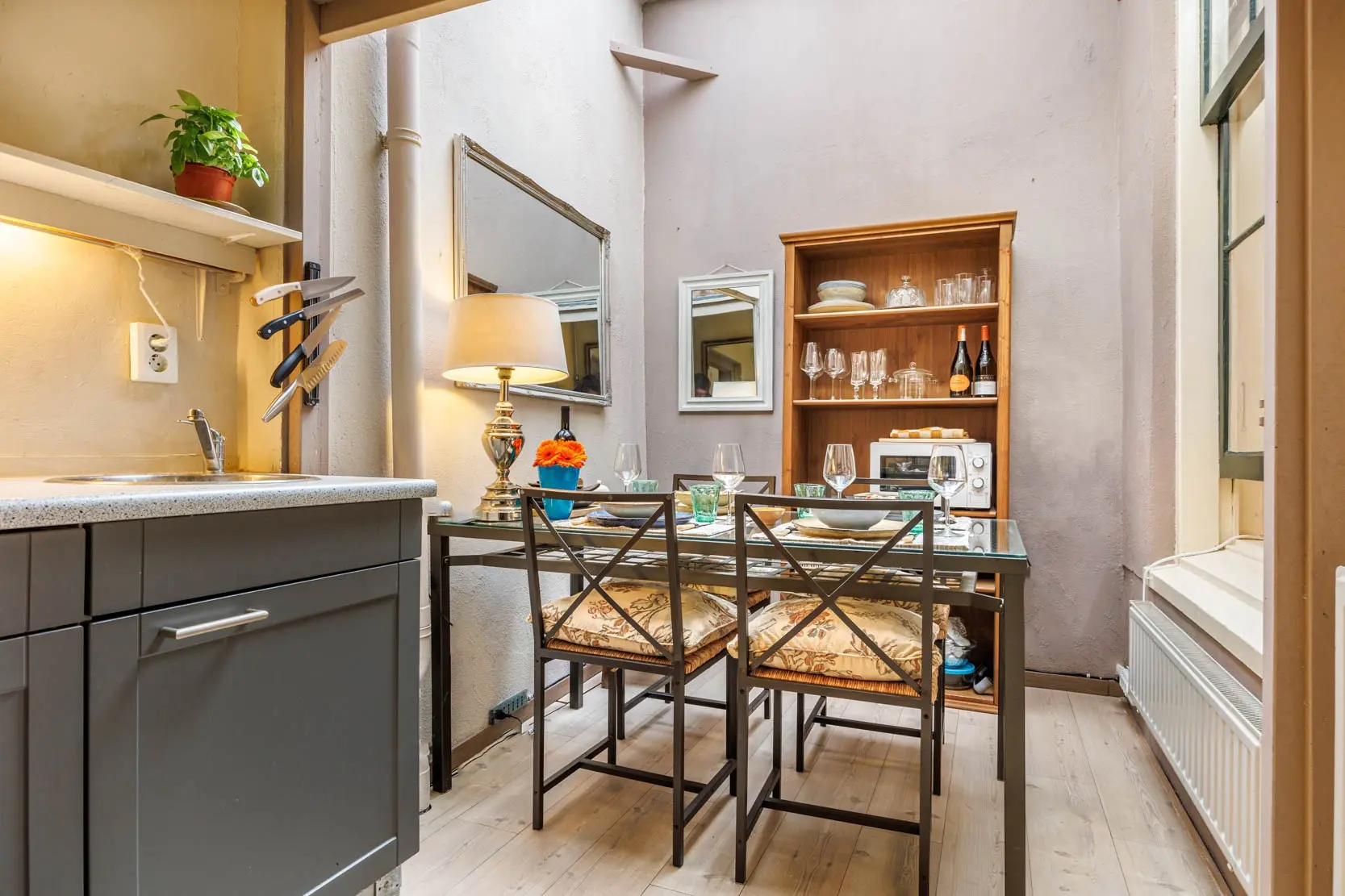 Entrance with direct access to the charming living room, which flows into the cozy kitchen-diner, situated where the courtyard used to be. Thanks to the high windows that remain between the kitchen and living room, this is now a lovely sitting area with lots of daylight. The charming kitchen includes a 4-burner gas stove, a built-in oven, and a (freestanding) microwave.