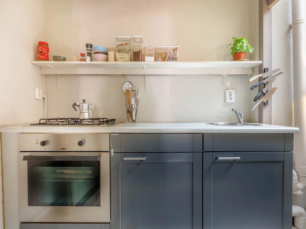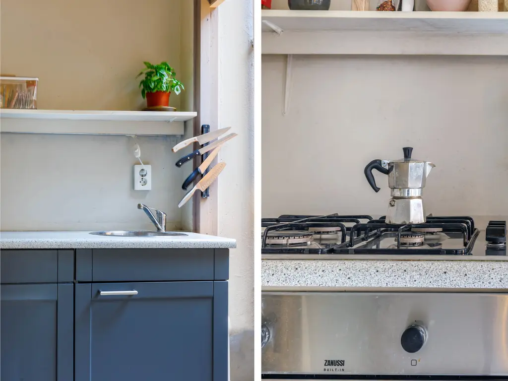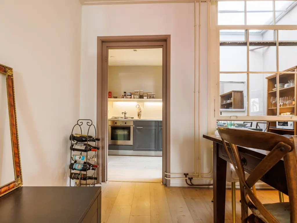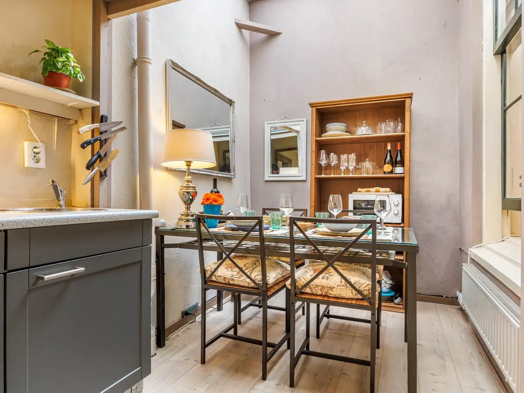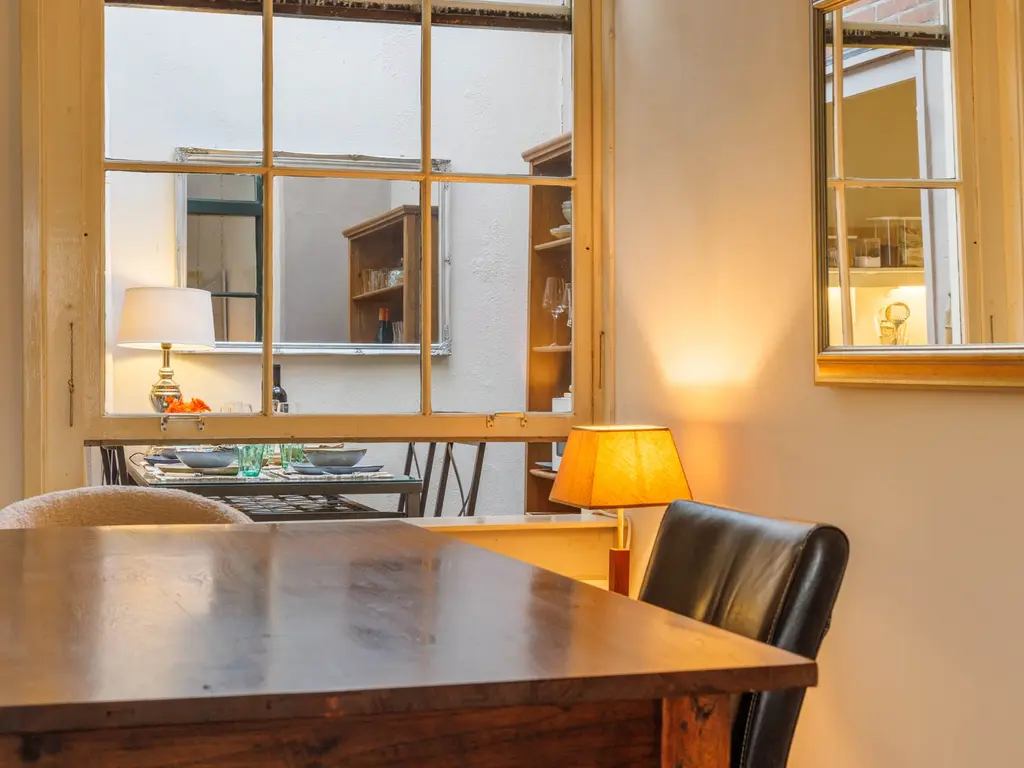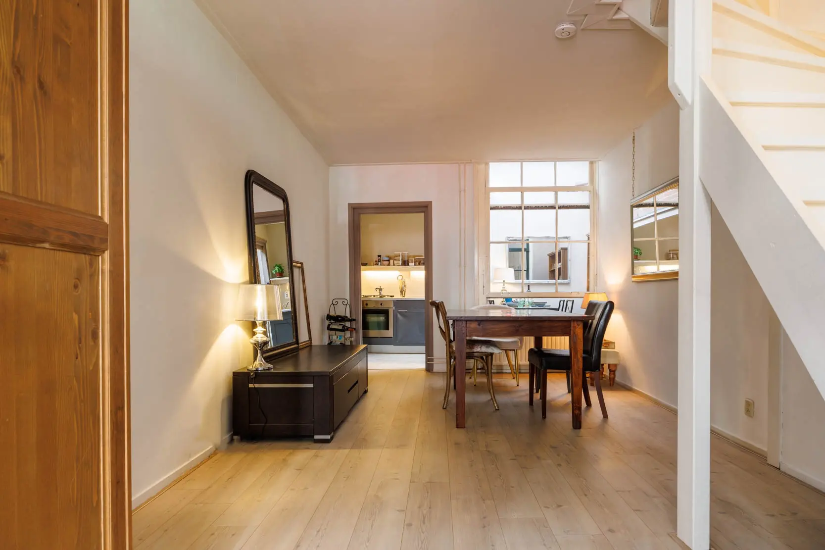 Entrance with direct access to the charming living room, which flows into the cozy kitchen-diner, situated where the courtyard used to be. Thanks to the high windows that remain between the kitchen and living room, this is now a lovely sitting area with lots of daylight. The charming kitchen includes a 4-burner gas stove, a built-in oven, and a (freestanding) microwave.