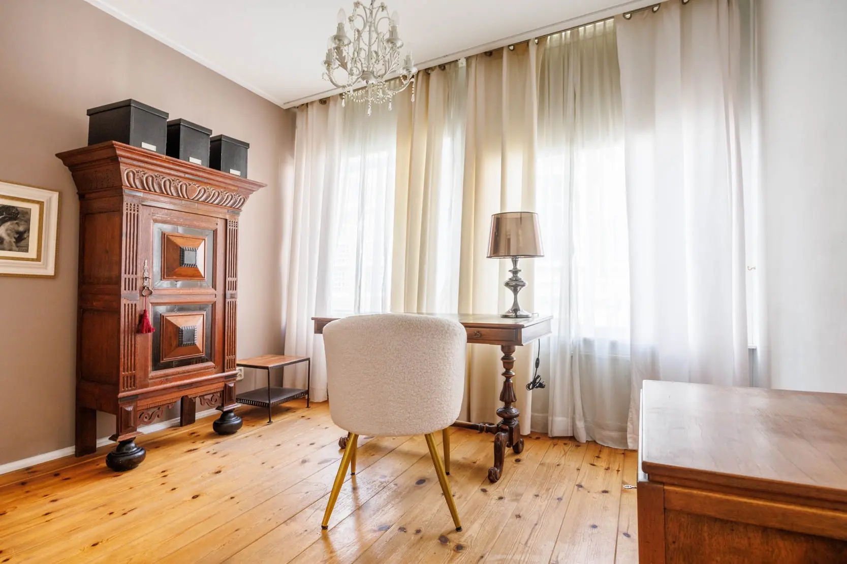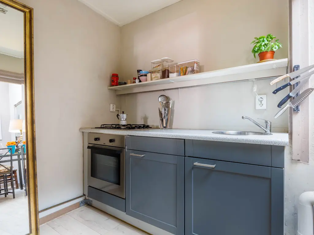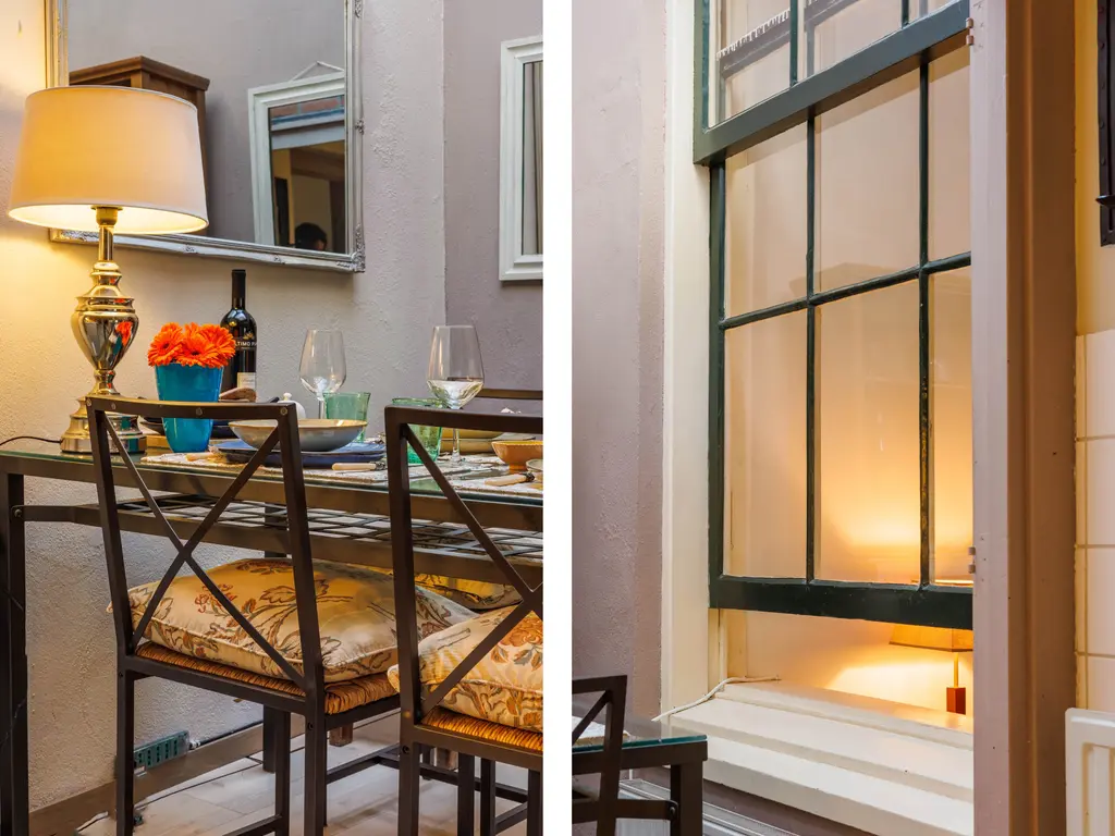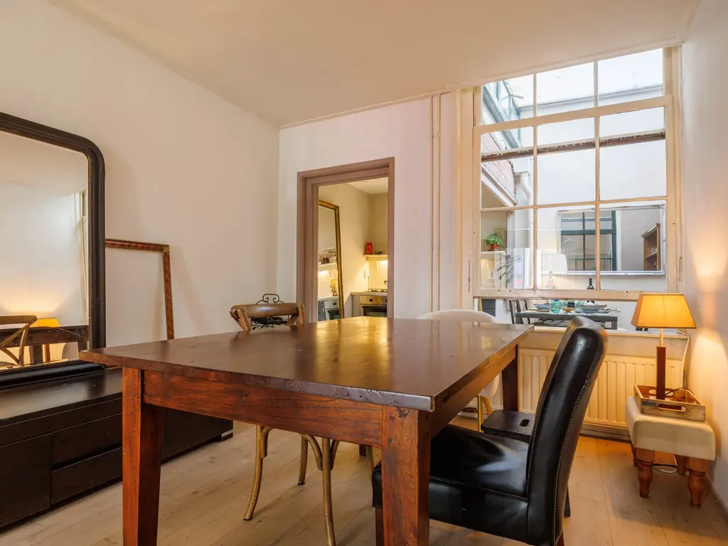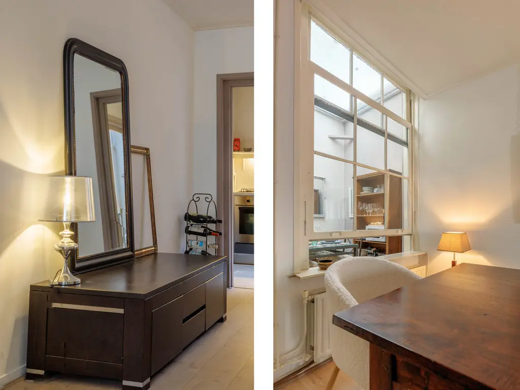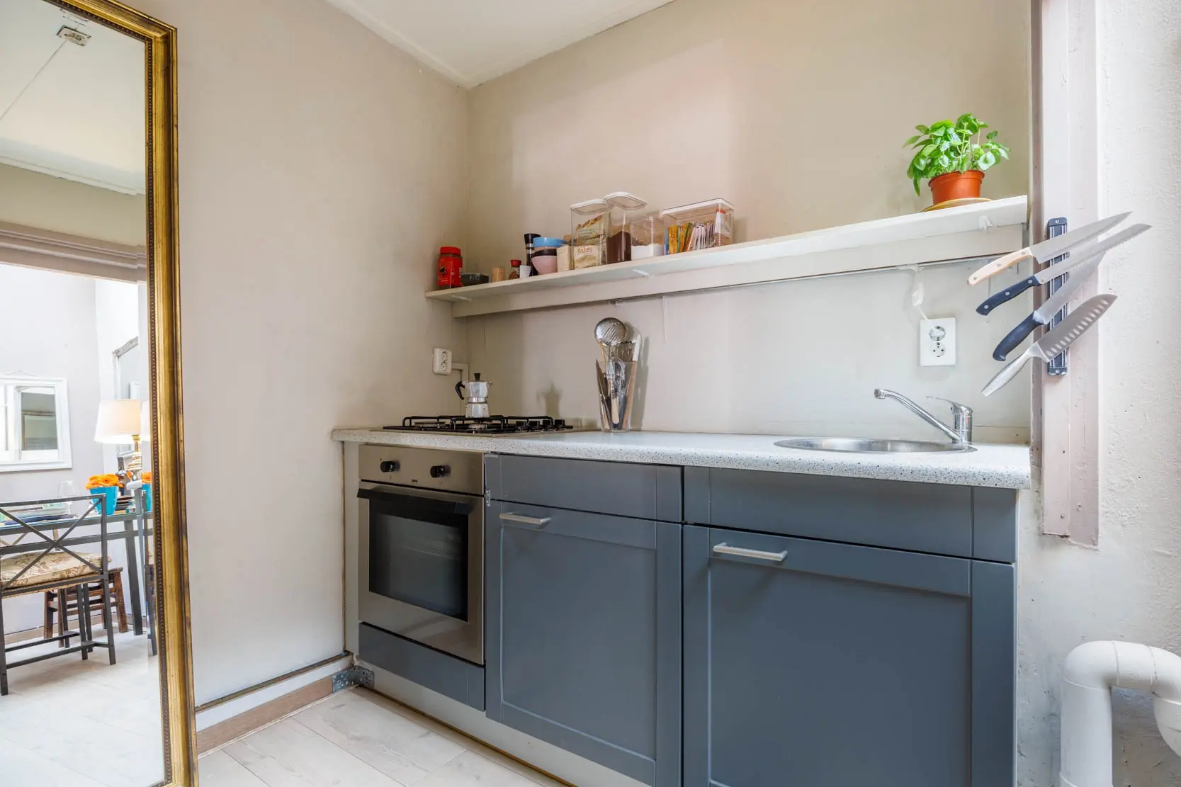 Entrance with direct access to the charming living room, which flows into the cozy kitchen-diner, situated where the courtyard used to be. Thanks to the high windows that remain between the kitchen and living room, this is now a lovely sitting area with lots of daylight. The charming kitchen includes a 4-burner gas stove, a built-in oven, and a (freestanding) microwave.