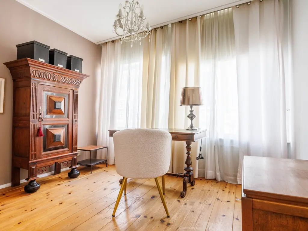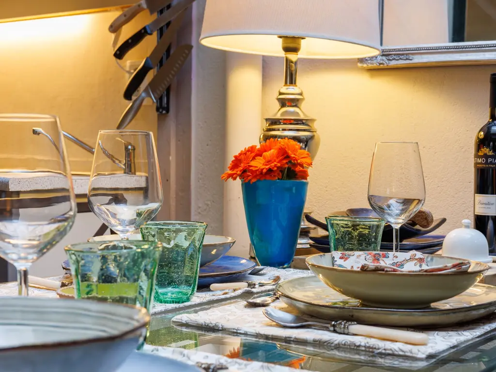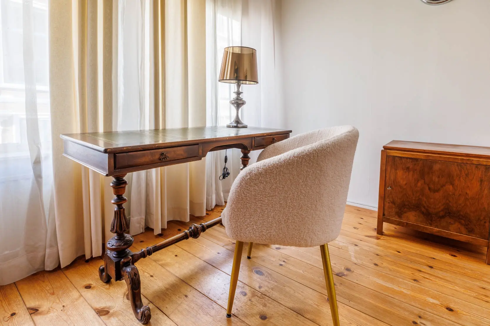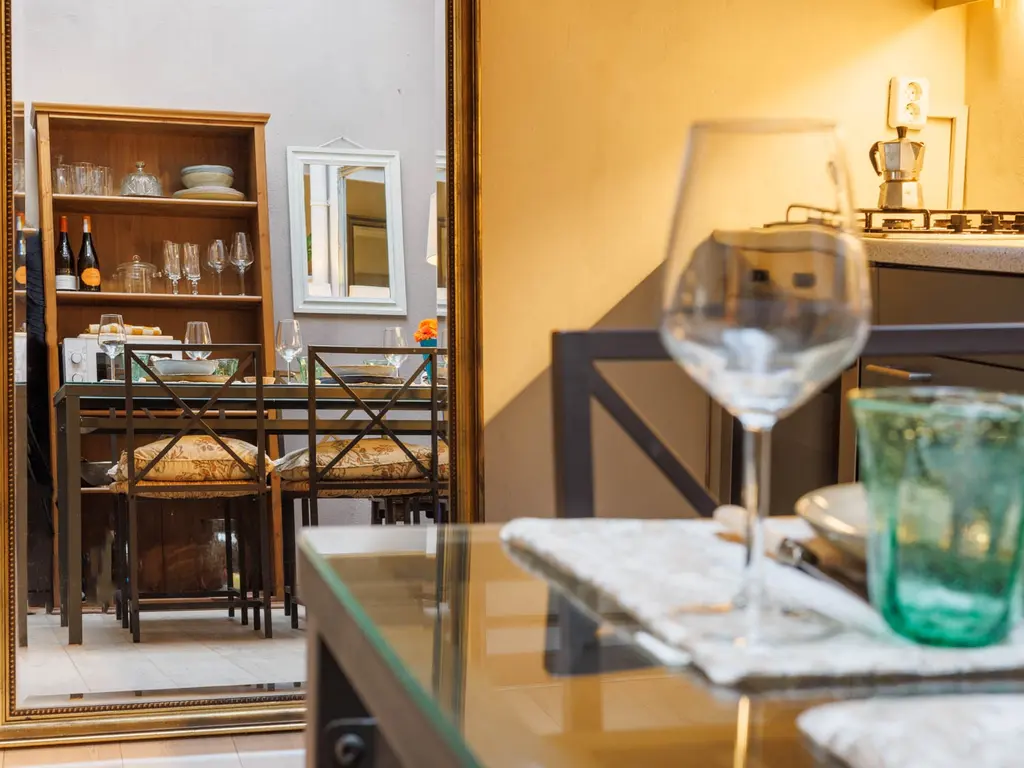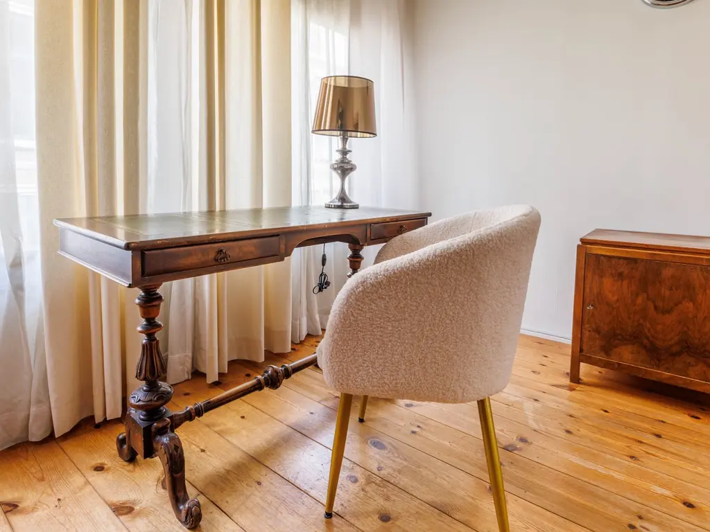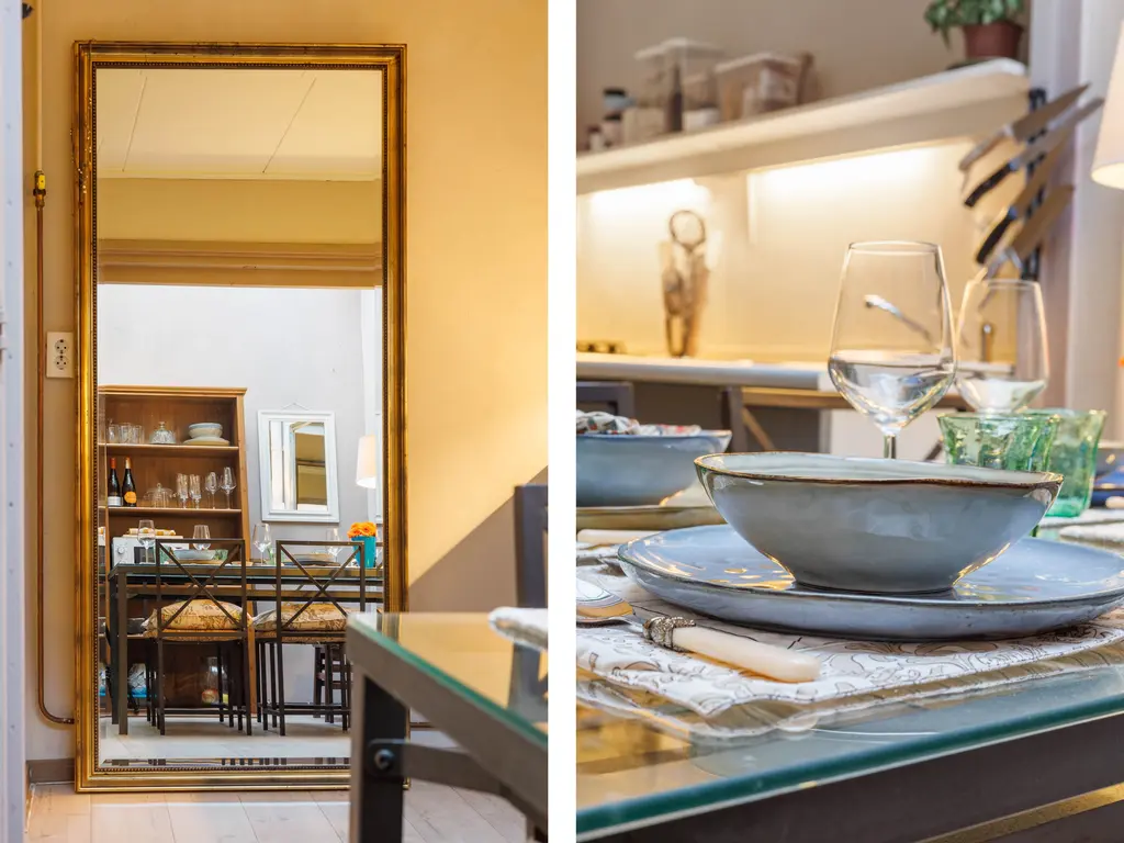 Entrance with direct access to the charming living room, which flows into the cozy kitchen-diner, situated where the courtyard used to be. Thanks to the high windows that remain between the kitchen and living room, this is now a lovely sitting area with lots of daylight. The charming kitchen includes a 4-burner gas stove, a built-in oven, and a (freestanding) microwave.