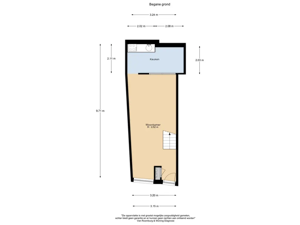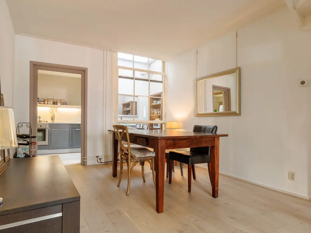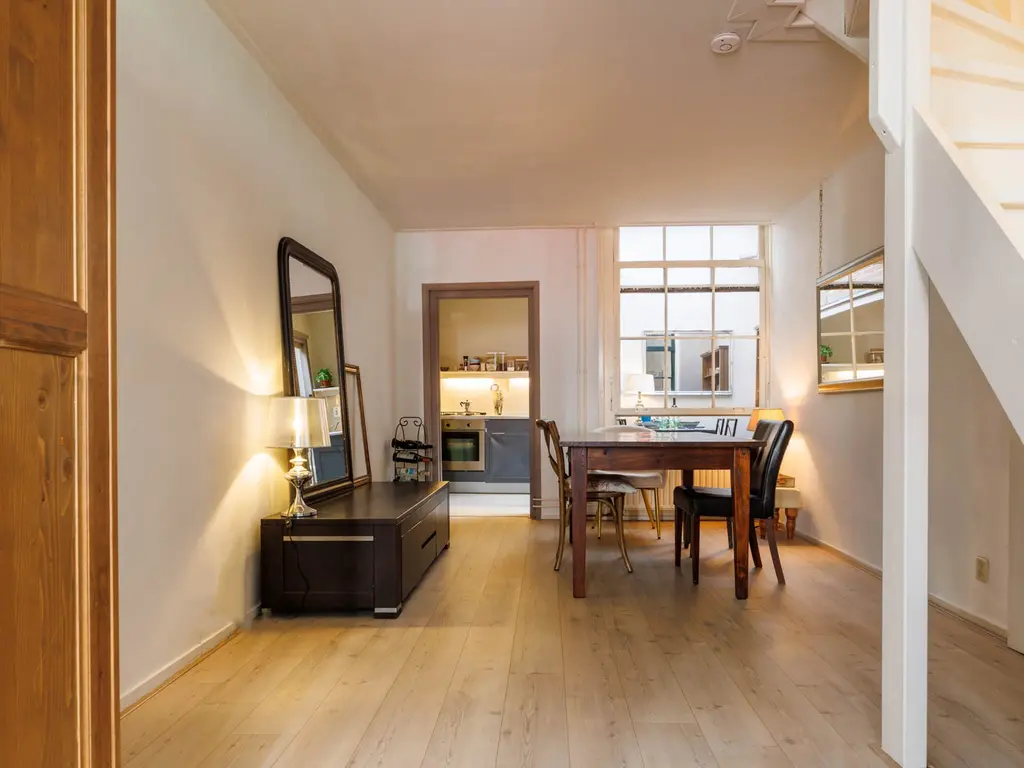 Entree met direct toegang tot de fraaie woonkamer met aansluitend de gezellige keuken met een eetgedeelte waar voorheen de binnenplaats was. Door o.a. nog de aanwezige hoge ramen naar de woonkamer is dit een heel gezellig zitgedeelte met veel daglicht. De knusse keuken beschikt o.a. over een 4-pitsgasfornuis, een inbouwoven en een (losse) magnetron.
