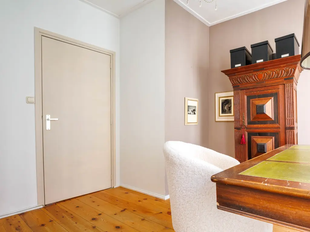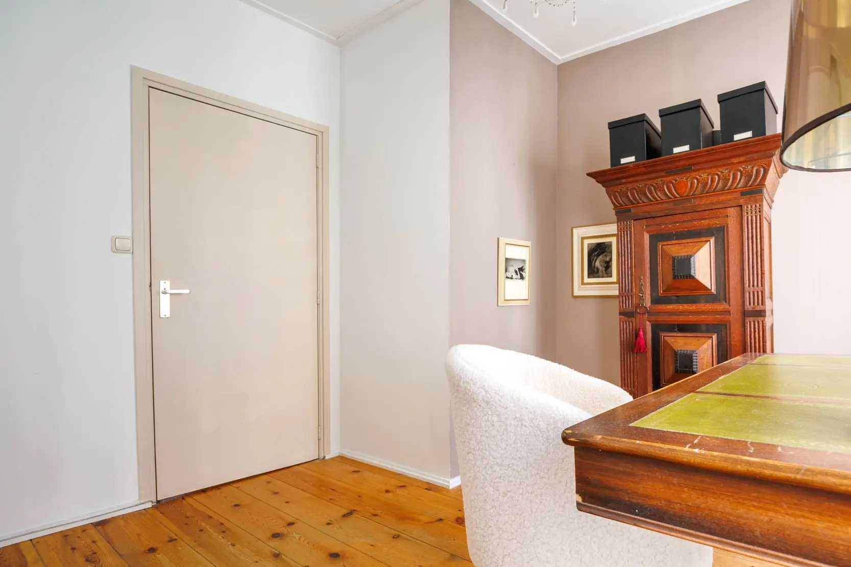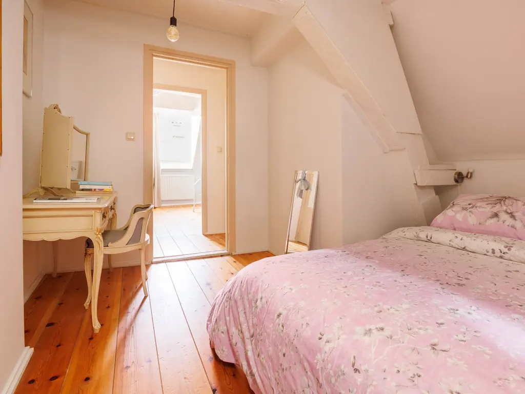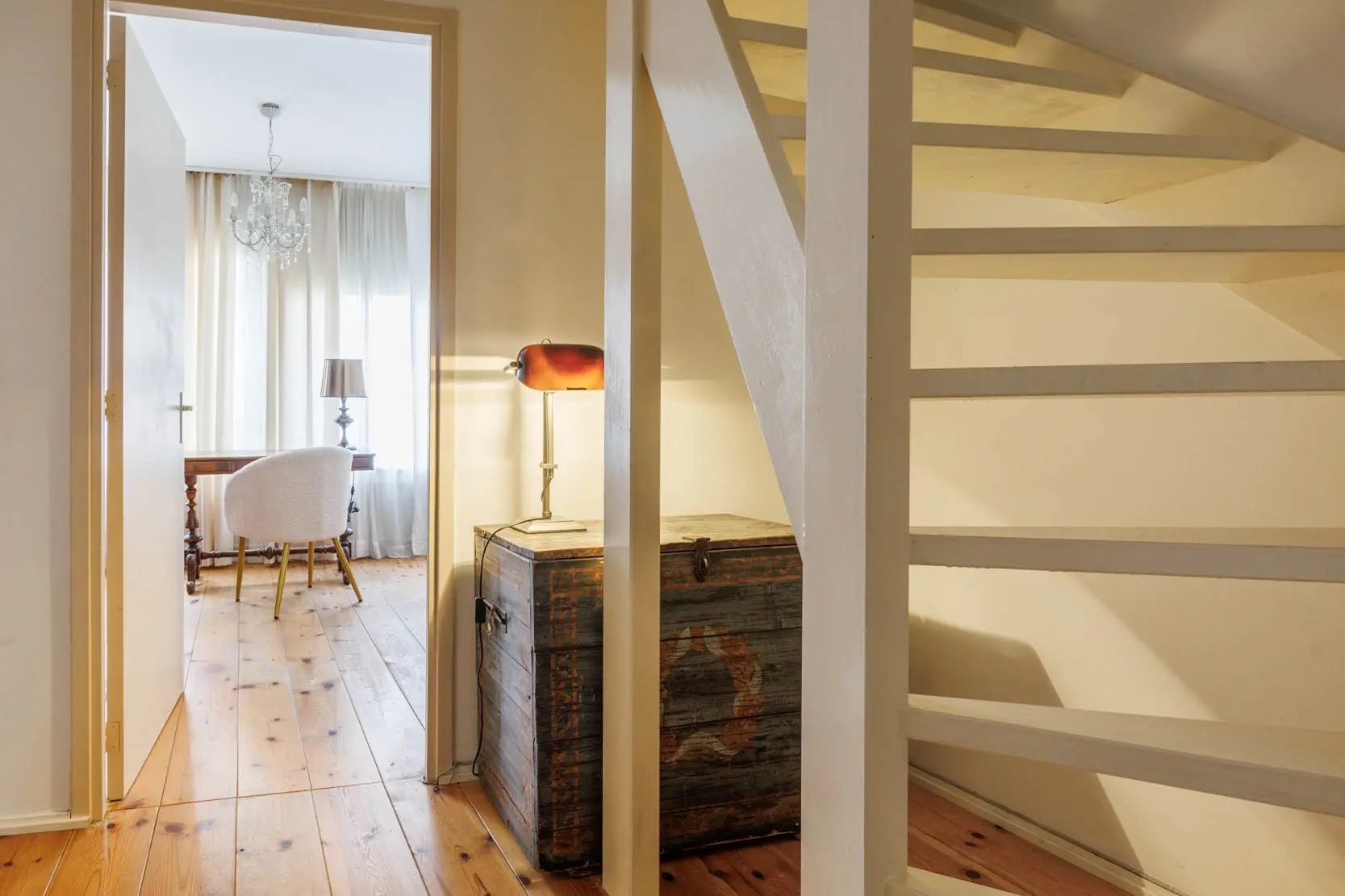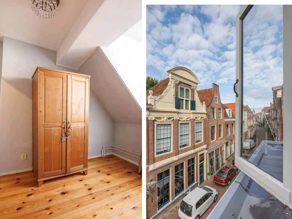 Spacious landing with access to the large (bed)room at the front, the bathroom, and a separate toilet. The bright (bed)room features beautiful large original windows offering a stunning view of the Langebrug with its many historic façades.