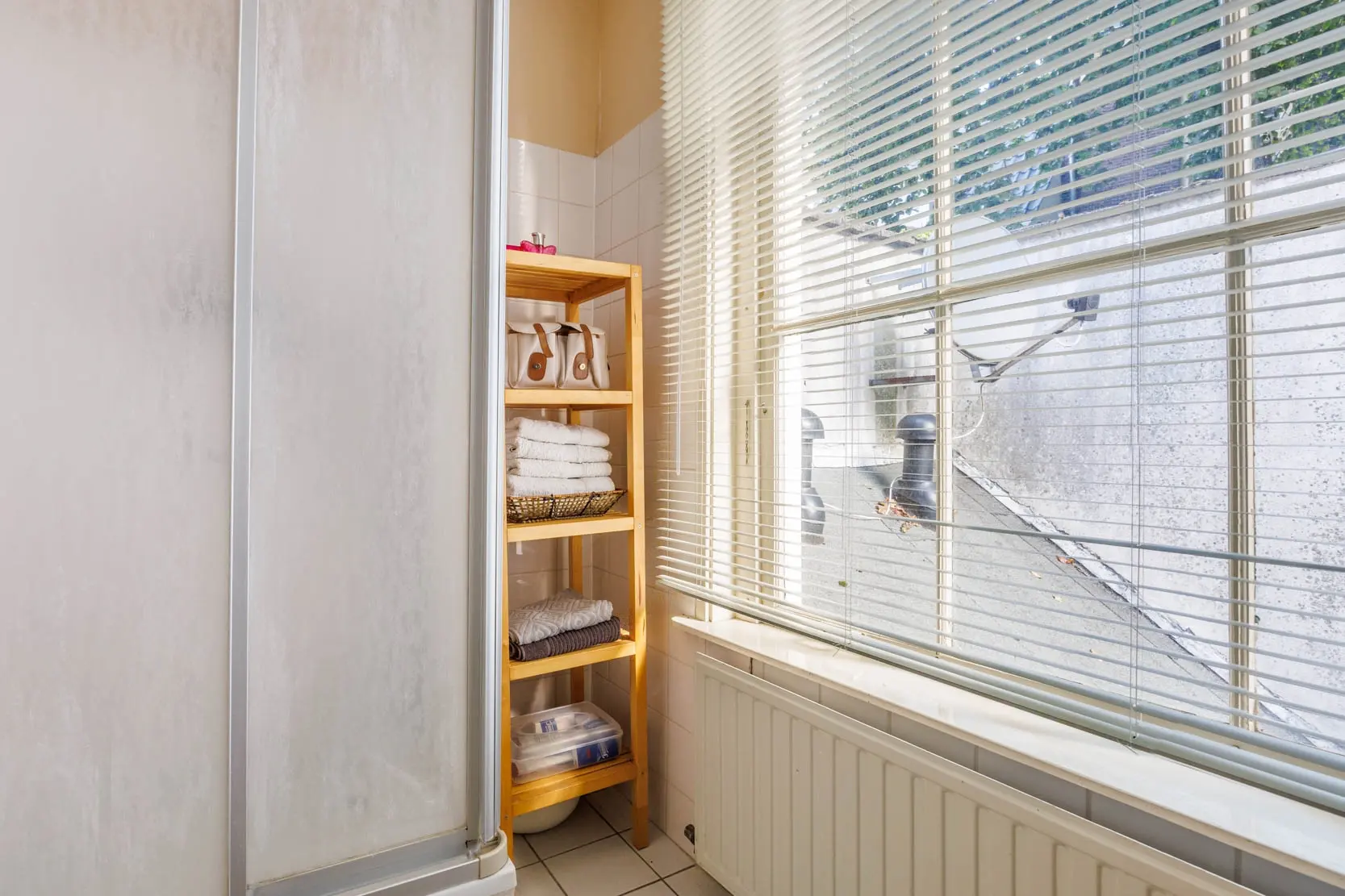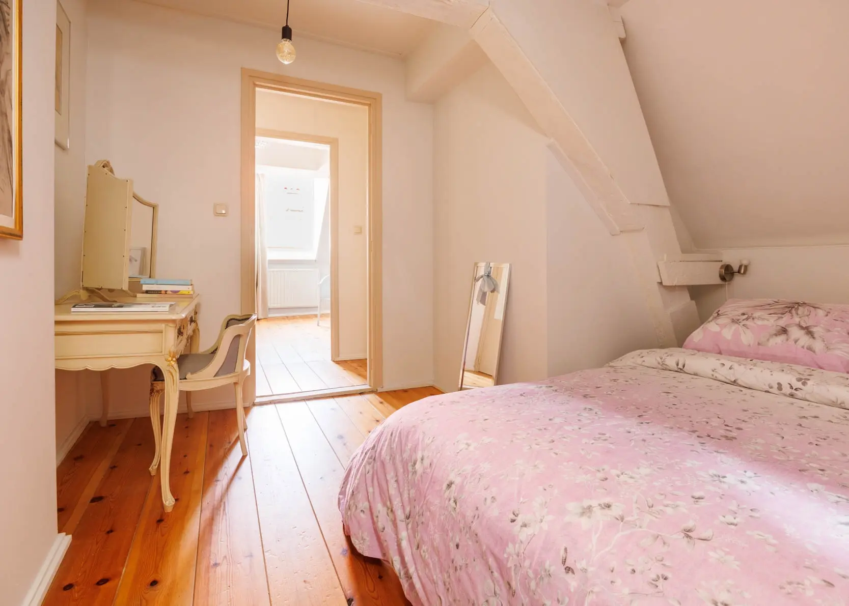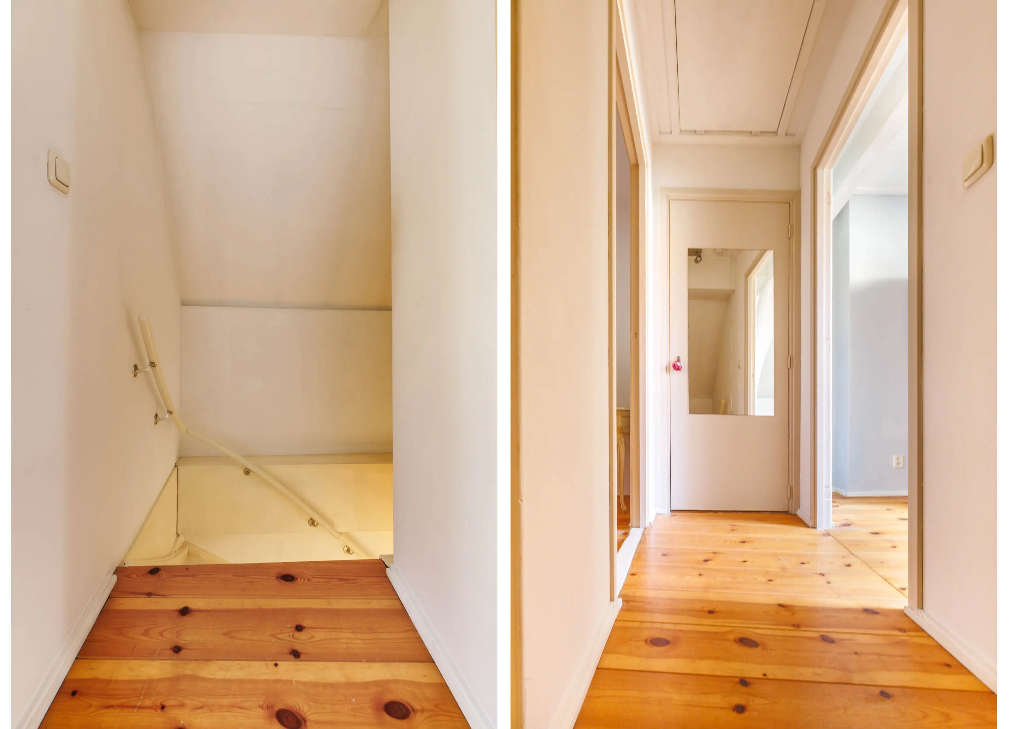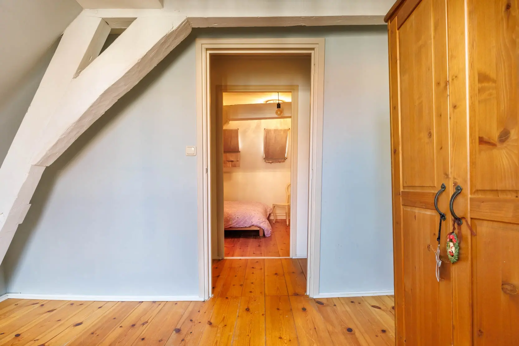 Landing with a large built-in wardrobe and access to two charming (bed)rooms. The sunny room at the front has a dormer window, and the cozy room at the back has two skylights. From the landing, a loft ladder provides access to the very spacious attic with lots of extra storage space.
