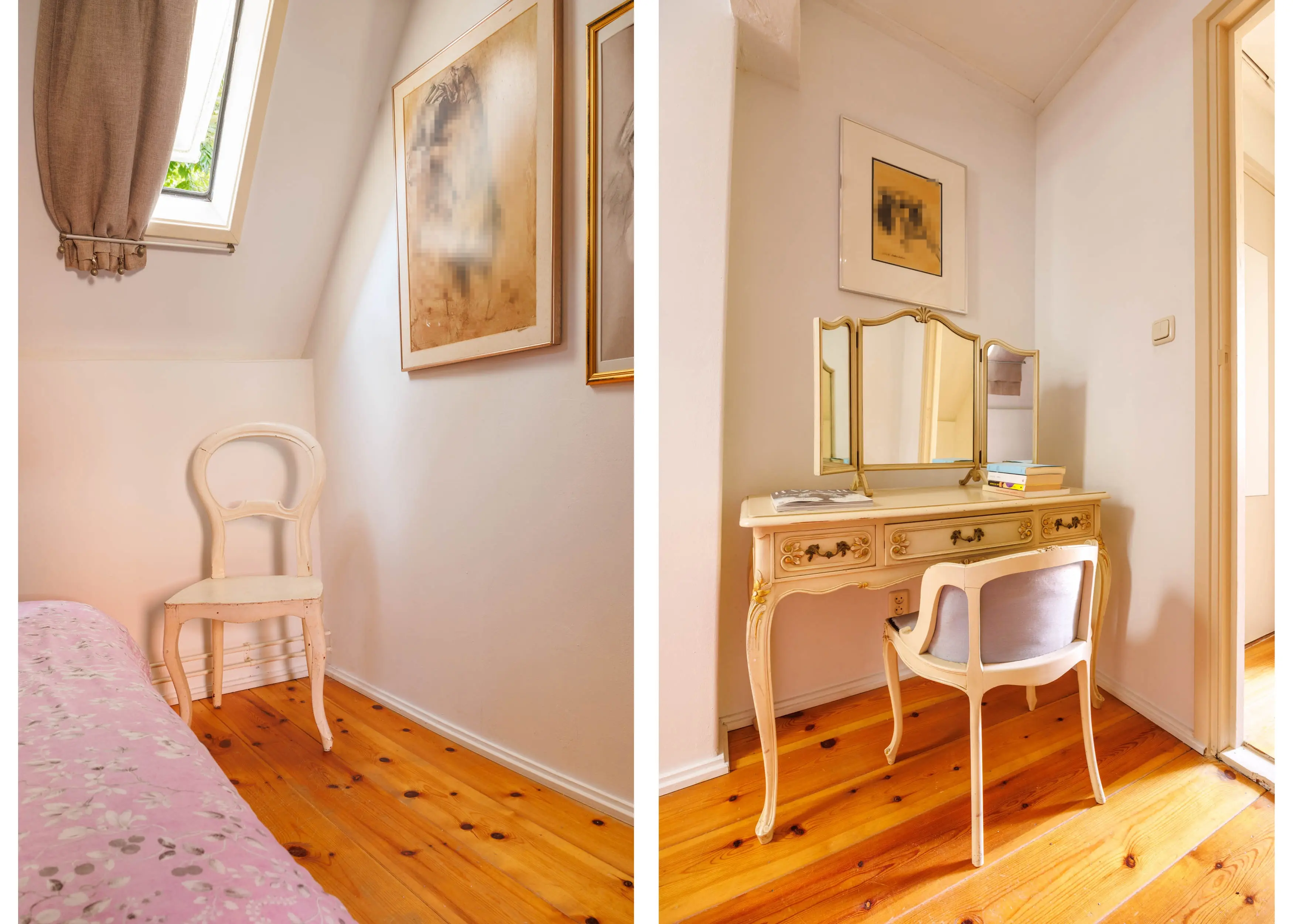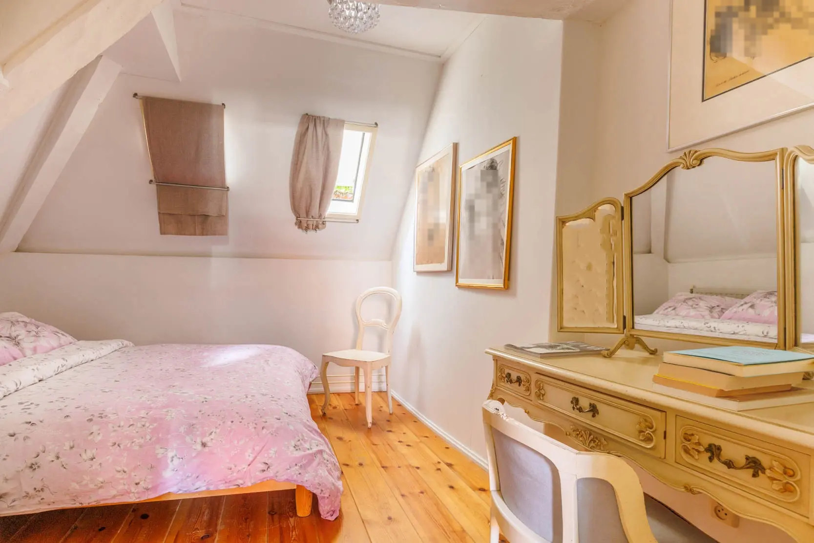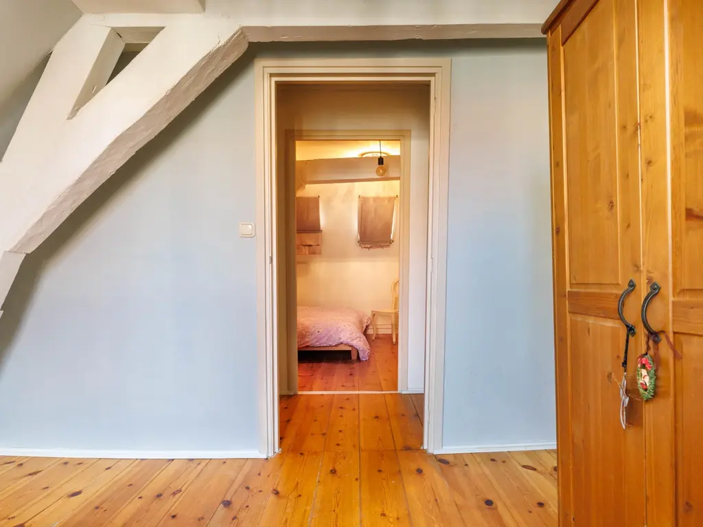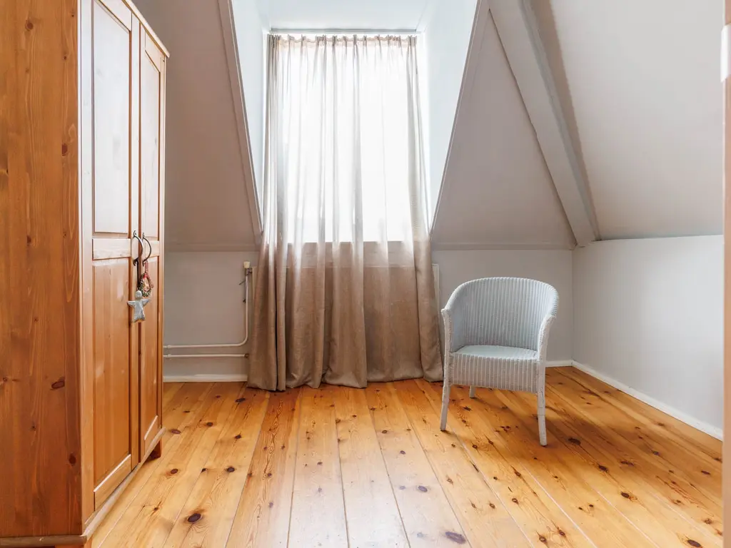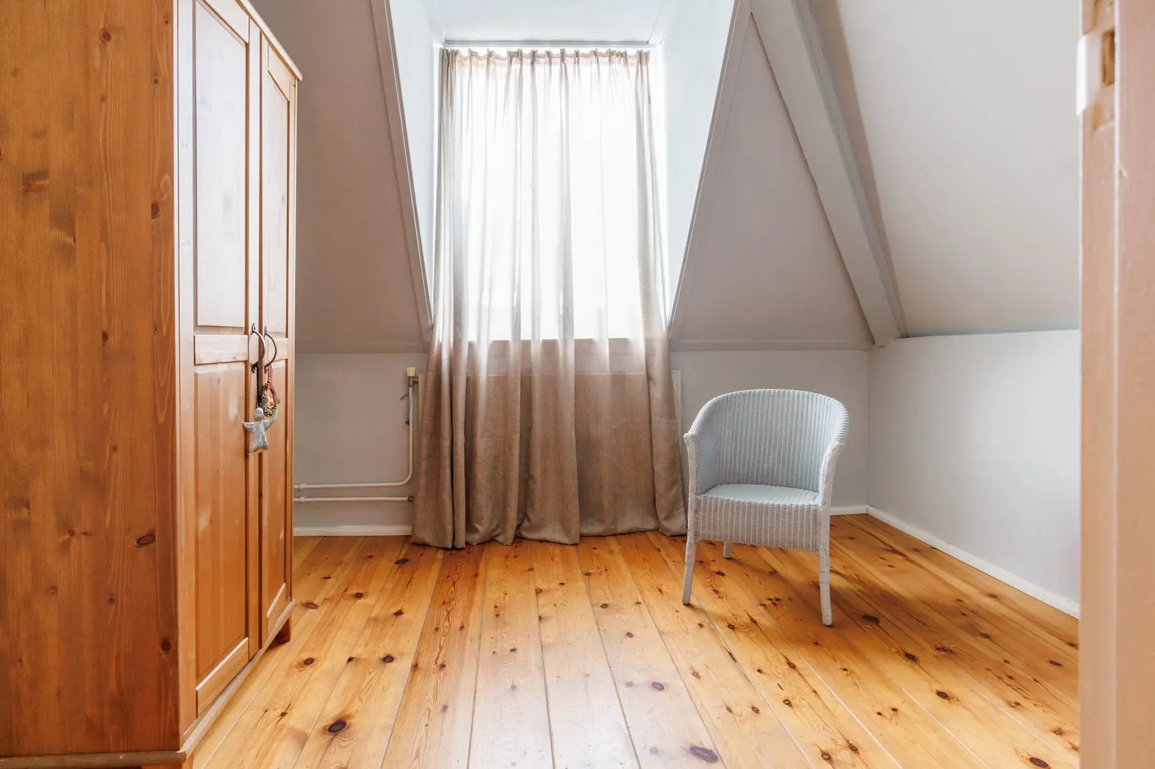 Landing with a large built-in wardrobe and access to two charming (bed)rooms. The sunny room at the front has a dormer window, and the cozy room at the back has two skylights. From the landing, a loft ladder provides access to the very spacious attic with lots of extra storage space.