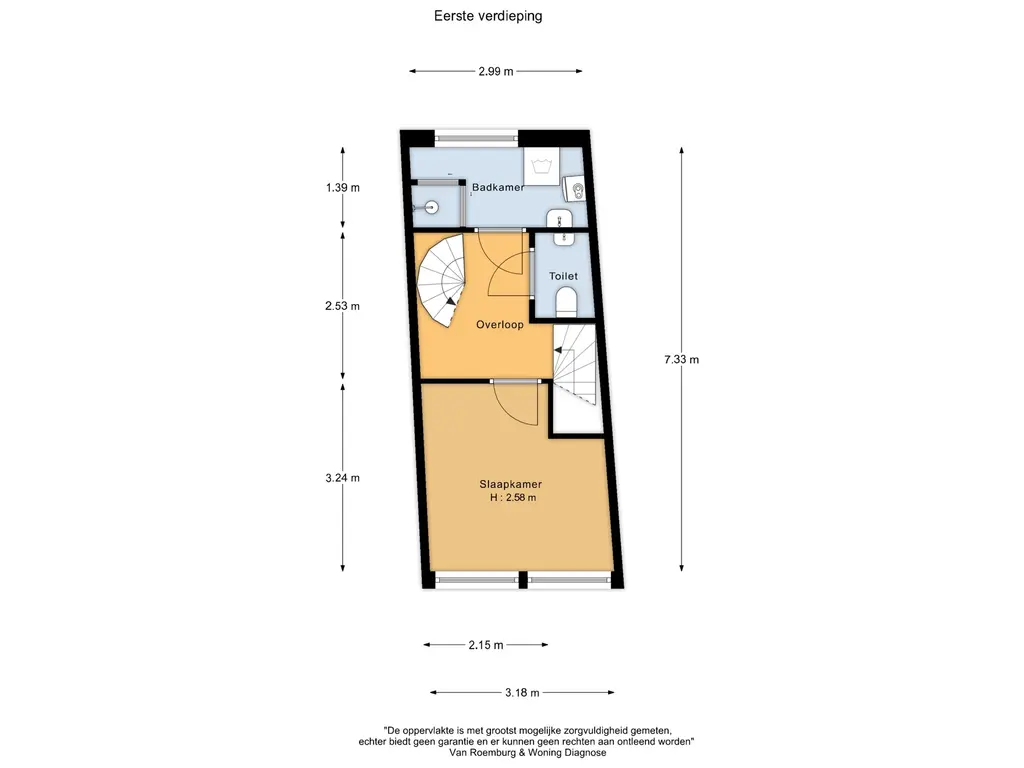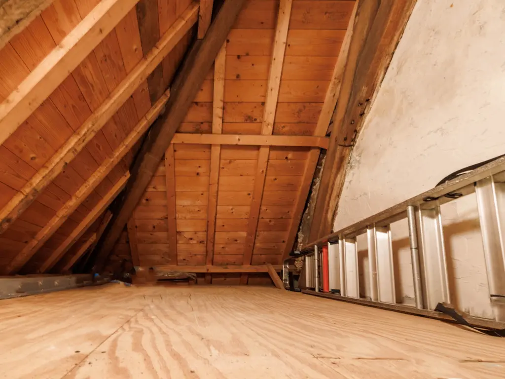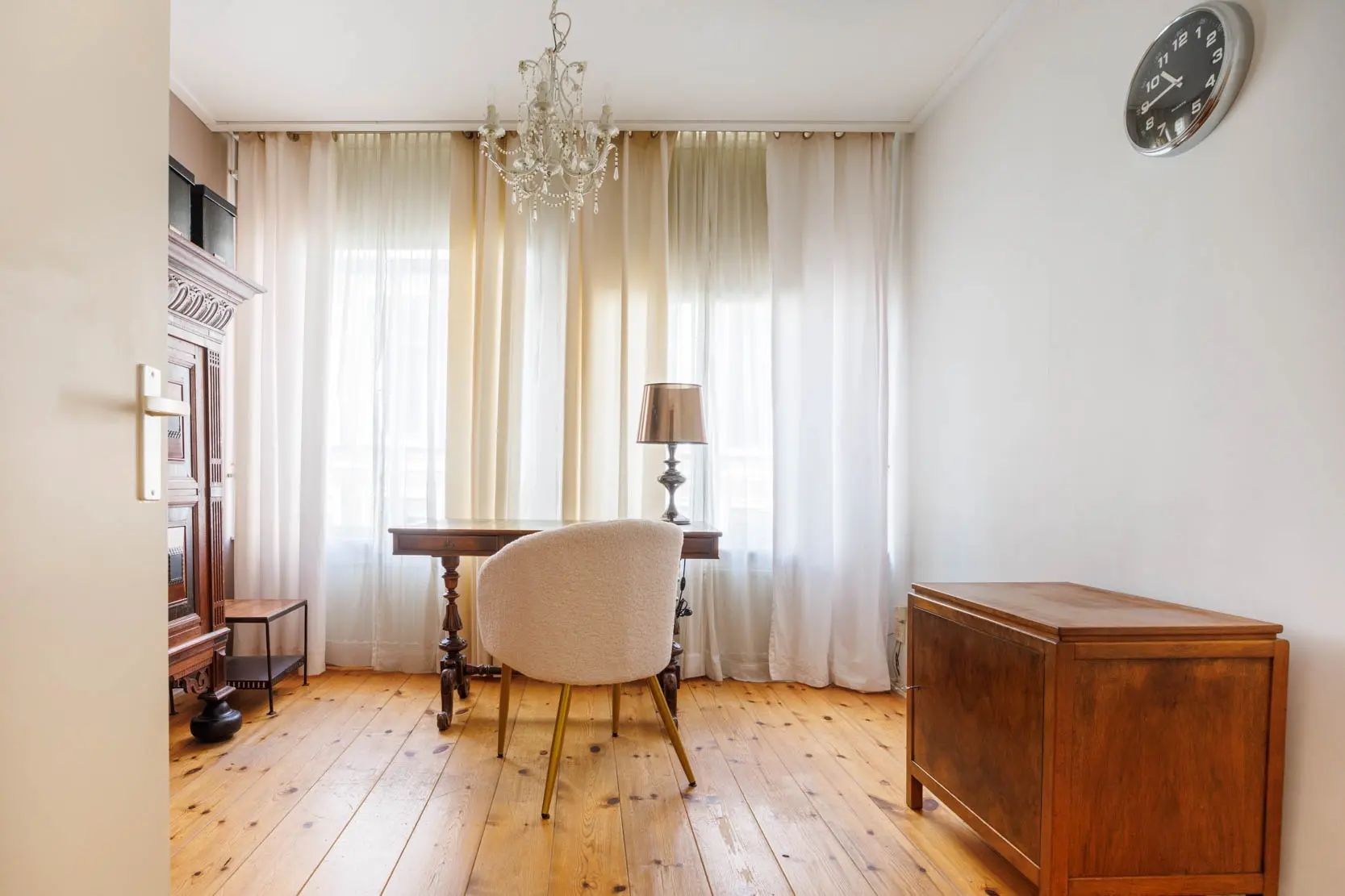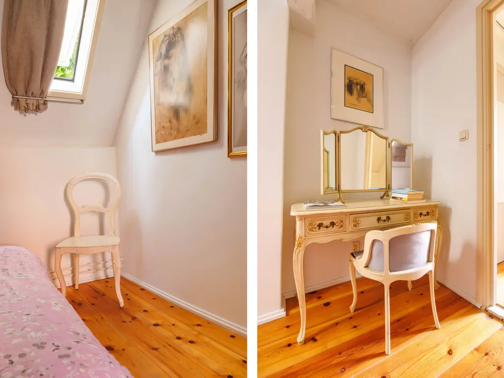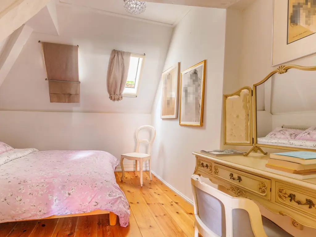 Landing with a large built-in wardrobe and access to two charming (bed)rooms. The sunny room at the front has a dormer window, and the cozy room at the back has two skylights. From the landing, a loft ladder provides access to the very spacious attic with lots of extra storage space.