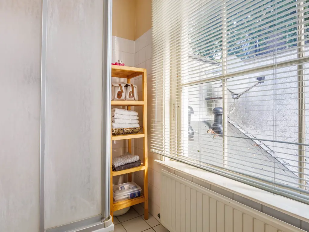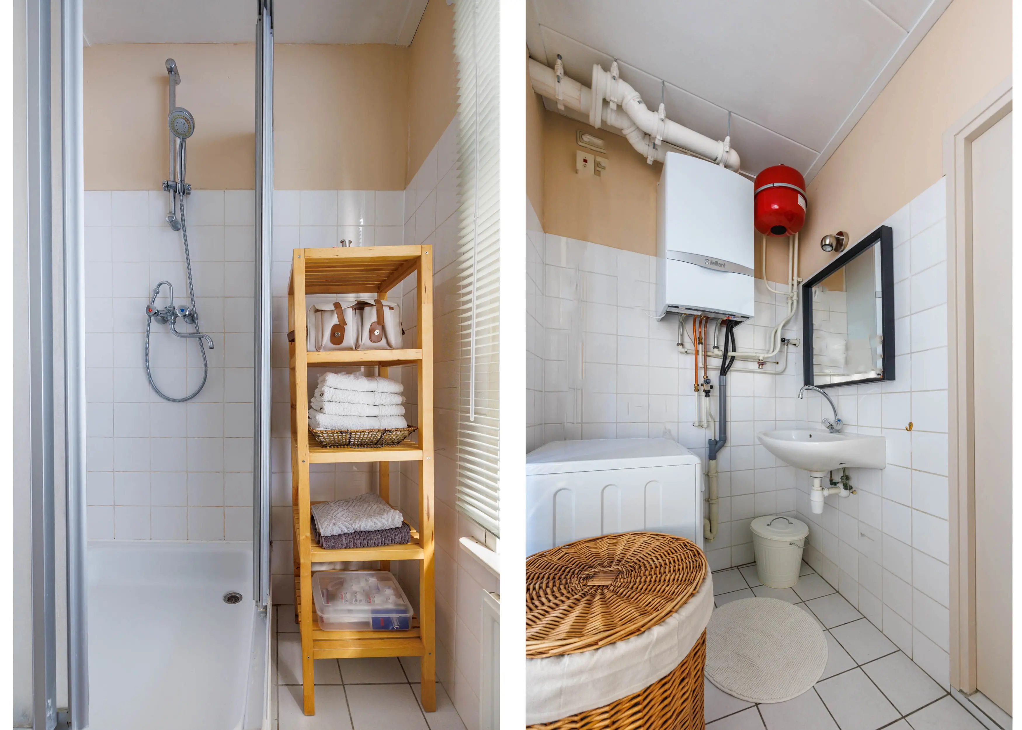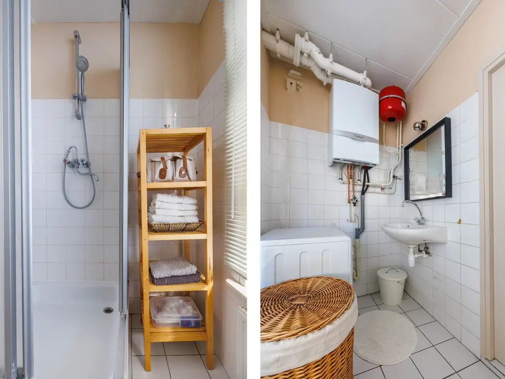 De lichte badkamer heeft een douche, een groot raam, een wastafel en een wasmachine aansluiting. Hier bevindt zich tevens de CV- ketel. Aan de overloop is een separaat toilet met fonteintje.