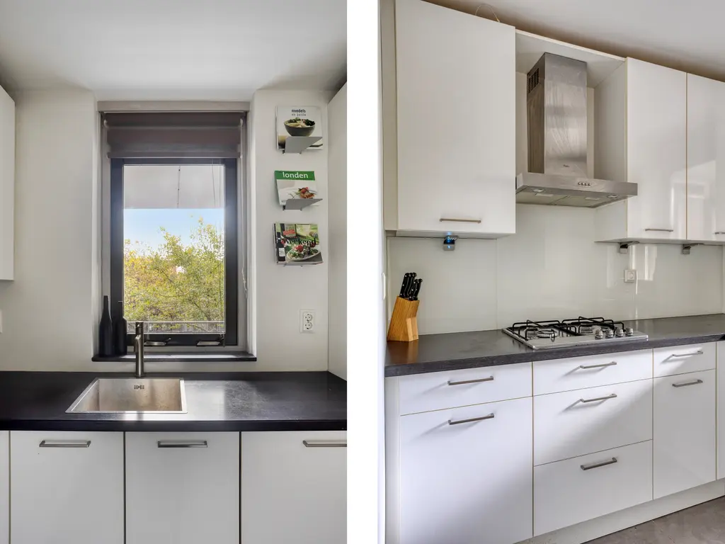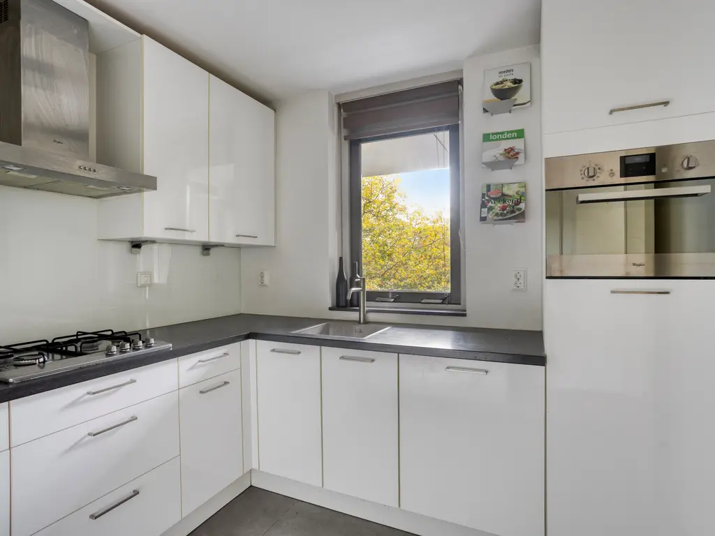 De ruime hal geeft toegang tot alle vertrekken. De lichte woonkamer vormt het hart van het appartement. Grote raampartijen zorgen voor een prettige lichtinval en een open sfeer. De moderne keuken is voorzien van diverse inbouwapparatuur, waaronder een 4-pits gasfornuis, afzuigkap, vaatwasser, oven, koelkast en vriezer.