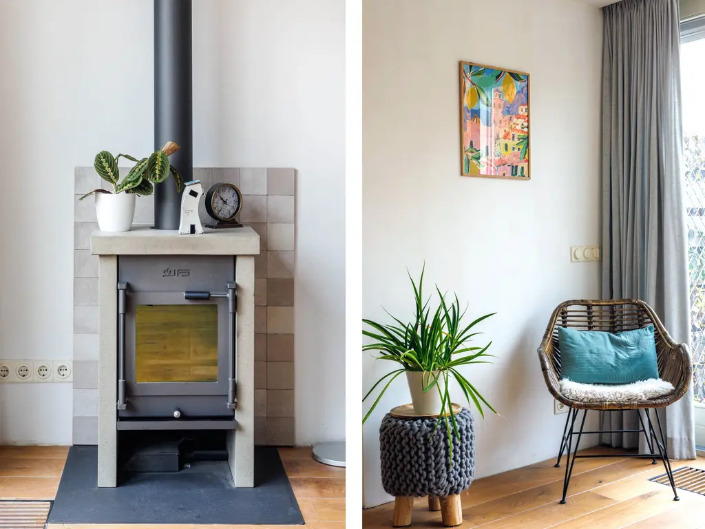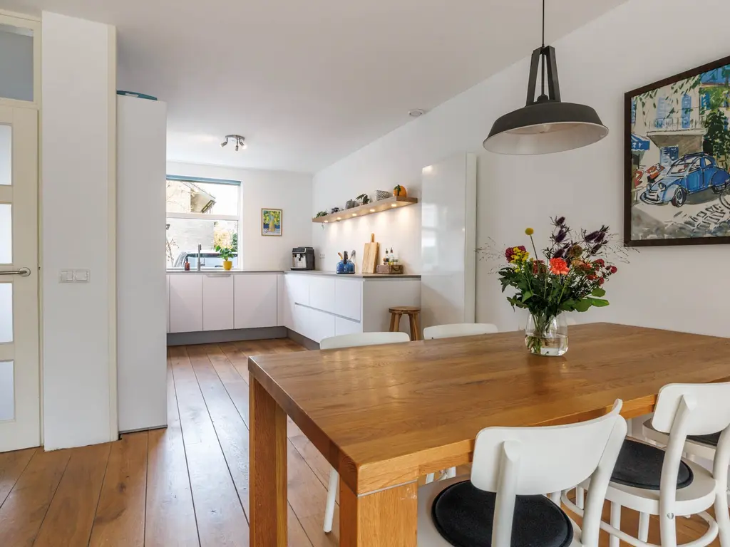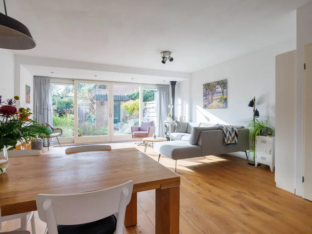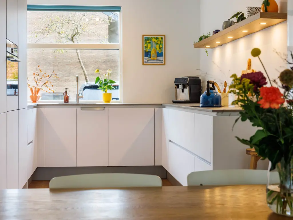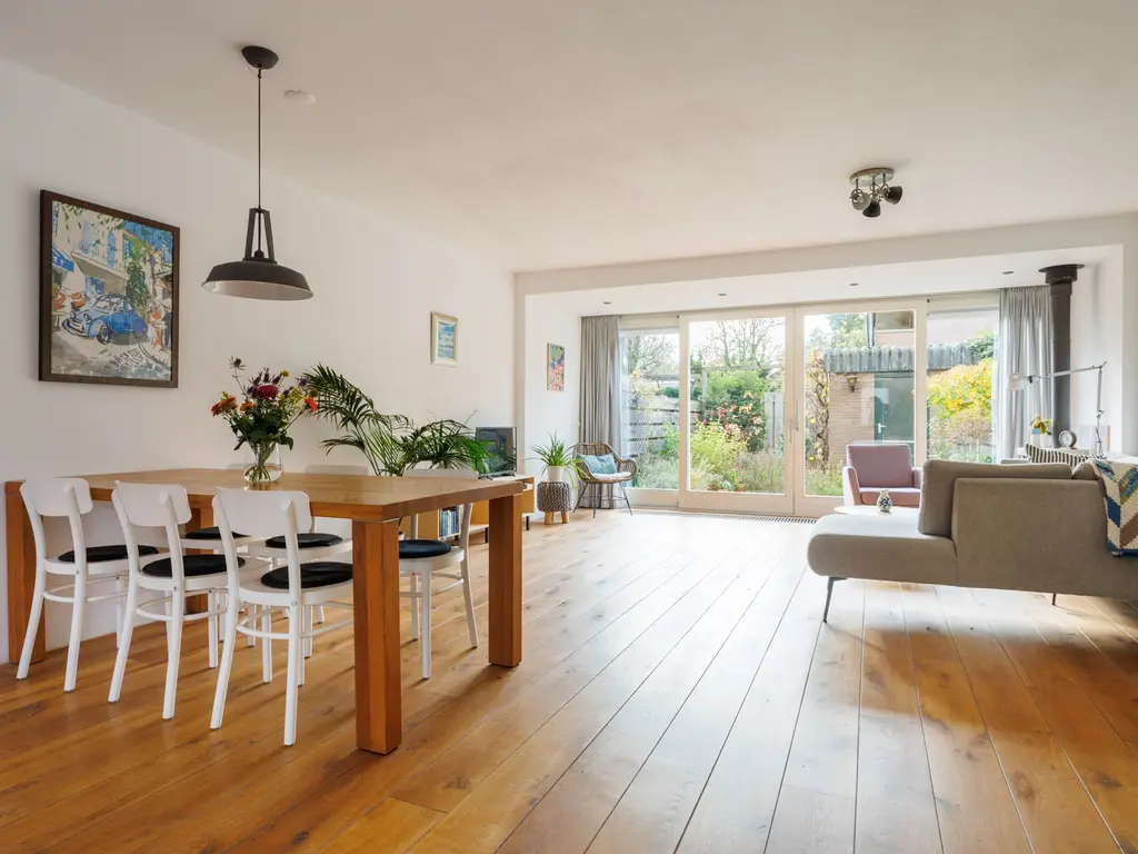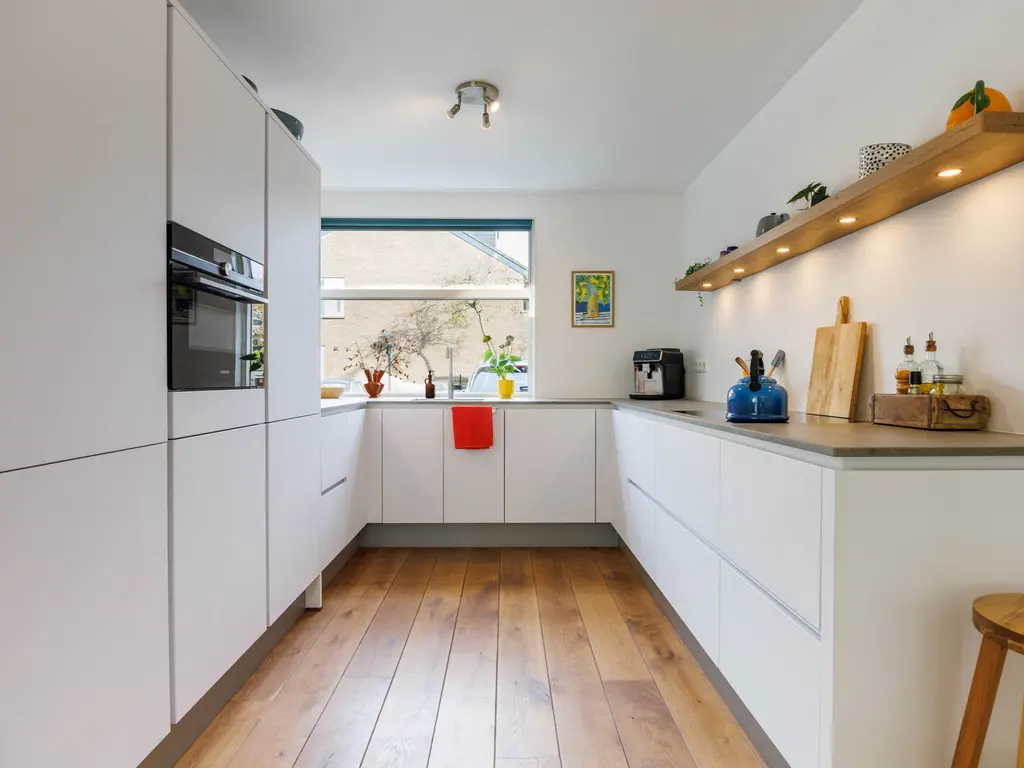 Entrance into a spacious hallway with a toilet and sink, and access to the beautiful extended living room. The floor is finished with solid oak parquet. For both warmth and atmosphere, there is a soapstone wood-burning stove that heats the entire space efficiently. The extension features large sliding doors to the south-facing garden, allowing plenty of natural light to fill the room. The generous and modern kitchen is equipped with a Dekton worktop and various built-in appliances, including an induction hob with integrated extractor, a combination steam oven/microwave, a dishwasher, and a fridge-freezer.