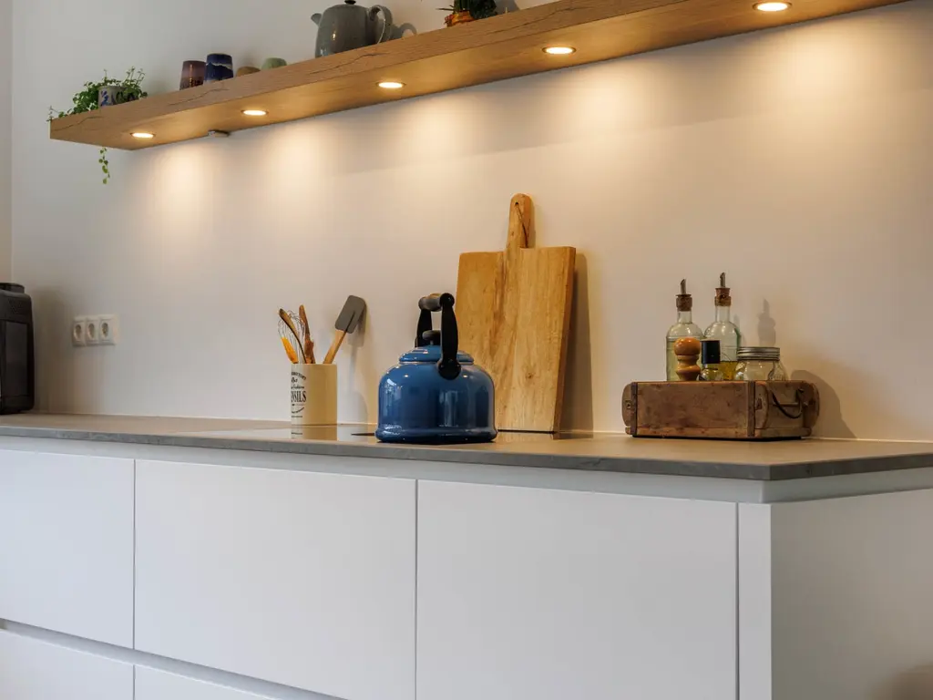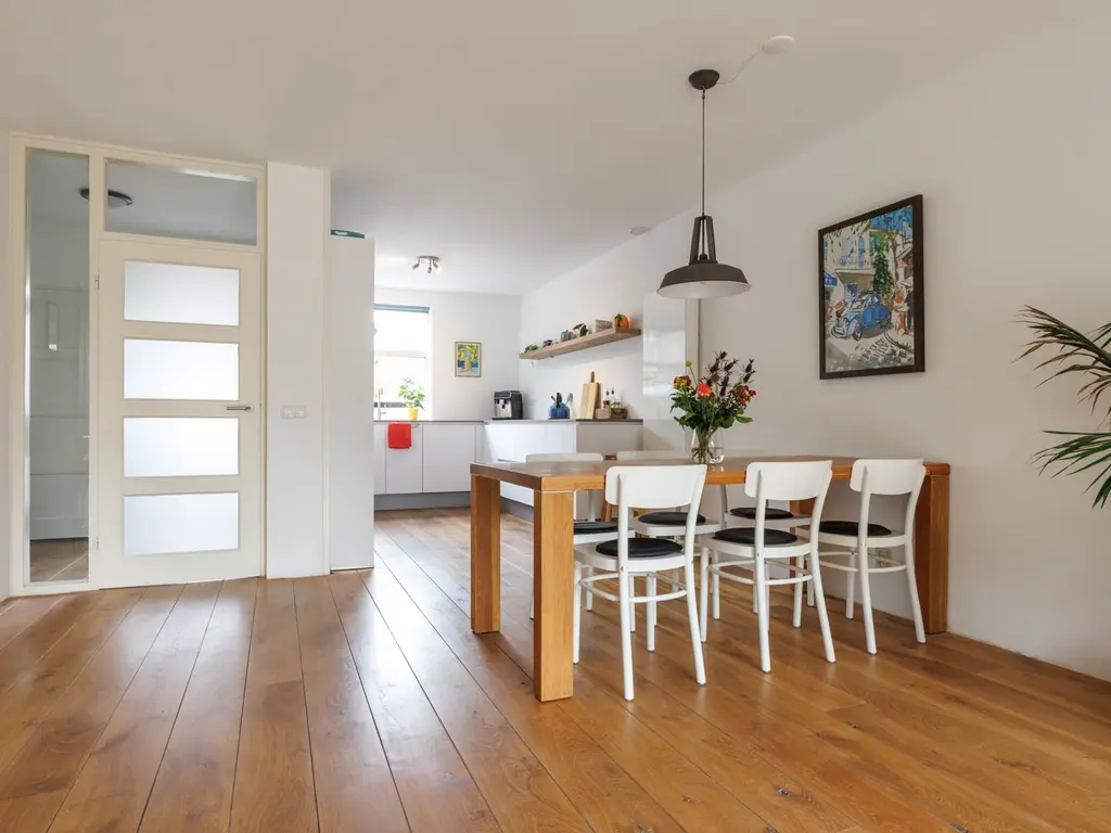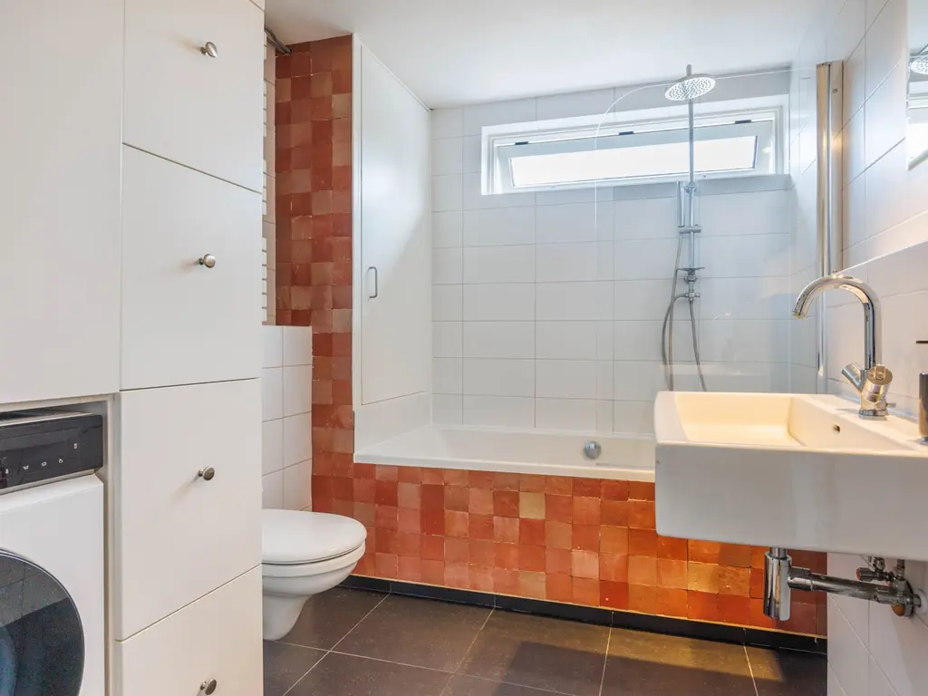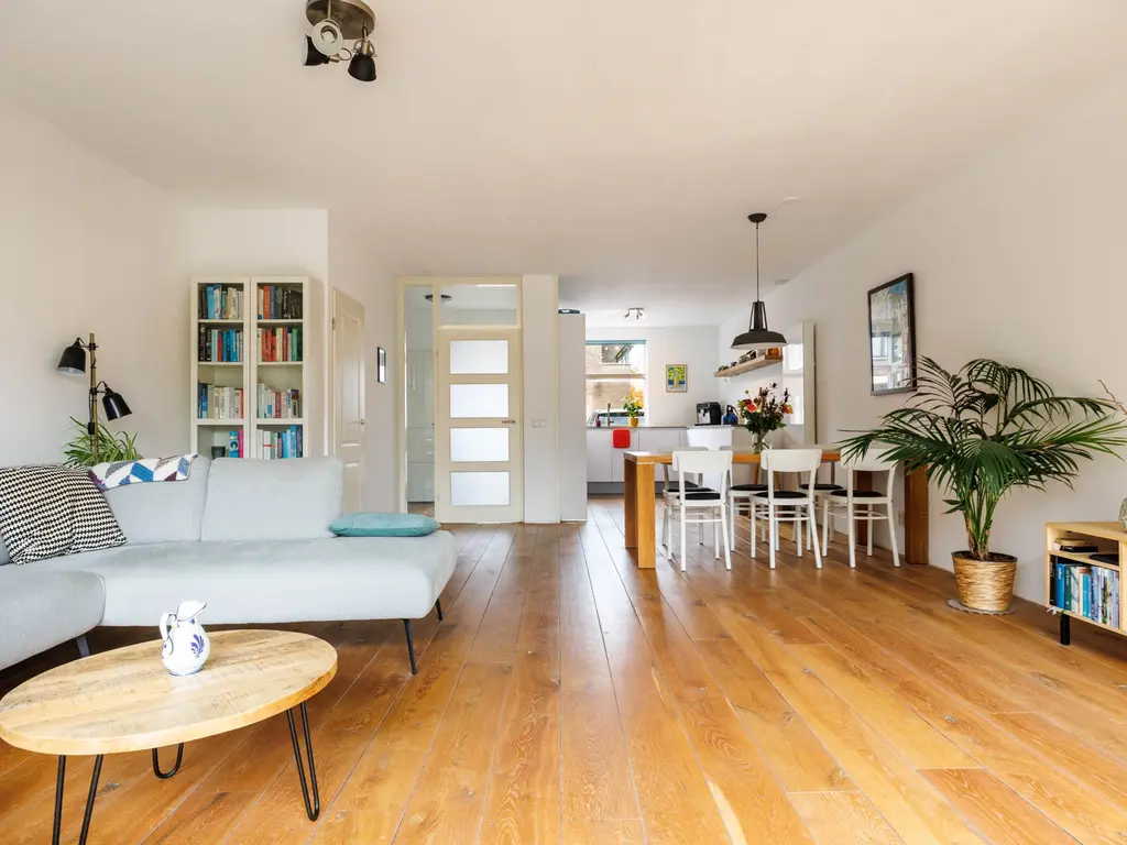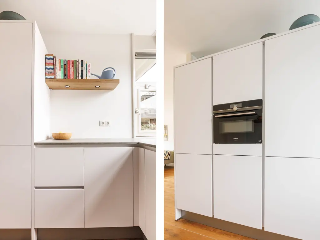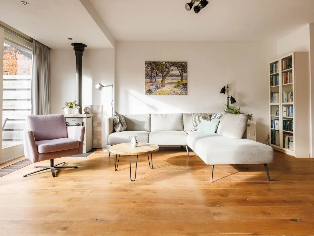 Entrance into a spacious hallway with a toilet and sink, and access to the beautiful extended living room. The floor is finished with solid oak parquet. For both warmth and atmosphere, there is a soapstone wood-burning stove that heats the entire space efficiently. The extension features large sliding doors to the south-facing garden, allowing plenty of natural light to fill the room. The generous and modern kitchen is equipped with a Dekton worktop and various built-in appliances, including an induction hob with integrated extractor, a combination steam oven/microwave, a dishwasher, and a fridge-freezer.