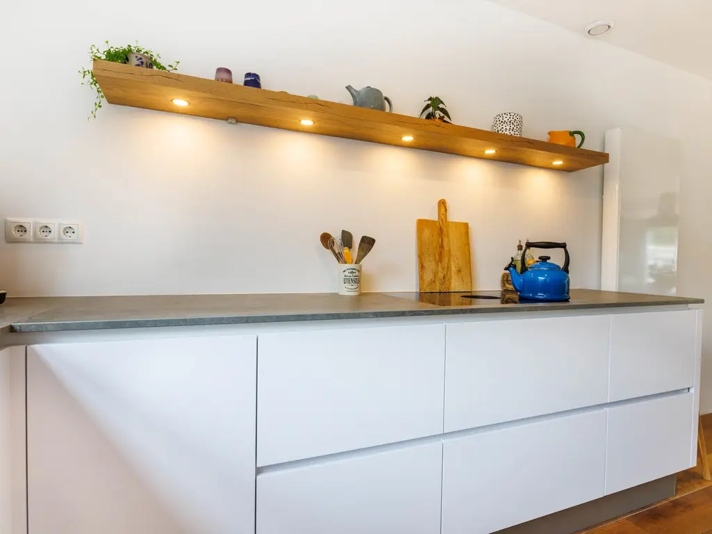 Entree met een royale hal. Hier is een toilet met fonteintje en toegang tot de fraaie uitgebouwde woonkamer. Op de vloer ligt een massief eikenhoutenparket. Voor zowel sfeer als warmte staat er een spekstenen houtkachel, die de hele ruimte goed verwarmt. De uitbouw is voorzien van een grote schuifpui naar de tuin op het zuiden, waardoor de ruimte heerlijk licht en zonnig is. De royale en moderne keuken is uitgerust met een Dekton werkblad en diverse inbouwapparatuur, waaronder een inductiekookplaat met geïntegreerde afzuiging, een combi-stoomoven/magnetron, een vaatwasser en een koel-vriescombinatie.