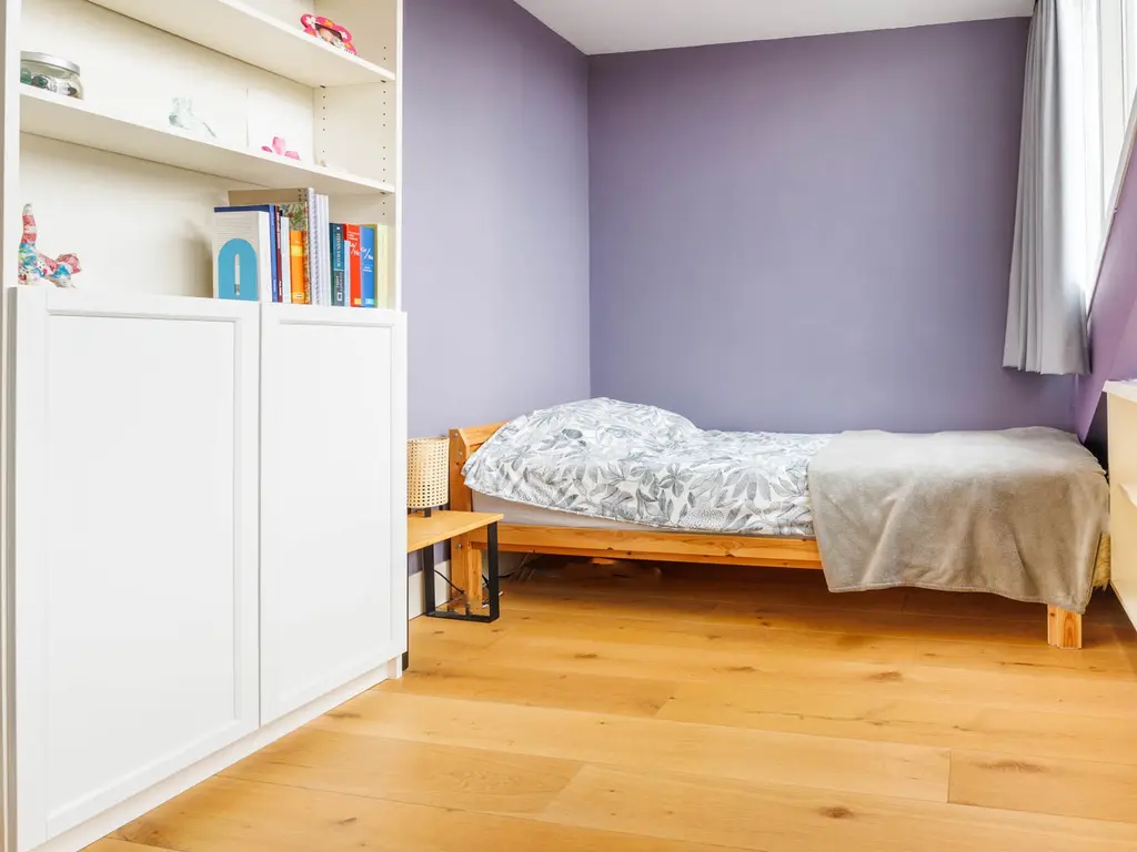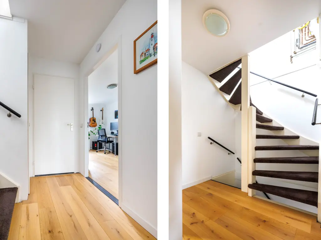 The landing connects two spacious bedrooms (previously three). The combined room is currently used as a walk-in closet. The bathroom features a bathtub, washbasin, second toilet, washer/dryer connection, mechanical ventilation, and generous storage space. The entire floor is finished with oak engineered parquet, giving it a warm and light ambiance.