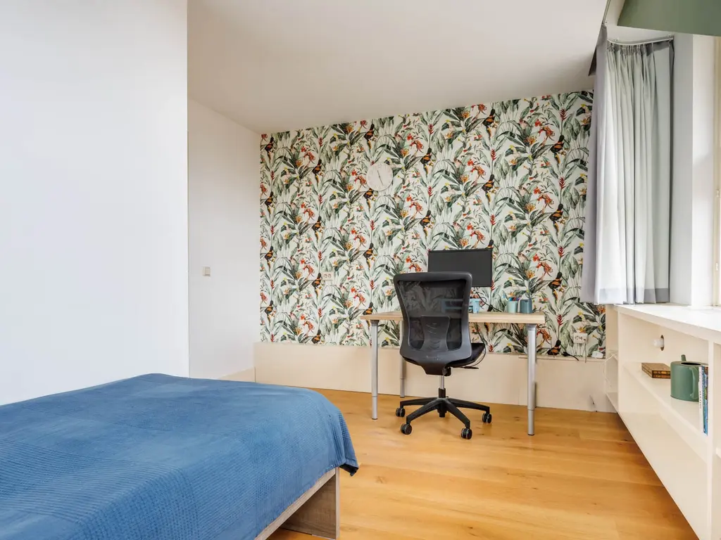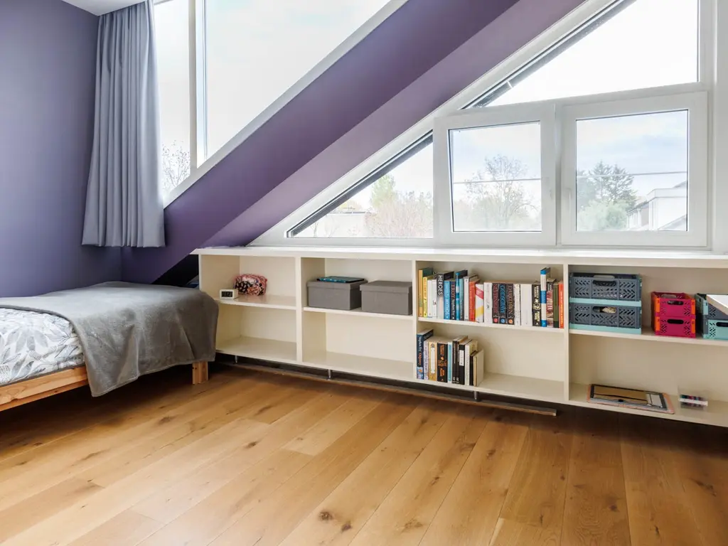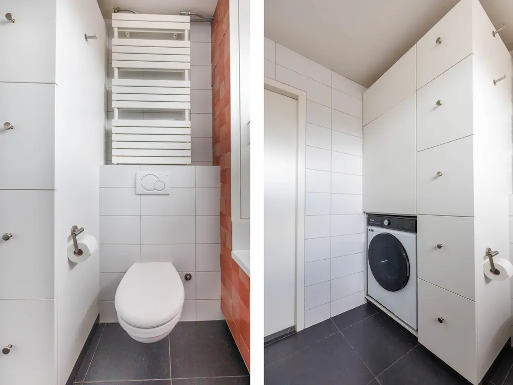 A spacious landing with central heating system, skylight, and access to three rooms and the second large bathroom. This floor features a full-width dormer extension. Both the front and rear rooms are fitted with built-in wardrobes that also serve as radiator covers. The bathroom includes a walk-in shower, washbasin, and third toilet. The same oak engineered parquet continues throughout this floor.