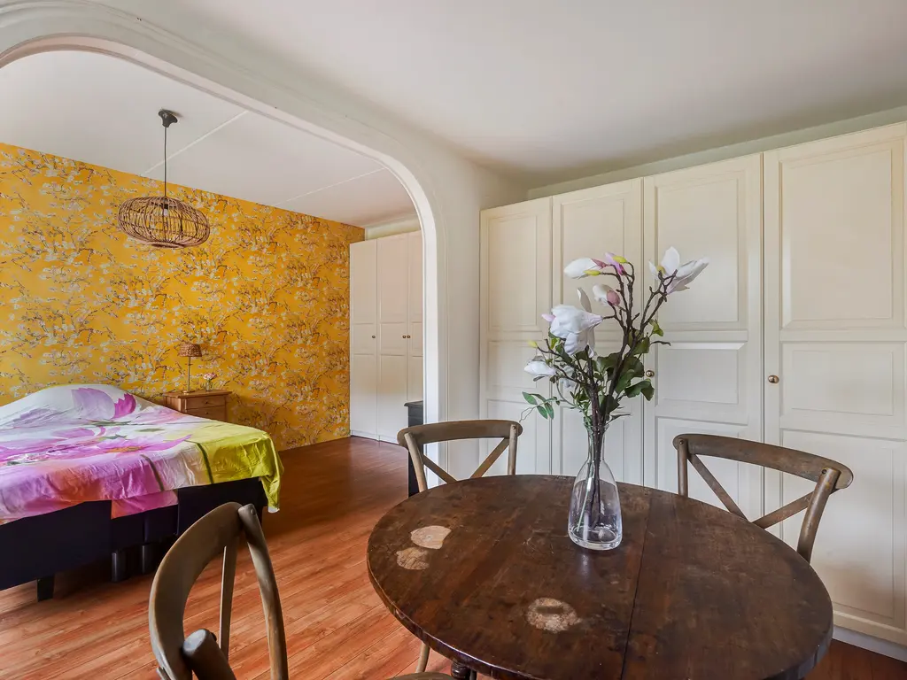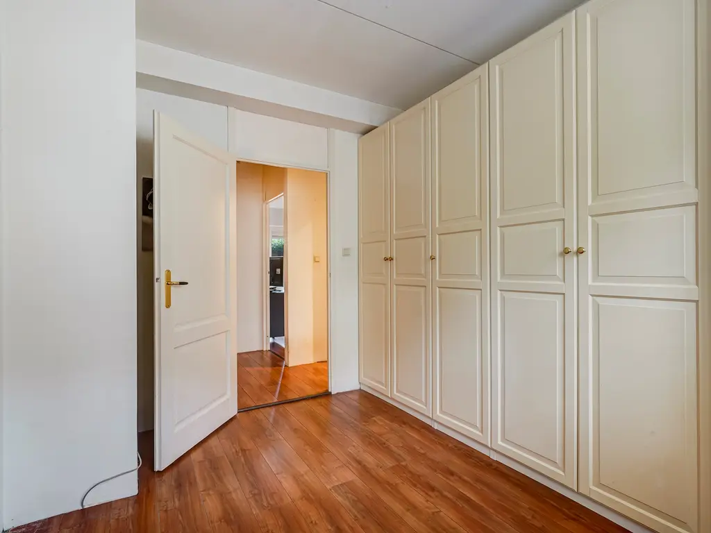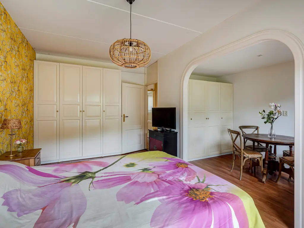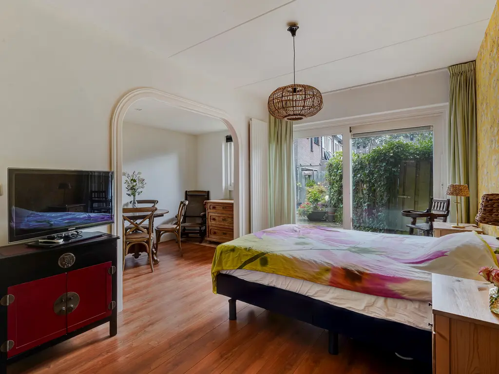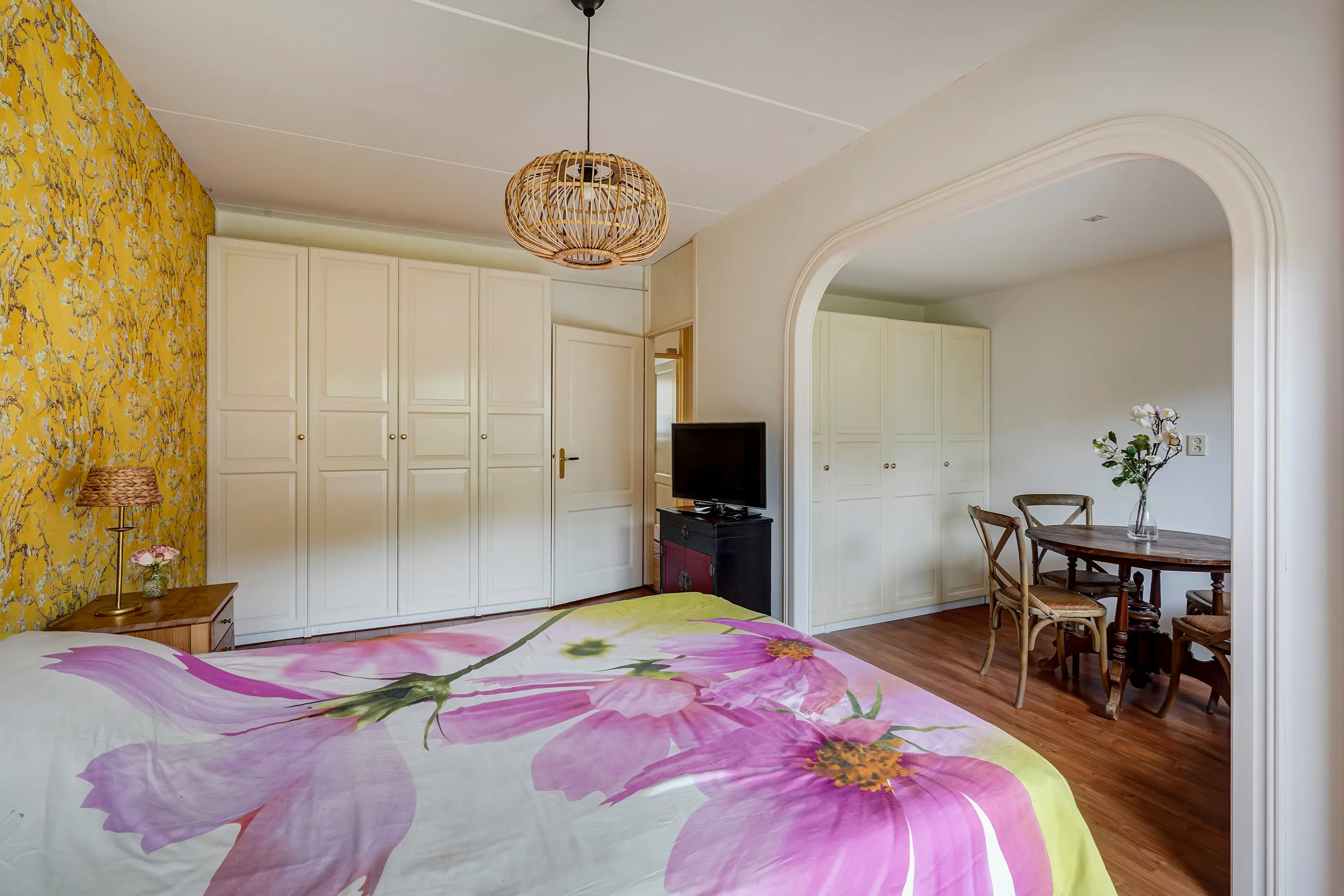 Aan de achterzijde bevindt zich de ouderslaapkamer die een tweede achterkamer bij de slaapkamer heeft betrokken. Ook deze kamer heeft via een schuifpui directe toegang tot de zonnige tuin.