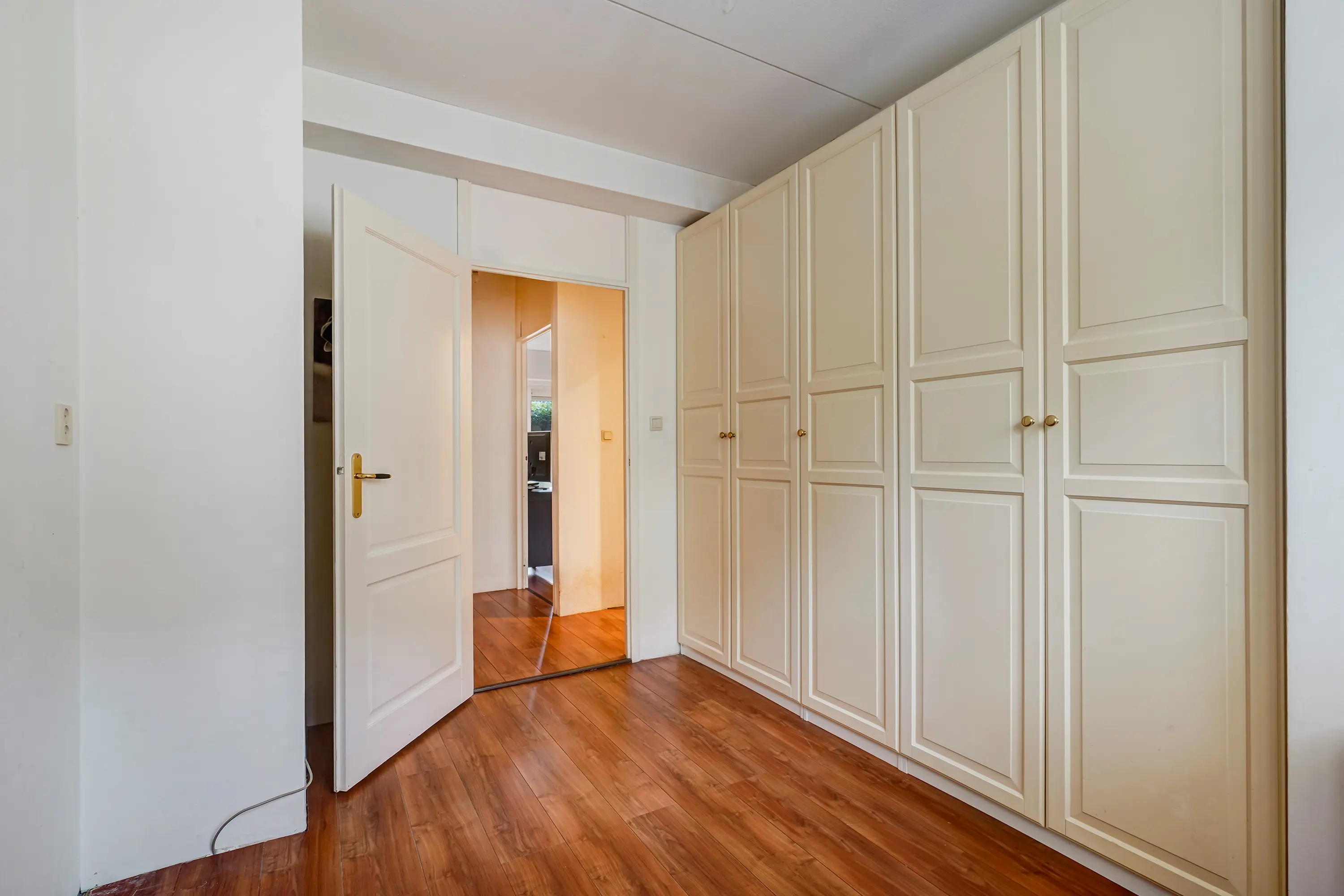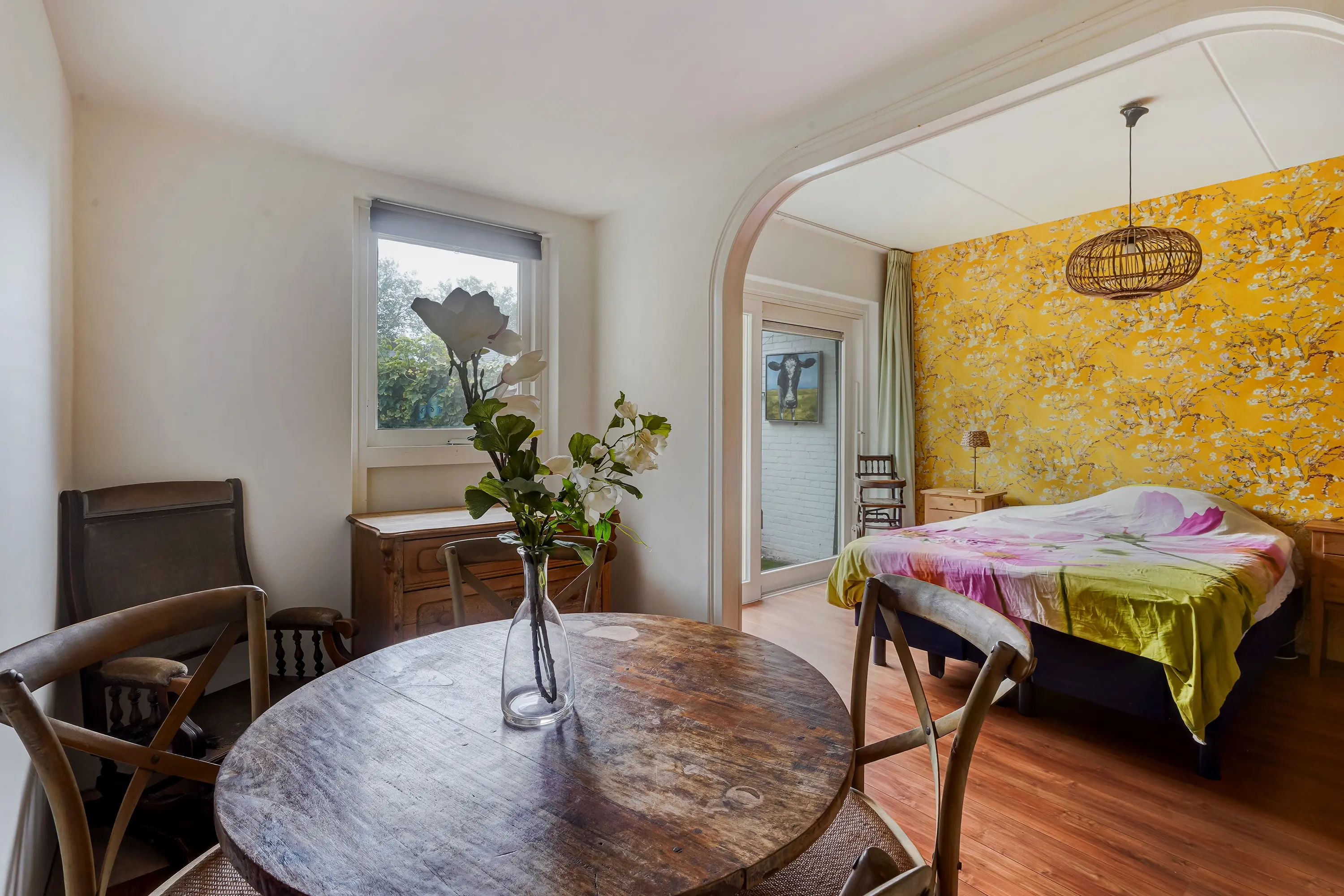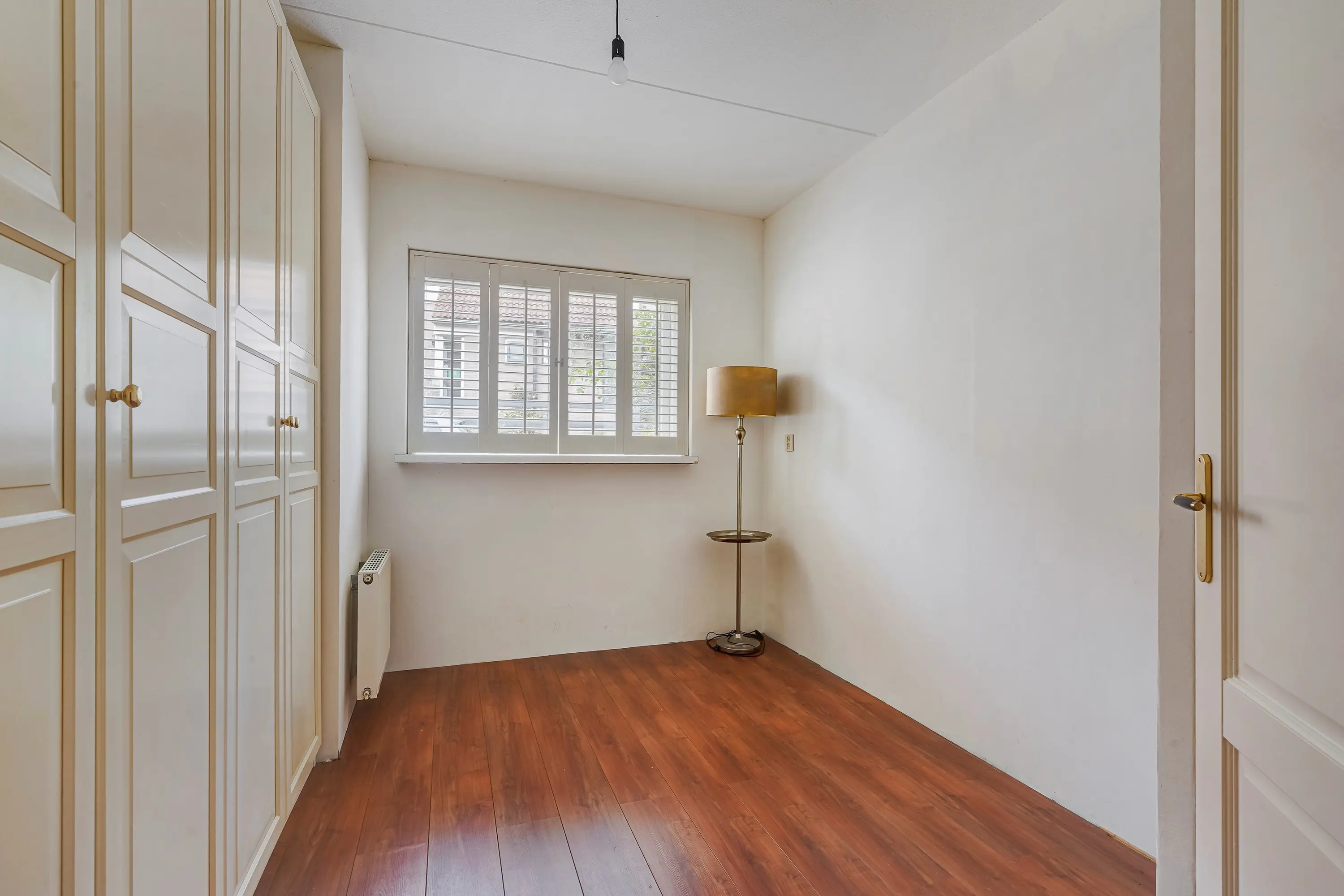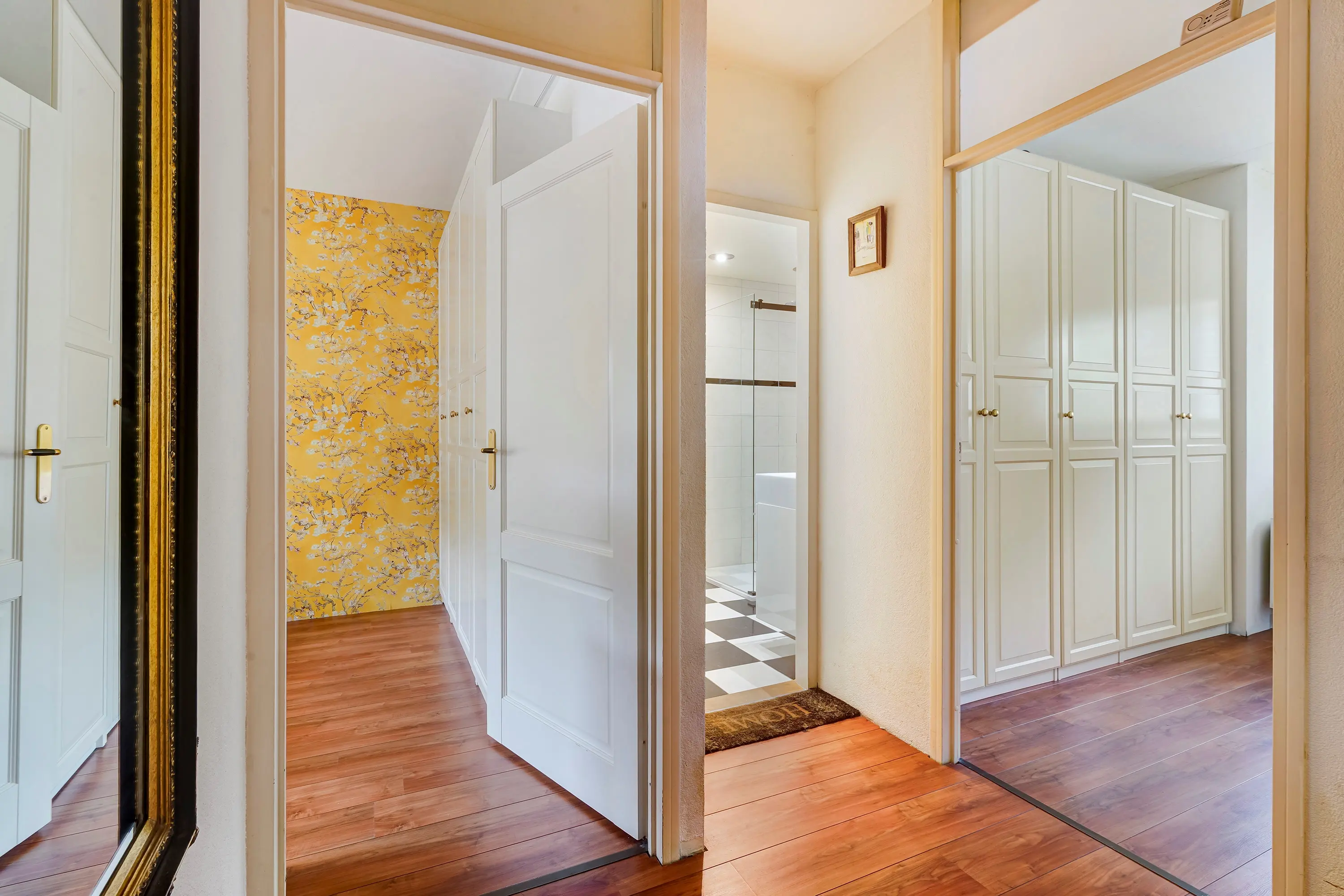 De eerste slaapkamer bevindt zich aan de voorzijde van de woning. Ernaast is een royale badkamer gelegen die beschikt over een ruime inloopdouche (2022), dubbel wastafelmeubel, tweede toilet en handdoekradiator. Aansluitend bevindt zich een extra ruimte met een tweede buitendeur, waar eenvoudig een praktische wasmachine-/drogeropstelling gerealiseerd kan worden, inclusief extra bergruimte en een vliering.