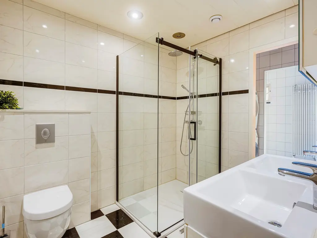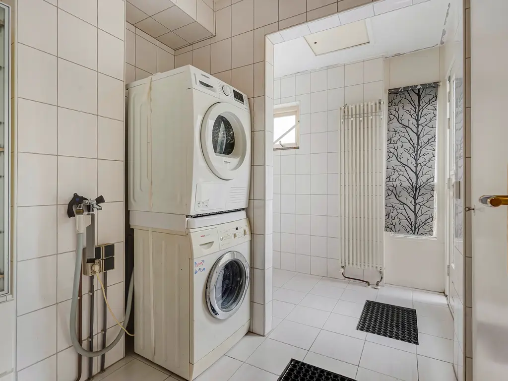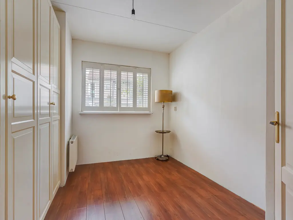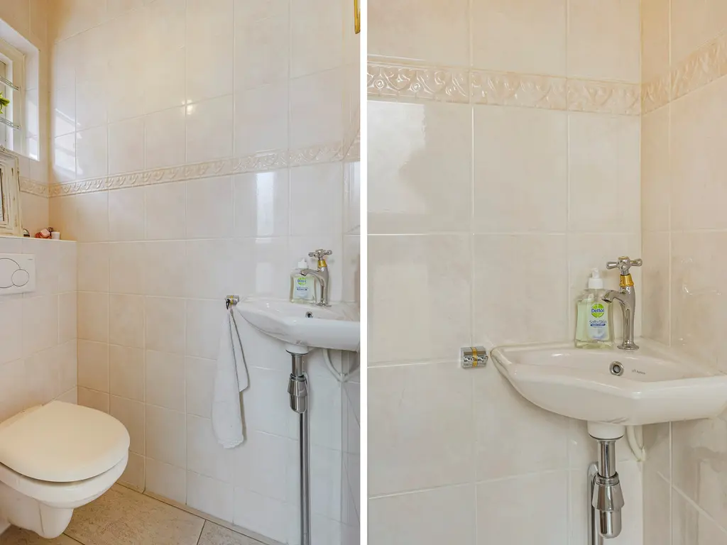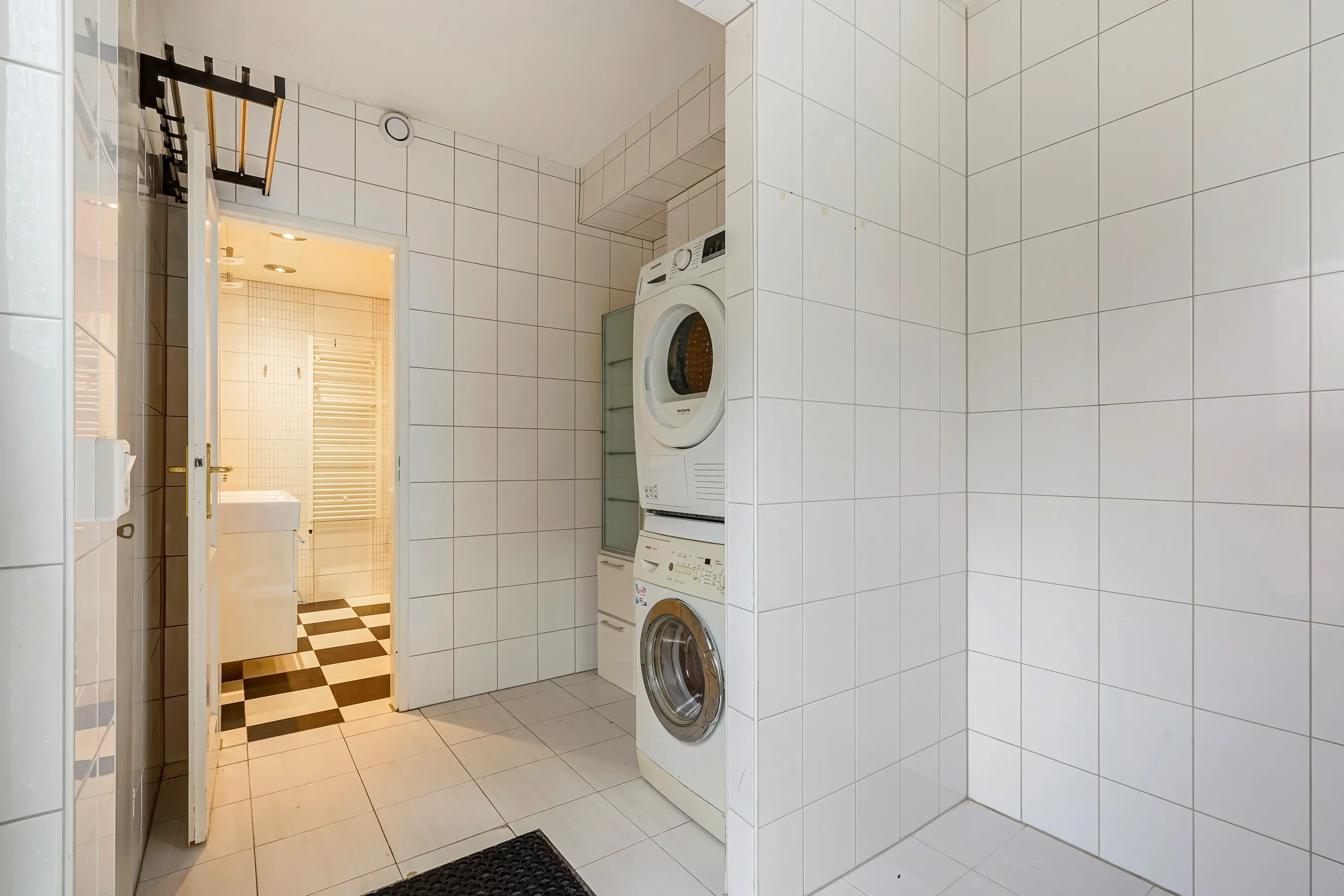 De eerste slaapkamer bevindt zich aan de voorzijde van de woning. Ernaast is een royale badkamer gelegen die beschikt over een ruime inloopdouche (2022), dubbel wastafelmeubel, tweede toilet en handdoekradiator. Aansluitend bevindt zich een extra ruimte met een tweede buitendeur, waar eenvoudig een praktische wasmachine-/drogeropstelling gerealiseerd kan worden, inclusief extra bergruimte en een vliering.