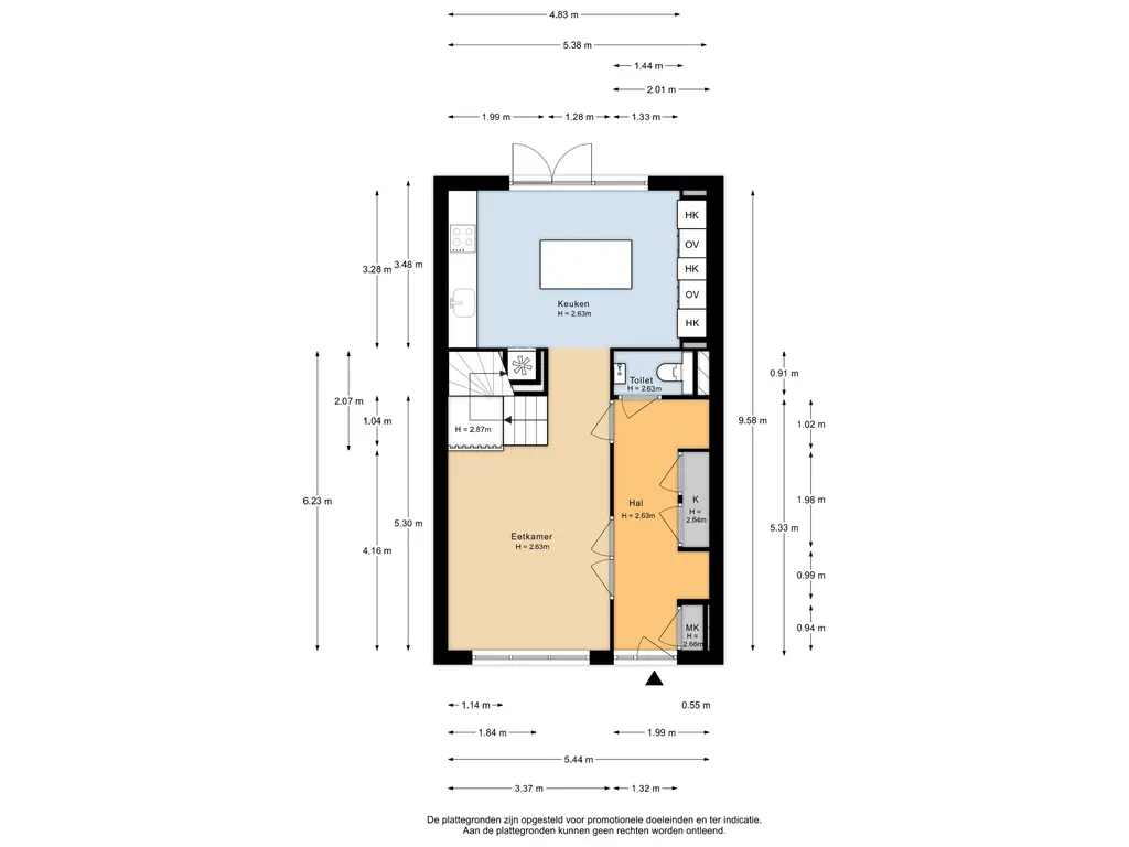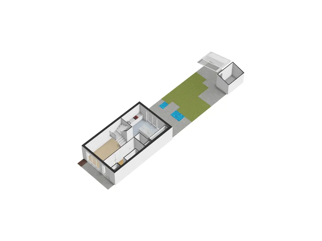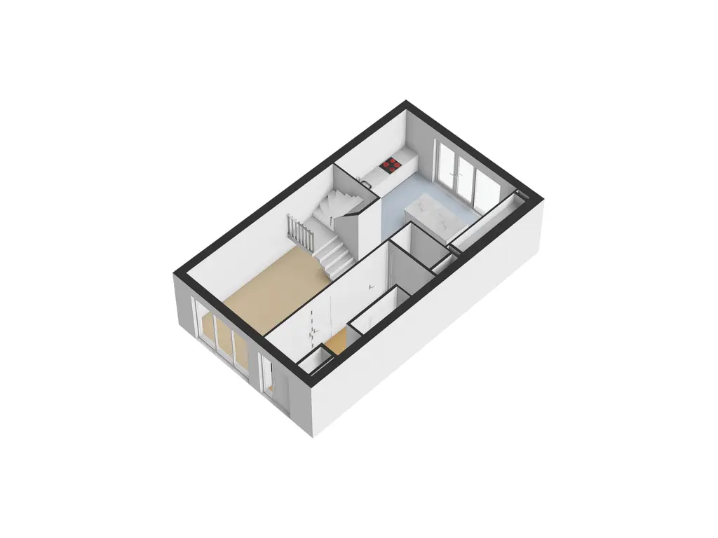 Je komt binnen in de hal met garderobe, meterkast en een toiletruimte. Vanuit hier heb je toegang tot de leefruimte aan de voorzijde en de keuken aan de achterzijde. De keuken is halfopen en voorzien van inbouwapparatuur en een een eiland. De grote raampartijen aan de achterzijde laten veel licht binnen en bieden direct toegang tot de achtertuin.