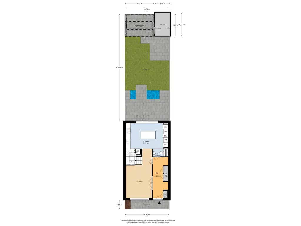 De achtertuin is opvallend diep en praktisch ingericht, met een ruim terras, een groen gedeelte en een overkapping. Achterin bevindt zich een berging. De tuin biedt volop privacy en is een heerlijke plek om te ontspannen of gezellig buiten te zitten.
