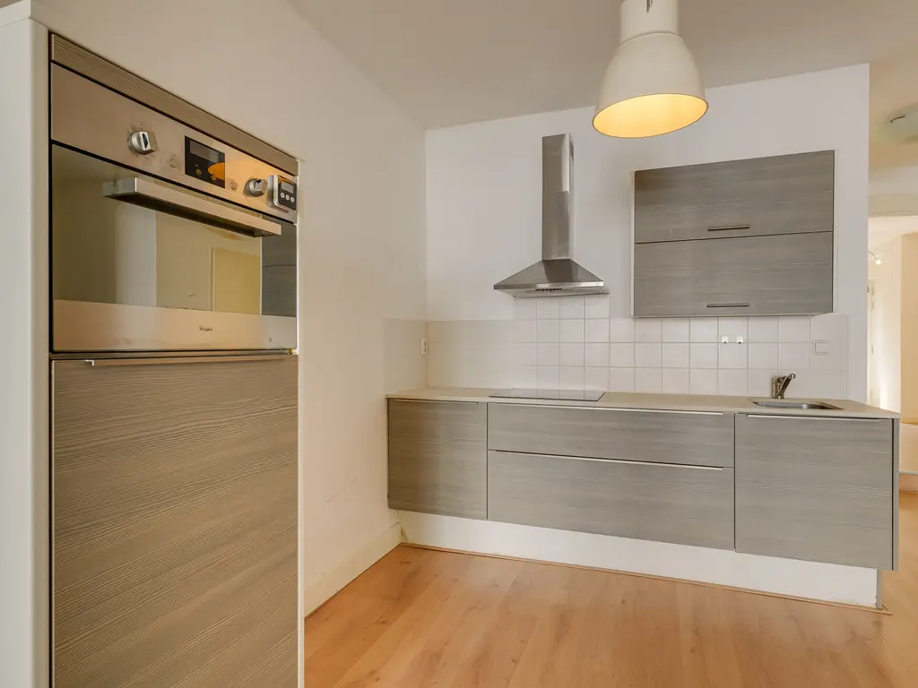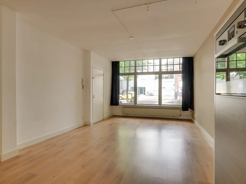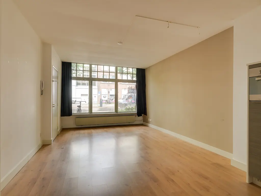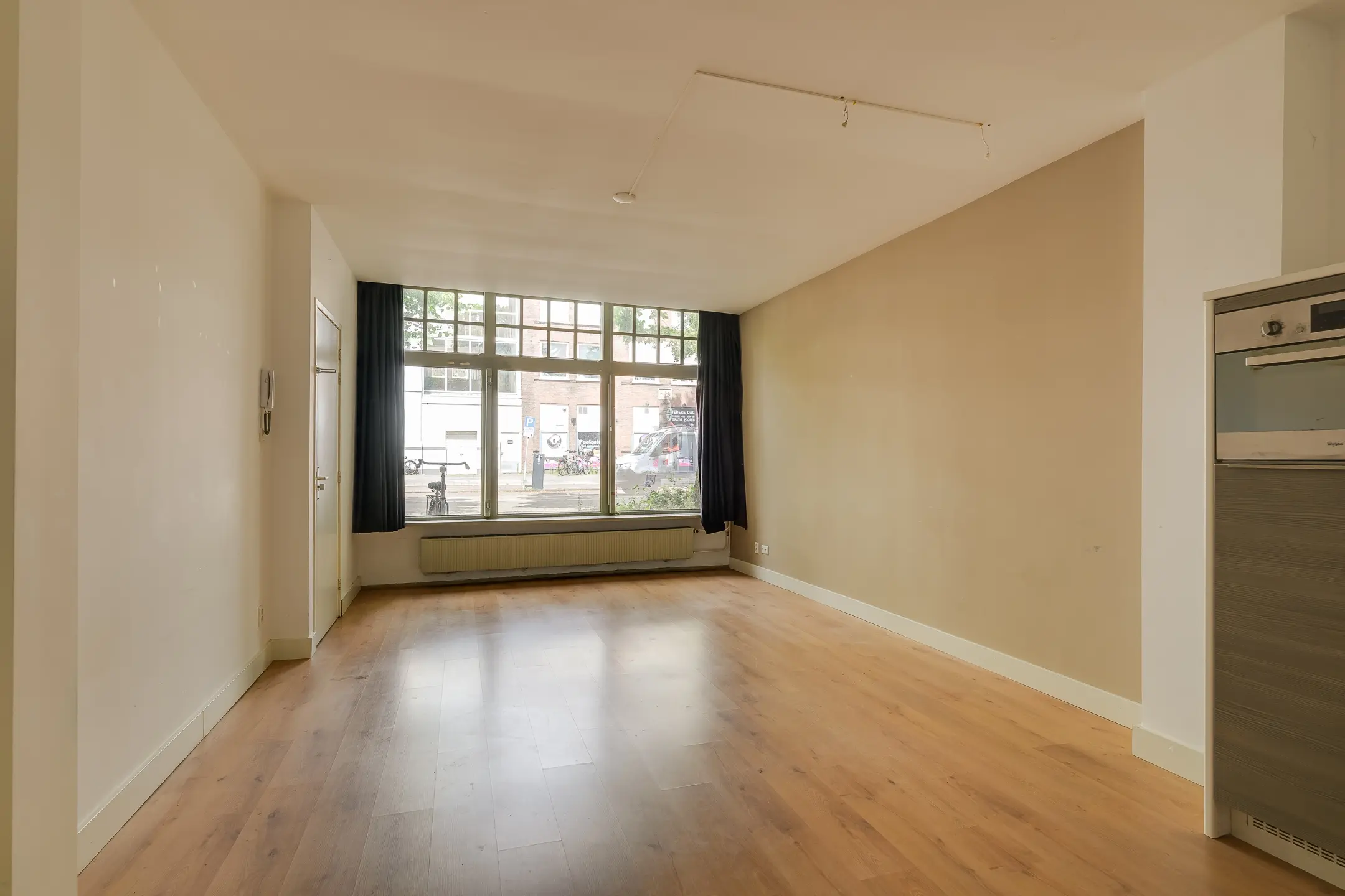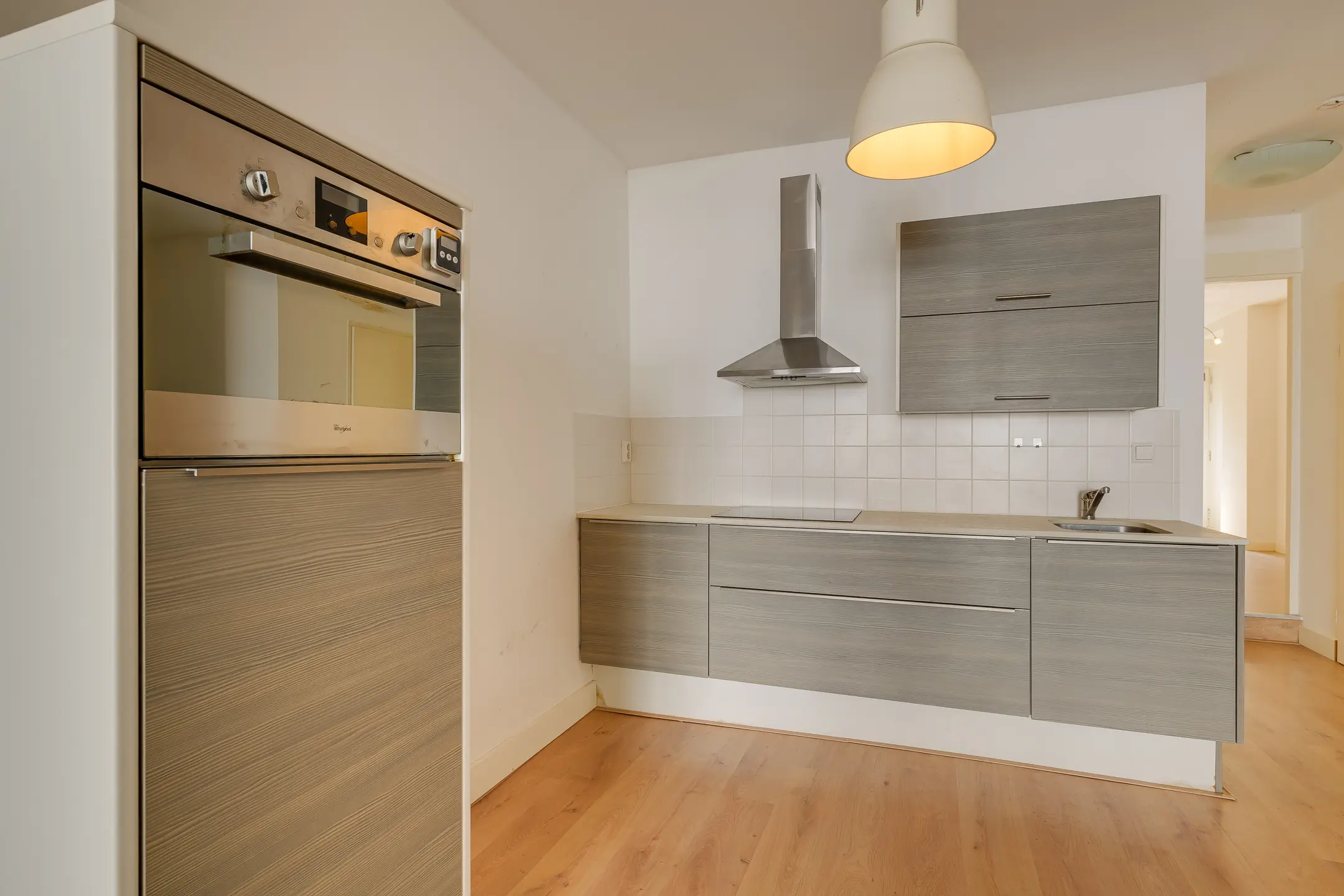 De woning betreed je via de voordeur aan de straatzijde. Je komt binnen in een lichte woonkamer met hoge plafonds (3,65 m!) en grote ramen aan de voorzijde. De open keuken is modern uitgevoerd, voorzien van inbouwapparatuur zoals een oven, inductiekookplaat, afzuigkap en spoelbak.