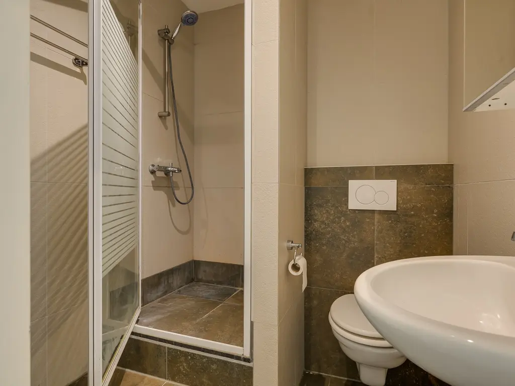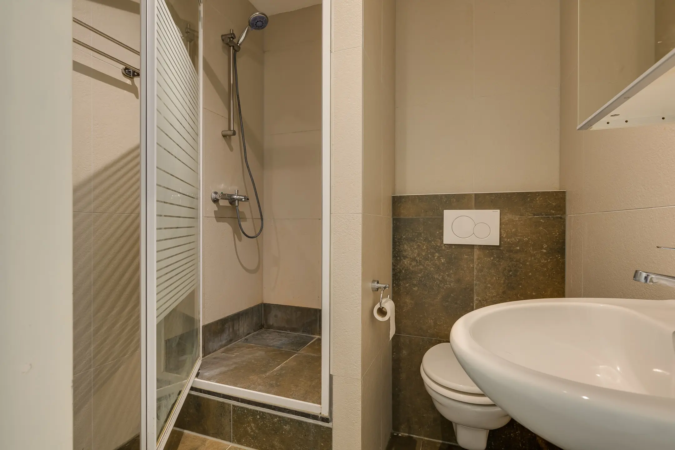 De badkamer ligt centraal tussen de woonkamer en de slaapkamers, en is voorzien van een douche, toilet en wastafel.