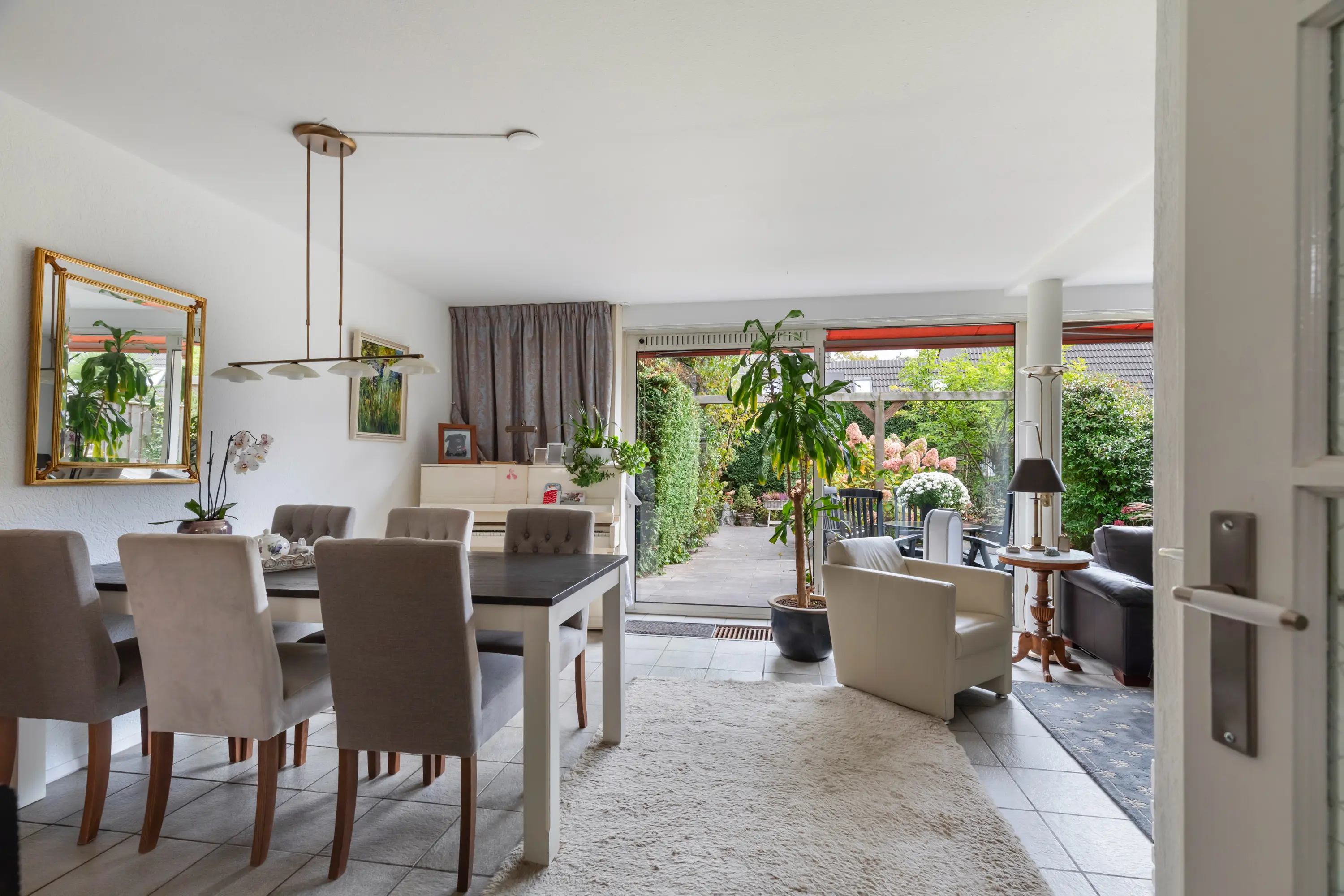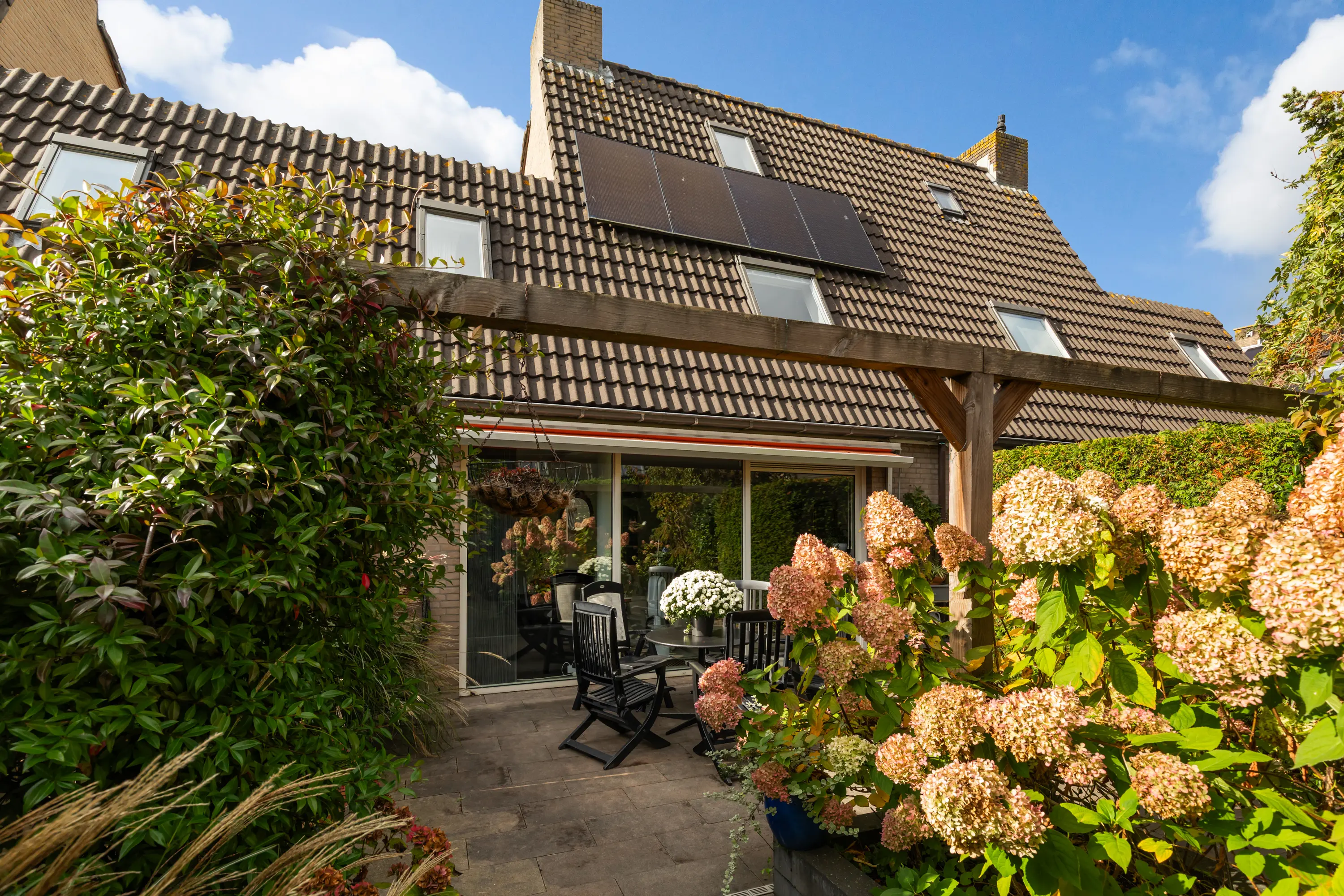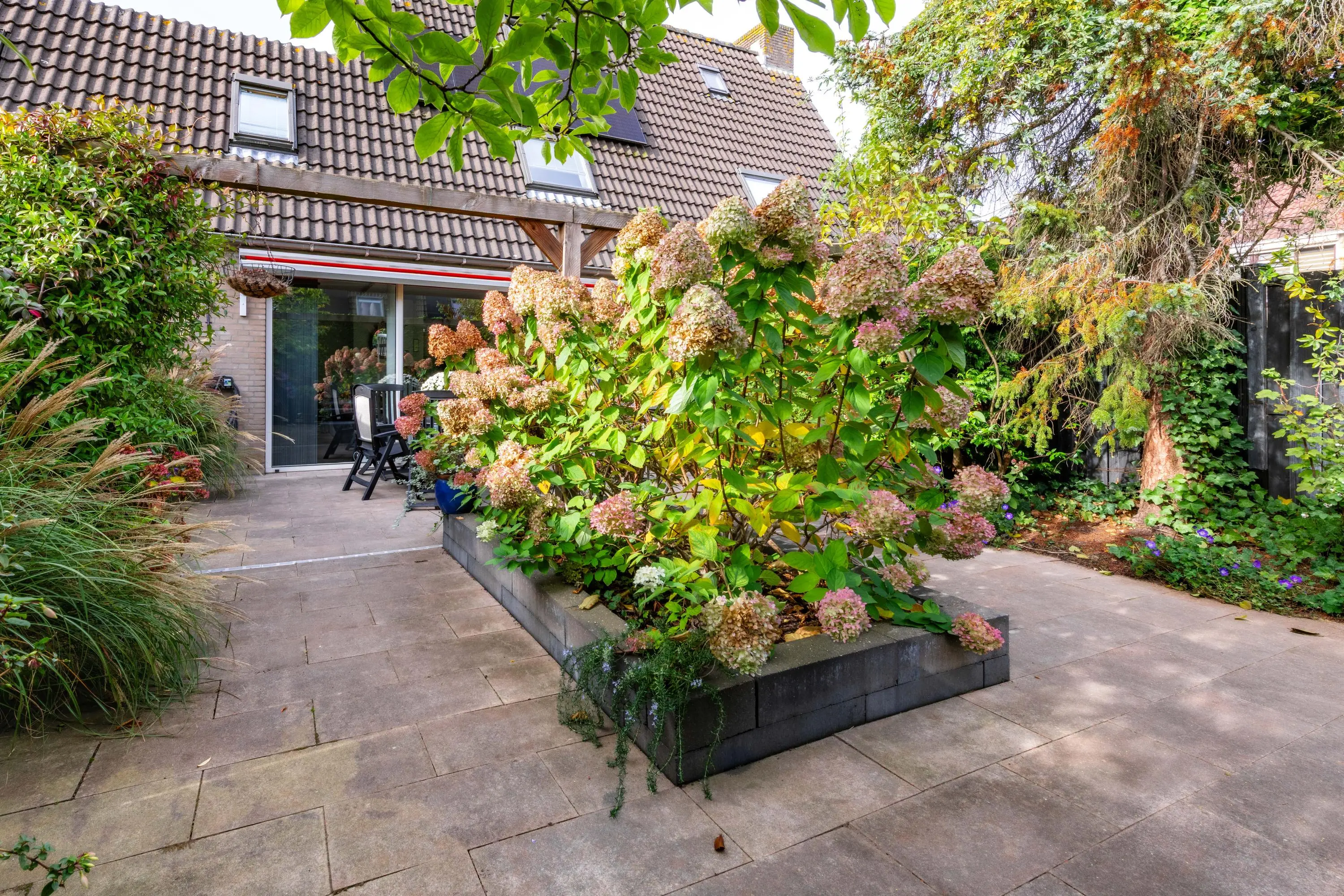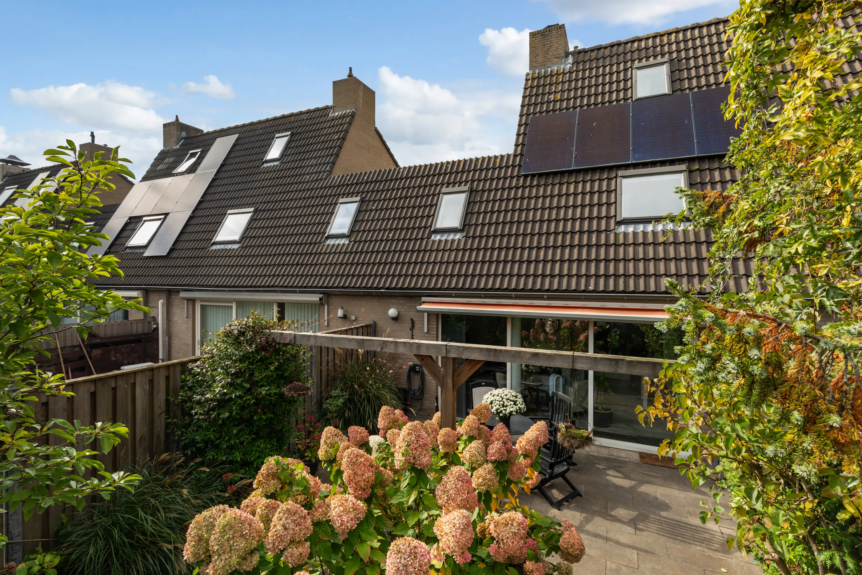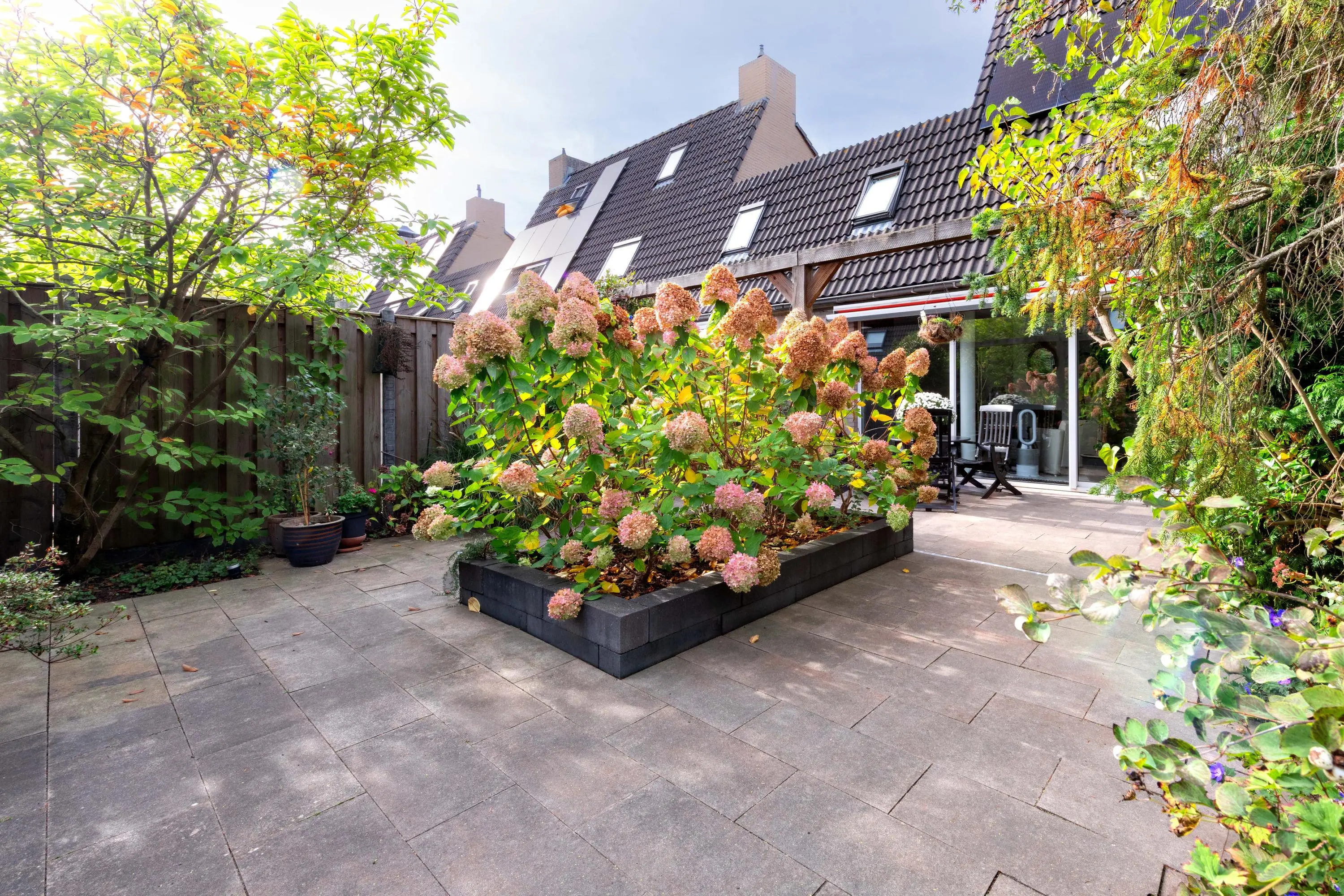 De fraai aangelegde achtertuin ligt op het zuidoosten en biedt volop privacy. Dankzij de zonwering kun je hier het hele seizoen genieten van de zon.
