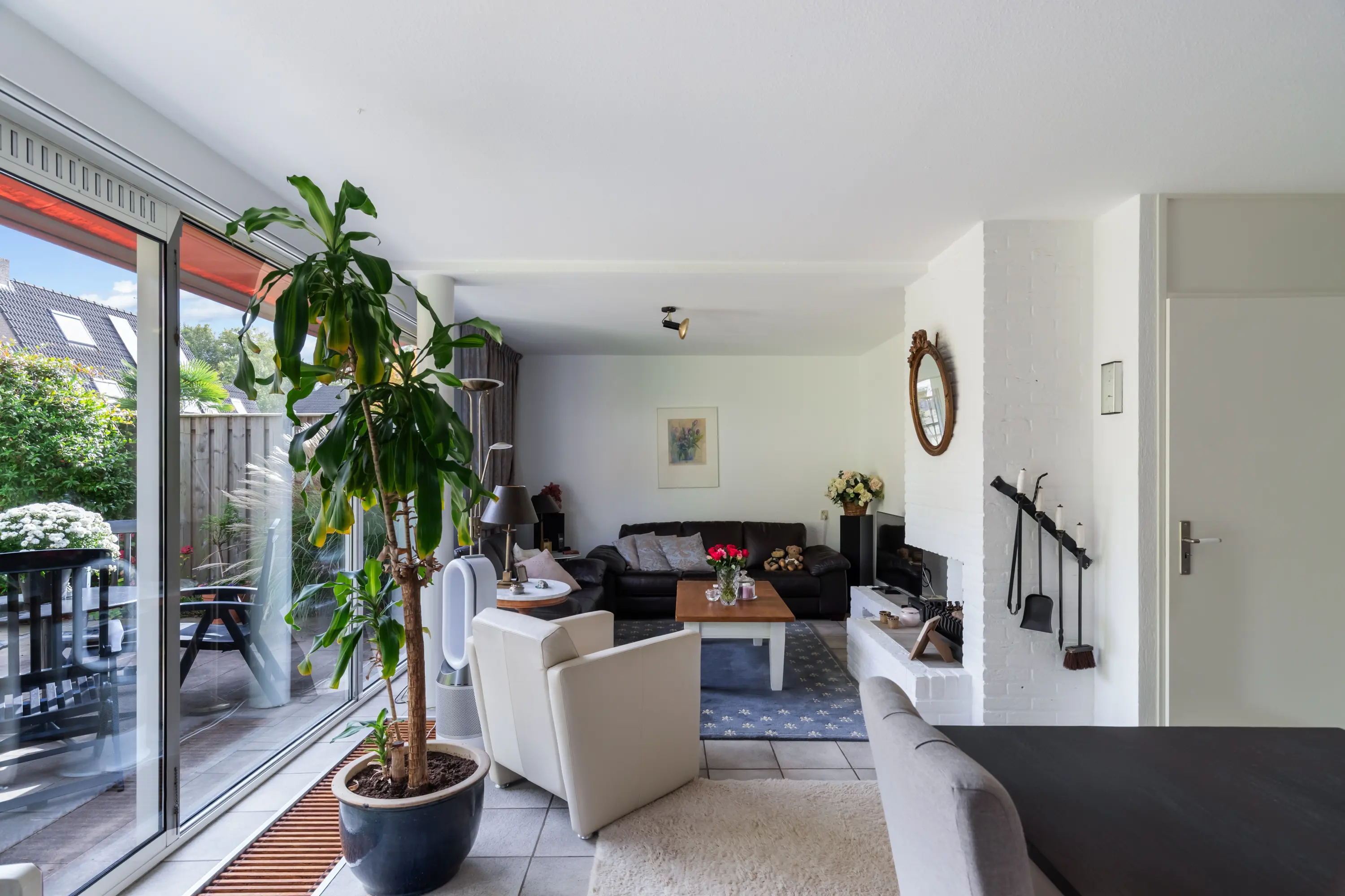 Via de verzorgde voortuin kom je binnen in de hal met toilet en trapopgang naar de verdieping. De woonkamer is opvallend licht dankzij de grote glazen pui aan de achterzijde. De vloerverwarming zorgt voor een aangenaam wooncomfort en de open haard geeft de zithoek extra sfeer. De open keuken is voorzien van recent geplaatste inbouwapparatuur van Siemens (2021: oven, afzuigkap en inductiekookplaat). Vanuit de woonkamer stap je zo de zonnige tuin in. Daarnaast beschikt de woning over een ruime garage van ca. 18 m² — ideaal voor een auto, hobbyruimte of om bij de woning te betrekken.