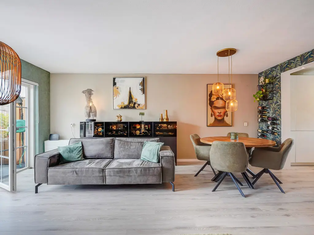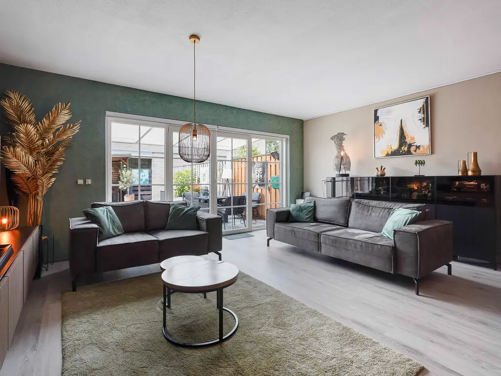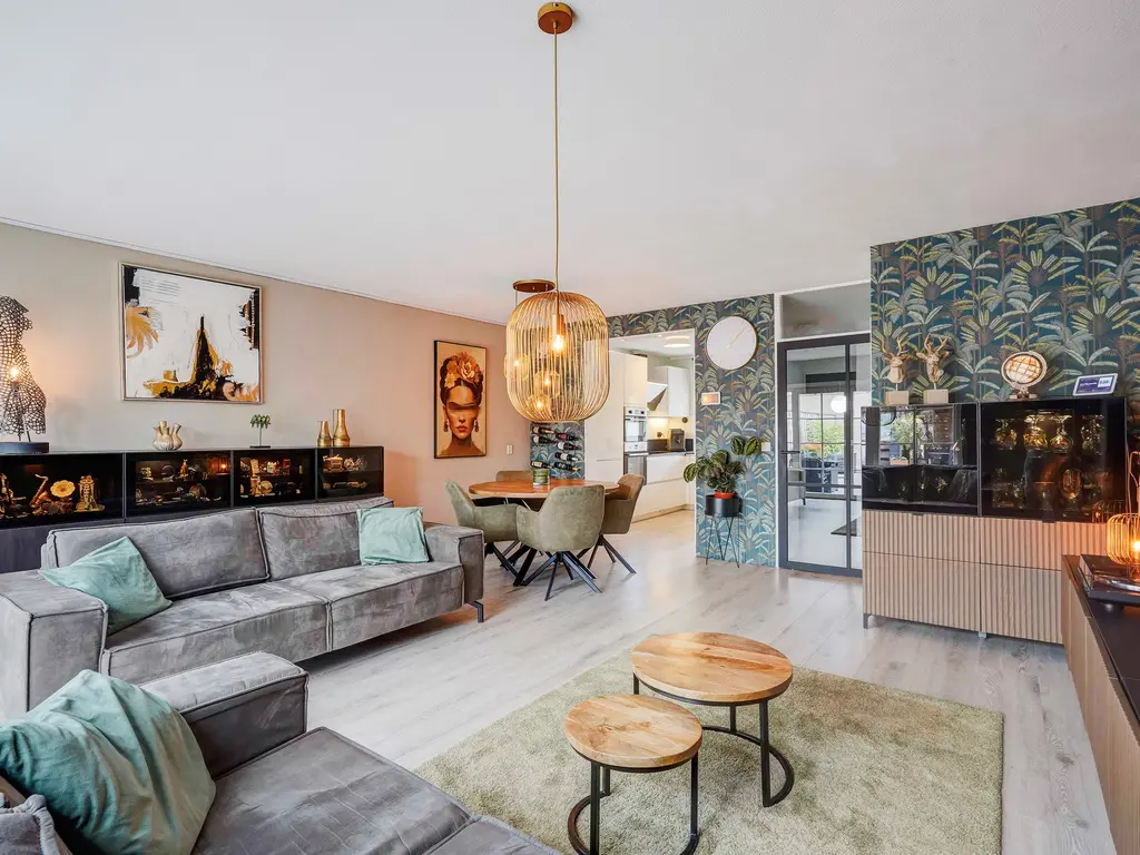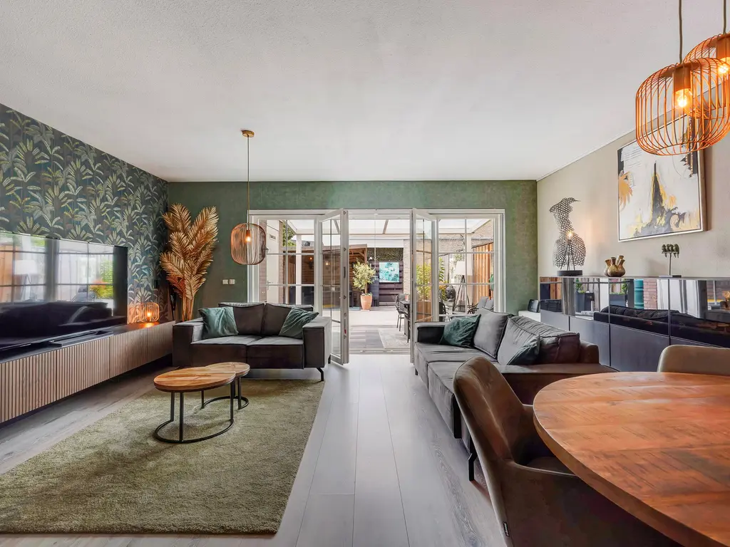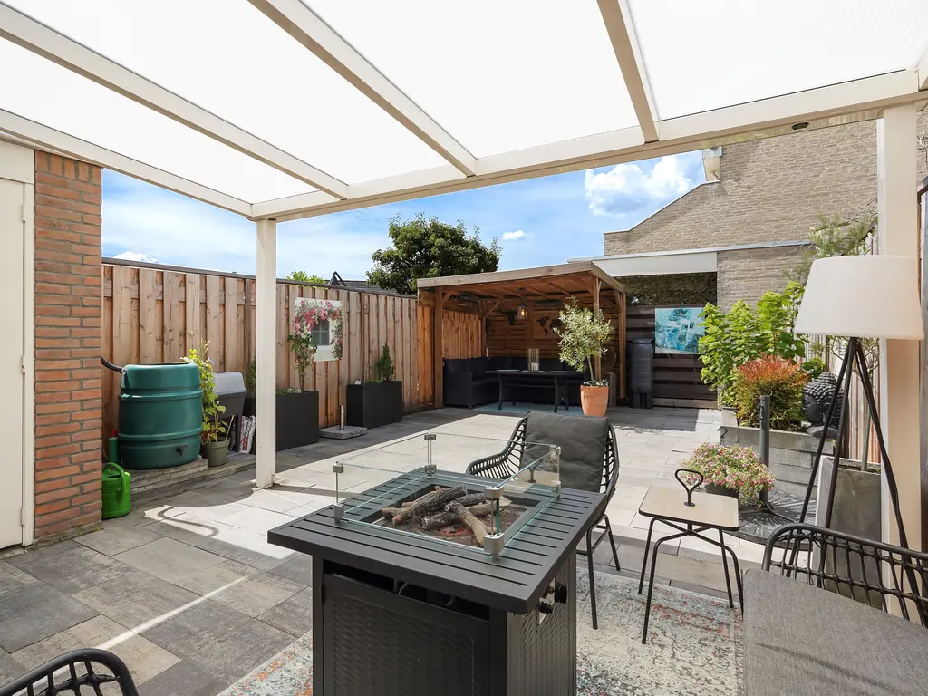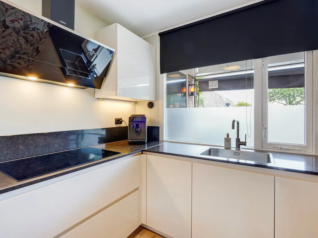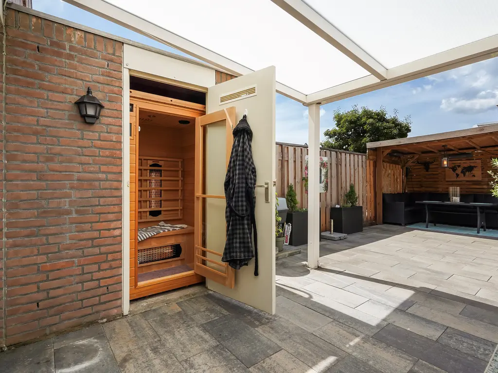 Middels voortuin (v.v. kleine opbergkast) toegang tot de woning, ruime hal v.v. modern toilet met fontein, meterkast en berging aan de voorzijde alwaar opstelplaats wasmachine-/droger en omvormer zonnepanelen. Vanuit de hal toegang tot de heerlijk en zeer goed verzorgde woonkamer met trapkast en open keuken. Vanuit de woonkamer toegang tot de zeer zonnige achtertuin met open serre (2013) , veranda (2021) en berging met sauna. De keuken is recent geplaats en v.v. inductie kookplaat, combi oven, gewone oven, koel-/vriescombinatie en vaatwasser.